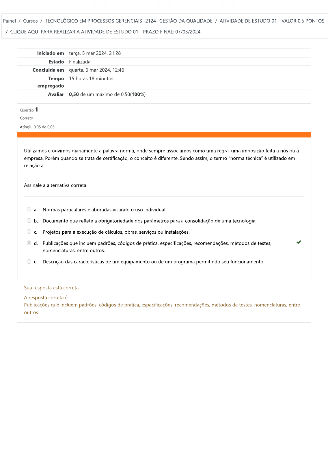 <p>Painel / Cursos / TECNOLÓGICO EM PROCESSOS GERENCIAIS -2124- GESTÃO DA QUALIDADE / ATIVIDADE DE ESTUDO 01 VALOR 0,5 PONTOS / CLIQUE AQUI PARA REALIZAR A ATIVIDADE DE ESTUDO 01 PRAZO FINAL: 07/03/2024 Iniciado em terça, 5 mar 2024, 21:28 Estado Finalizada Concluída em quarta, 6 mar 2024, 12:46 Tempo 15 horas 18 minutos empregado Avaliar 0,50 de um máximo de 0,50(100%) Questão 1 Correto Atingiu 0,05 de 0,05 Utilizamos e ouvimos diariamente a palavra norma, onde sempre associamos como uma regra, uma imposição feita a nós ou à empresa. Porém quando se trata de certificação, o conceito é diferente. Sendo assim, o termo "norma técnica" é utilizado em relação a: Assinale a alternativa correta: a. Normas particulares elaboradas visando o uso individual. b. Documento que reflete a obrigatoriedade dos parâmetros para a consolidação de uma tecnologia. C. Projetos para a execução de cálculos, obras, serviços ou instalações. d. Publicações que incluem padrões, códigos de prática, especificações, recomendações, métodos de testes, nomenclaturas, entre outros. e. Descrição das características de um equipamento ou de um programa permitindo seu funcionamento. Sua resposta está correta. A resposta correta é: Publicações que incluem padrões, códigos de prática, especificações, recomendações, métodos de testes, nomenclaturas, entre outros.</p><p>Questão 2 Correto Atingiu 0,05 de 0,05 Os desperdícios assumem diferentes formas, porém, mencionar e quantificar desperdícios não é tarefa fácil durante o processamento de um produto. São os principais pontos de desperdícios em uma empresa: Assinale a alternativa correta. a. Auditorias, inspeções e logística. b. Revisão de maquinários, tempo de espera e transporte. C. Auditorias, matéria prima, prevenção. d. Matéria prima, salários e prevenção. e. Matéria prima, tempo de espera e transporte. Sua resposta está correta. A resposta correta é: Matéria prima, tempo de espera e transporte. Questão 3 Correto Atingiu 0,05 de 0,05 As normas têm uma contribuição enorme e positiva para a maioria dos aspectos de nossas vidas. Quando elas estão ausentes, logo notamos. São inúmeros os benefícios trazidos pela normalização para a sociedade, mesmo que ela não se dê conta disso. Os benefícios podem ser quantitativos e qualitativos. São considerados benefícios quantitativos trazidos pela normalização, com exceção: a. Maior consumo de matéria-prima para aumentar a lucratividade. b. Redução do consumo de materiais. C. Aumento da produtividade. d. Redução de desperdícios. e. Padronização de métodos e procedimentos. Sua resposta está correta. A resposta correta é: Maior consumo de matéria-prima para aumentar a lucratividade.</p><p>Questão 4 Correto Atingiu 0,05 de 0,05 Sabe-se que o processo de normalização, trata de uma atividade coletiva que tem como objetivo desenvolvimento e aplicação de normas. Suponha que uma empresa que queira saber sobre os processos normativos no Brasil, ela deve se dirigir a qual órgão de normalização técnica? Assinale a alternativa correta: a. CREA. b. ABNT. C. ISO. d. ABRT. e. ITU. Sua resposta está correta. A resposta correta é: ABNT. Questão 5 Correto Atingiu 0,05 de 0,05 Baseado no princípio de Taylor, ocorreu a formação da era da Inspeção da qualidade, onde 100% da produção era avaliada bem como, a aplicação de metas a serem atingidas. Quanto ao controle de qualidade, o foco era voltado aos produtos acabados, mas Taylor tinha uma visão muito superior a essa e seu objetivo era: Assinale a alternativa correta. a. Inspecionar apenas o produto finalizado. b. Inspecionar a matéria prima e consequentemente o produto final já estaria dentro dos padrões adotados. C. Aumentar a produção, sem se preocupar com a qualidade do produto. d. Controlar apenas o ponto inicial e final do processo. e. Controlar todo o processo industrial, bem como incluir o projeto inicial do produto. Sua resposta está correta. A resposta correta é: Controlar todo o processo industrial, bem como incluir projeto inicial do produto.</p><p>Questão 6 Correto Atingiu 0,05 de 0,05 Como se sabe, as empresas não podem errar no quesito qualidade, especialmente quando nos deparamos em um mercado dinâmico, como é o mercado brasileiro e mundial. Assim, os custos da qualidade devem envolver todos os setores produtivos, em busca de unidades com defeitos e com desperdícios para enxugar os altos custos de produção. Sendo assim: Assinale a alternativa correta. a. As peças defeituosas não devem seguir para comercialização. Devem ser descartadas em aterro, mesmo tendo a possibilidade de reciclá-las na produção e como consequência o prejuízo para a empresa é certo. b. As peças defeituosas não devem seguir para comercialização, pois, os seus padrões de identidade e qualidade foram reprovados e observados ainda no processo produtivo. Devem seguir para a desmontagem e reciclagem. C. As peças defeituosas podem ser comercializadas desde que o consumidor saiba dos defeitos e arque com os prejuízos de adquiri-la. d. As peças defeituosas ou fora do padrão podem ser comercializadas desde que o defeito não seja perceptível pelo consumidor. e. As peças defeituosas podem ser comercializadas pois não causam prejuízos ao consumidor que muitas vezes nem percebe a falta de qualidade da mesma. Sua resposta está correta. A resposta correta é: As peças defeituosas não devem seguir para comercialização, pois, os seus padrões de identidade e qualidade foram reprovados e observados ainda no processo produtivo. Devem seguir para a desmontagem e reciclagem.</p><p>Questão 7 Correto Atingiu 0,05 de 0,05 A Associação Brasileira de Normas Técnicas é o órgão responsável pela normalização técnica no Brasil, fornecendo insumos ao desenvolvimento tecnológico brasileiro. Segundo a ABNT, as normas são divididas em níveis, de acordo com sua abrangência, em