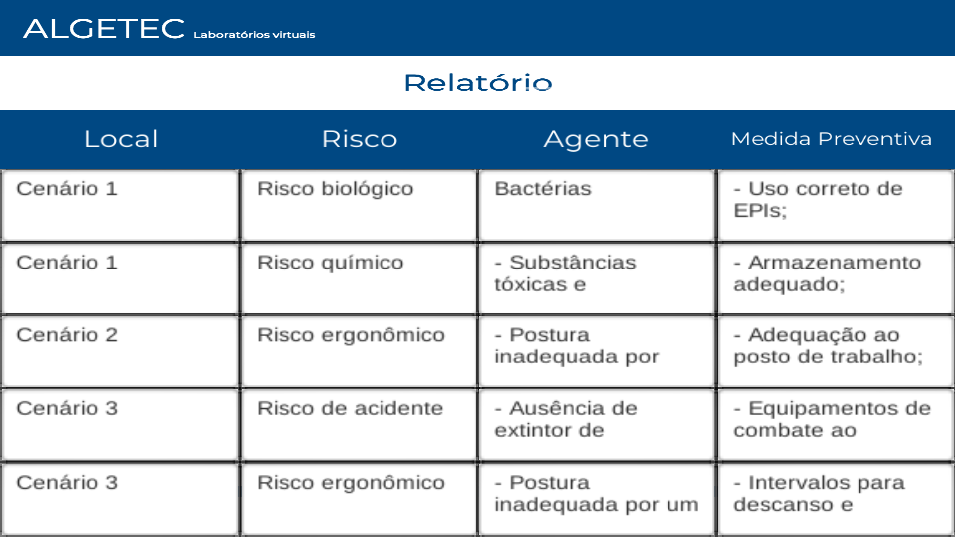<p>ALGETEC Laboratórios virtuais Relatório Local Risco Agente Medida Preventiva Cenário 1 Risco biológico Bactérias - Uso correto de EPIs; Cenário 1 Risco químico - Substâncias - Armazenamento tóxicas e adequado; Cenário 2 Risco ergonômico - Postura - Adequação ao inadequada por posto de trabalho; Cenário 3 Risco de acidente - Ausência de - Equipamentos de extintor de combate ao Cenário 3 Risco ergonômico - Postura - Intervalos para inadequada por um descanso e</p>