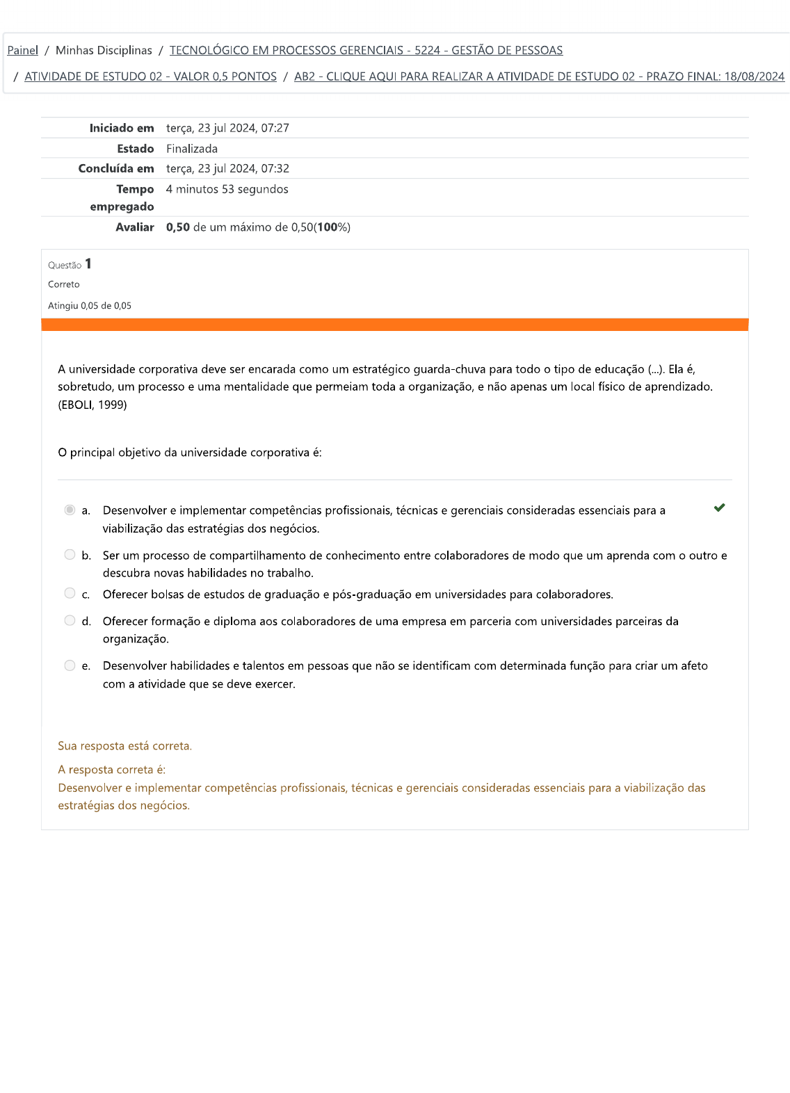 <p>Painel / Minhas Disciplinas / TECNOLÓGICO EM PROCESSOS GERENCIAIS - 5224 - GESTÃO DE PESSOAS / ATIVIDADE DE ESTUDO 02 - VALOR PONTOS / AB2 - CLIQUE AQUI PARA REALIZAR A ATIVIDADE DE ESTUDO 02 PRAZO FINAL: 18/08/2024 Iniciado em terça, 23 jul 2024, 07:27 Estado Finalizada Concluída em terça, 23 jul 2024, 07:32 Tempo 4 minutos 53 segundos empregado Avaliar 0,50 de um máximo de 0,50(100%) Questão 1 Correto Atingiu 0,05 de 0,05 A universidade corporativa deve ser encarada como um estratégico guarda-chuva para todo o tipo de educação (...). Ela é, sobretudo, um processo e uma mentalidade que permeiam toda a organização, e não apenas um local físico de aprendizado. (EBOLI, 1999) principal objetivo da universidade corporativa é: a. Desenvolver e implementar competências profissionais, técnicas e gerenciais consideradas essenciais para a viabilização das estratégias dos negócios. b. Ser um processo de compartilhamento de conhecimento entre colaboradores de modo que um aprenda com o outro e descubra novas habilidades no trabalho. C. Oferecer bolsas de estudos de graduação e pós-graduação em universidades para colaboradores. d. Oferecer formação e diploma aos colaboradores de uma empresa em parceria com universidades parceiras da organização. e. Desenvolver habilidades e talentos em pessoas que não se identificam com determinada função para criar um afeto com a atividade que se deve exercer. Sua resposta está correta. A resposta correta é: Desenvolver e implementar competências profissionais, técnicas e gerenciais consideradas essenciais para a viabilização das estratégias dos negócios.</p><p>Questão 2 Correto Atingiu 0,05 de 0,05 As quatro variáveis organizacionais de Likert apresentam-se de maneira diferente em cada empresa. Seu conjunto, podem constituir quatro alternativas que recebem o nome de sistemas administrativos. Chiavenato (2016, p. 230) apresenta os quatro sistemas administrativos de acordo com as quatro variáveis de Likert. Quais as características do Sistema 1 (Autoritário coercitivo)? a. É um sistema administrativo francamente democrático e participativo. É o mais aberto de todos os sistemas. b. É um sistema administrativo autoritário, porém menos duro e menos fechado do que o sistema 1. C. É um sistema administrativo que balança mais para o lado participativo do que para o lado autocrático e impositivo. d. É um sistema administrativo autocrático e forte, centralizador, coercitivo, arbitrário e que controla rigidamente tudo o que ocorre dentro da empresa. É o sistema mais duro e fechado. e. É um sistema administrativo que representa um gradativo abrandamento da arbitrariedade organizacional. Sua resposta está correta. A resposta correta é: É um sistema administrativo autocrático e forte, centralizador, coercitivo, arbitrário e que controla rigidamente tudo o que ocorre dentro da empresa. É o sistema mais duro e fechado. Questão 3 Correto Atingiu 0,05 de 0,05 É preciso ter cautela ao se analisar e/ou implementar um sistema de gestão de pessoas na organização, tendo como objetivo a criação de métodos e técnicas que garantam a efetividade do sistema A ação administrativa pode assumir diferentes características, dependendo de certas condições internas e externas da empresa. Nesse sentido, é correto o que se afirma em: a. A ação administrativa sempre é igual em todas as empresas, pois os gestores sempre adotam o mesmo sistema de gestão de b. A ação administrativa nunca é diferente de uma empresa para outra, pois os modelos são padrões e invariáveis. C. A ação administrativa nunca ocorre em nenhuma empresa, pois sua prática se torna inviável, devido um número infindável de variáveis. d. A ação administrativa sempre é igual em todas as empresas, pois os modelos são padrões e e. A ação administrativa nunca é igual em todas as empresas, pois varia de acordo com um infindável número de variáveis. Sua resposta está correta. A resposta correta é: A ação administrativa nunca é igual em todas as empresas, pois varia de acordo com um infindável número de variáveis.</p><p>Questão 4 Correto Atingiu 0,05 de 0,05 Estamos passando por uma fase de reordenação dos conceitos da organização empresarial, rompendo com a organização hierárquica e partindo para a organização baseada nos recursos intelectuais, na competitividade da era da informação e do conhecimento, onde a organização que atrai, desenvolve e mantém os melhores talentos tem mais vantagem no mercado. Talento, segundo Chiavenato, significa reunir talentos básicos. São eles: I. Conhecimento; II. Habilidade; III. Julgamento; IV. Atitude; V. Reprodução de ideias. a. I, e III apenas. b. I, II, III e IV apenas. C. II, III, IV e V d. I, III e V apenas. e. II, IV e V apenas. Sua resposta está correta. A resposta correta é: I, II, III e IV apenas.</p><p>Questão 5 Correto Atingiu 0,05 de 0,05 A cultura espelha a mentalidade que predomina em uma organização. Não é percebida ou observada em si mesma, mas através dos seus efeitos e consequências. Nesse sentido, Chiavenato (2016, p. 195) compara a cultura organizacional como um iceberg. Assinale a alternativa que corresponde ao que o autor conceitua como parte submersa da cultura organizacional. a. São as decorrências físicas e concretas da cultura, como o tipo de edifício, cores utilizadas, espaços, tipo de sala e mesas. b. Métodos e procedimentos de trabalho, as tecnologias utilizadas, os títulos e descrições de cargos, as políticas de gestão de pessoas. C. São os aspectos visíveis e superficiais, cuja observação ou percepção é mais fácil. Nessa parte, estão as decorrências físicas e concretas da cultura. d. Está acima do nível, estão os aspectos visíveis e superficiais observados nas organizações e que são decorrentes da sua cultura. e. Estão os aspectos invisíveis e profundos, cuja observação ou percepção é mais difícil.