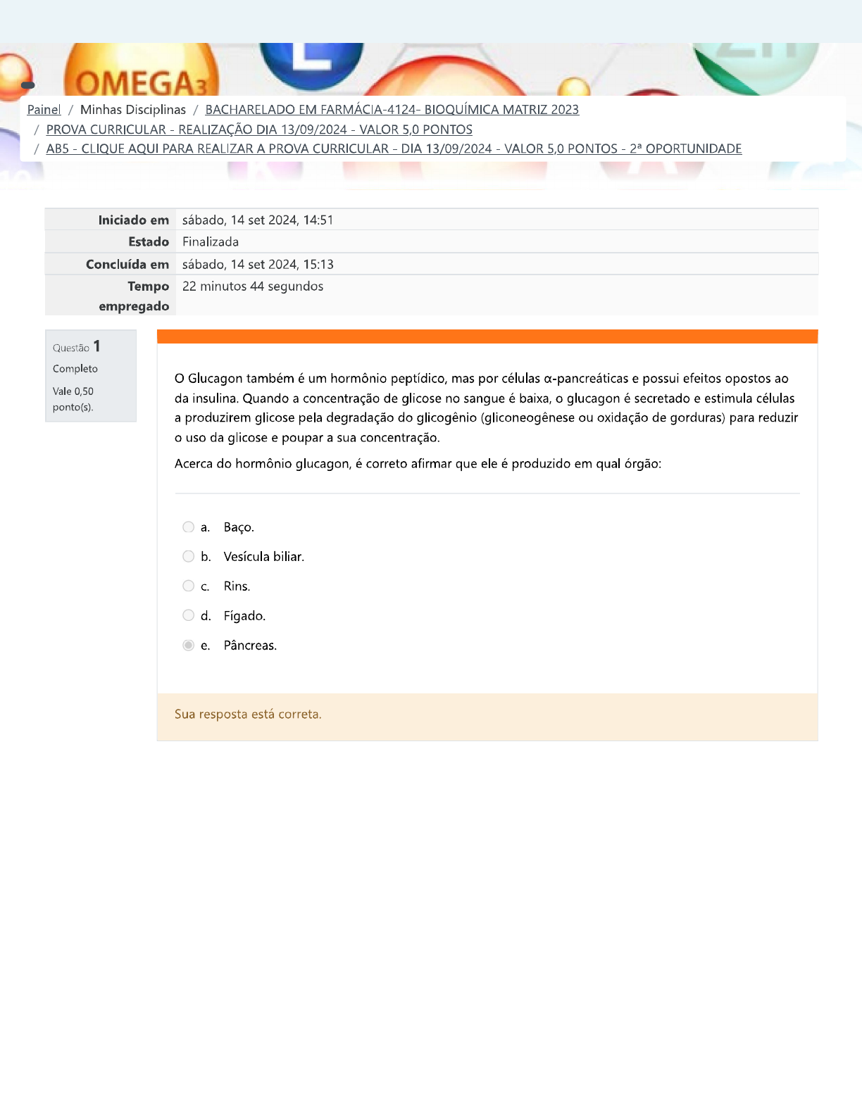 <p>OMEGA3 Painel / Minhas Disciplinas / BACHARELADO EM FARMÁCIA-4124- BIOQUÍMICA MATRIZ 2023 / PROVA CURRICULAR - REALIZAÇÃO DIA 13/09/2024 - VALOR 5,0 PONTOS / AB5 - CLIQUE AQUI PARA REALIZAR A PROVA CURRICULAR - DIA 13/09/2024 - VALOR 5,0 PONTOS - OPORTUNIDADE Iniciado em sábado, 14 set 2024, 14:51 Estado Finalizada Concluída em sábado, 14 set 2024, 15:13 Tempo 22 minutos 44 segundos empregado Questão 1 Completo Glucagon também é um hormônio peptídico, mas por células a-pancreáticas e possui efeitos opostos ao Vale 0,50 da insulina. Quando a concentração de glicose no sangue é baixa, o glucagon é secretado e estimula células ponto(s). a produzirem glicose pela degradação do glicogênio (gliconeogênese ou oxidação de gorduras) para reduzir o uso da glicose e poupar a sua concentração. Acerca do hormônio glucagon, é correto afirmar que ele é produzido em qual órgão: a. Baço. b. Vesícula biliar. C. Rins. d. Fígado. e. Pâncreas. Sua resposta está correta.</p><p>Questão 2 Completo Vale 0,50 As interferências ou má formação da enzima, do substrato ou do complexo enzima-substrato podem ponto(s). ocasionar doenças metabólicas importantes. Doença advinda da deficiência da vitamina tiamina na dieta que é essencial para formar uma coenzima do complexo PDH a TPP. Com base em seus conhecimentos e no excerto acima, assinale a opção correta acerca da doença descrita no enunciado. a. Oxiúrus. b. Leishmaniose visceral. C. Teníase. d. e. Chagas. Sua resposta está correta. Questão 3 Completo As características moleculares e os mecanismos químicos envolvidos são organizados em princípios Vale 0,50 bioquímicos que representam a base da vida em diferentes organismos. Todo esse raciocínio explica a lógica ponto(s). molecular da vida, que pode ser aplicada para reunir informações de diversas áreas do conhecimento. Com base no exposto, quais são as duas bases para a aplicação da bioquímica? a. entendimento do funcionamento de órgãos e sistemas, sob o contexto fisiológico ou patológico; A aplicação prática desse conhecimento para desbravamento da ciência, buscando novas tecnologias e avanços na agricultura e indústria. b. Compreensão de como ocorrem as relações entre os seres vivos em todas as instâncias; Relação de simbiose entre as espécies em extinção. C. Procurar a cura para doenças até então sem esta possibilidade, como a malária; por meio da nanotecnologia, auxiliar no transplante de células tronco. d. Entender a atmosfera terrestre no período em que ocorrer a evolução; conseguir encontrar coerência para o desenvolvimento do primeiro ser microscópico até os dias atuais. e. Facilitar e promover o entendimento da origem da vida; proporcionar avanços na medicina preventiva. Sua resposta está correta.</p><p>Questão 4 Completo A glicólise é uma via metabólica responsável pela produção de energia para tecidos e células animais e Vale 0,50 vegetais e microrganismos através da degradação, via oxidação, de moléculas de glicose. Durante o ponto(s). processo, a energia da glicose é conservada na forma de NADH e de ATP. Com base no excerto e em seus conhecimentos, assinale a alternativa correta que aponta qual a estrutura da molécula de glicose. a. É uma molécula formatada por 4 átomos de hidrogênio. b. A molécula da glicose é formada por duas pentoses. C. A molécula de glicose é formada por três pentoses. d. Molecula formada por quatro grupos de pentose. e. A glicose é uma molécula de seis átomos de carbono. Sua resposta está correta. Questão 5 Completo Os lipídeos são compostos químicos que apresentam como principal característica a sua insolubilidade em Vale 0,50 ponto(s). água. A insolubilidade ocorre porque os lipídeos são constituídos por um esqueleto de hidrocarbonetos que confere essa propriedade apolar. Eles desempenham funções variadas nas células, sendo as duas principais: Assinale a alternativa correta: a. Armazenamento de energia como gorduras e óleos e componentes de membranas biológicas. b. A liberação de substâncias para proteção celular; C. Proteção do envoltório nuclear onde encontra-se a cromatina. d. Tem como principal função transformar água em nutriente para alimentar a célula. e. A ligação de tripla base nitrogenada entre as cadeias que formam a fita de DNA. Sua resposta está correta.</p><p>Questão 6 Completo São as organelas que representam o local em que a fotossíntese ocorre, suas características morfológicas Vale 0,50 são semelhantes à da mitocôndria, apresentando uma membrana externa que permite a passagem de ponto(s). pequenas moléculas e outra externa que exige o envolvimento de transportadores. excerto acima se refere a qual organela? Assinale a alternativa correta: a. Retículo endoplasmático rugoso. b. Núcleo. C. Cloroplasto. d. e. Complexo de golgie. Sua resposta está correta. Questão 7 Completo Vale 0,50 As células vivas apresentam características universais e a partir do padrão de organização e de seus ponto(s). constituintes, podemos classificá-las em dois grupos: a célula animal e a vegetal. Alguns elementos estão presentes apenas em um dos tipos celulares. Tento em vista o exposto, quais são as diferenças da célula animal e da célula vegetal? a. A presença de cloroplasto apenas na célula vegetal e de lisossomos apenas na célula animal. b. A presença de retículo endoplasmático rugoso e liso na célula vegetal, e a presença somente de retículo endoplasmático rugoso na célula animal. C. Ausência de cloroplasto na célula vegetal e presença de cloroplasto na célula animal. d. A ausência de membrana plasmática na célula vegetal e presença de membrana plasmática na célula animal. e. A presença de completo de Golgie na célula vegetal e ausência do mesmo célula animal. Sua resposta está correta.</p><p>Questão 8 Completo Vale 0,50 A maioria dos procariotos é unicelular e são represe