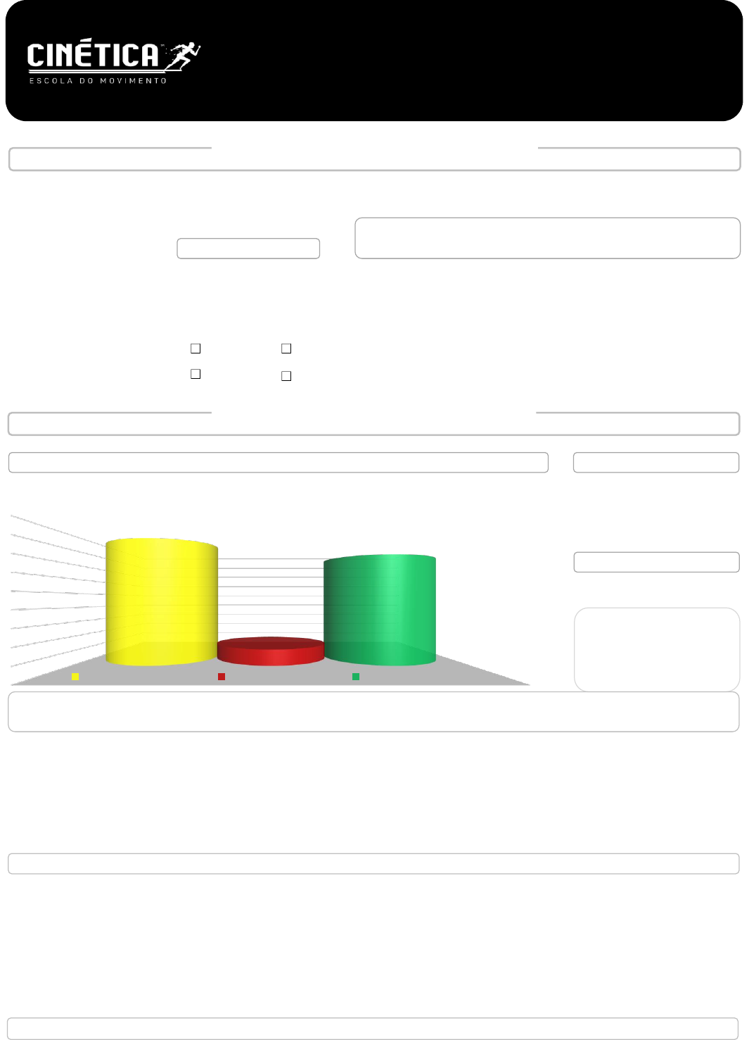 <p>anos M</p><p>Ocupação atual</p><p>Encaminhamento</p><p>Diagnóstico</p><p>Mão dominante</p><p>Perna dominante</p><p>Massa corporal kg Gordura corporal %</p><p>Massa gorda kg Massa magra %</p><p>Massa magra kg Massa óssea kg</p><p>% kg</p><p>Massa corporal proposta kg kg</p><p>Somatório de dobras cutâneas mm</p><p>Subescapular</p><p>Tricipital 7,00</p><p>Rhaissa Cola</p><p>Jovens Mulheres – 10 a 18 anos - Guedues (1985) | 3 DC</p><p>% Gordura</p><p>Idade 30</p><p>E-mail</p><p>PRÓXIMA AVALIAÇÃO</p><p>20/09/2024</p><p>Sexo</p><p>Classificação</p><p>Subescapular, suprailíaca, coxa</p><p>12,78</p><p>Meta para próxima</p><p>avaliação</p><p>Massa residual</p><p>Data da avaliação</p><p>Tórax</p><p>Axilar média 7,00</p><p>7,00 Coxa medial</p><p>12,00</p><p>12,00</p><p>Panturrilha</p><p>87,22</p><p>38,38</p><p>5,62</p><p>Massa muscular38,38</p><p>6,00</p><p>10,00</p><p>Bicipital</p><p>Data de nascimento</p><p>44,00 12,78</p><p>10,60</p><p>27,77</p><p>Componentes da composição corporal</p><p>% GC proposto</p><p>Composição Corporal Segmentada</p><p>6,00 6,00</p><p>73,00</p><p>Suprailíaca</p><p>Abdome</p><p>Dobras Cutâneas</p><p>Nome</p><p>30/05/1994</p><p>20/09/2024</p><p>PrimeiraOrdem da avaliação</p><p>44,00</p><p>5,62</p><p>38,38</p><p>Massa corporal (kg) Massa gorda (kg) Massa magra (kg)</p><p>DADOS PESSOAIS</p><p>COMPOSIÇÃO CORPORAL</p><p>AVALIAÇÃO FISIOLÓGICA</p><p>Direita</p><p>Direita</p><p>Esquerda</p><p>Esquerda</p><p>Desenvolvido por Engenheiro Planilheiro em parceria com Cinética</p><p>D E</p><p>23,0 23,0</p><p>24,0 24,0</p><p>20,0 20,0</p><p>46,0 46,0</p><p>42,0 42,0</p><p>36,0 36,0</p><p>36,0 36,0</p><p>Pescoço</p><p>Tórax</p><p>Cintura</p><p>Quadril</p><p>Abdome</p><p>Braço contraído</p><p>17,15</p><p>Redução percentual do diâmetro de coxa</p><p>Tronco</p><p>Antebraço</p><p>Coxa distal</p><p>Coxa medial</p><p>Área muscular da coxa (cm²)</p><p>Massa gorda do braço (%)</p><p>-8,7%</p><p>Área muscular do braço (cm²) 34,43</p><p>-21,7% -21,7%</p><p>Membros</p><p>78,0</p><p>60,0</p><p>87,0</p><p>32,0</p><p>71,0</p><p>116,31</p><p>24,07</p><p>Massa gorda da coxa (%)</p><p>-8,7%</p><p>Massa muscular do braço (%) 81,79</p><p>Braço relaxado</p><p>Área gorda do braço (cm²) 7,67</p><p>Proximal - distalProximal - medial</p><p>18,21</p><p>82,85Massa muscular da coxa (%)</p><p>Área total do braço (cm²) 42,10 Área total da coxa (cm²) 140,37</p><p>Área gorda da coxa (cm²)</p><p>Coxa proximal</p><p>Panturrilha</p><p>23,0 24,0</p><p>20,0</p><p>46,0</p><p>42,0</p><p>36,0 36,0</p><p>23,0 24,0</p><p>20,0</p><p>46,0 42,0</p><p>36,0 36,0</p><p>D E</p><p>32,0</p><p>87,0</p><p>60,0</p><p>78,0</p><p>71,0</p><p>Pescoço Tórax Cintura Quadril Abdome</p><p>PERIMETRIA</p><p>81,8</p><p>18,2</p><p>Massa muscular do</p><p>braço (%)</p><p>Massa gorda do</p><p>braço (%)</p><p>82,9</p><p>17,1</p><p>Massa muscular da coxa</p><p>(%)</p><p>Massa gorda da coxa (%)</p><p>Medidas em cm</p><p>Desenvolvido por Engenheiro Planilheiro em parceria com Cinética</p><p>Frequência Cardíaca Máxima bpm</p><p>Frequência Cardíaca de Repouso bpm</p><p>Frequência Cardíaca de Reserva bpm</p><p>kg Índice de Massa Corporal (IMC) kg/m²</p><p>cm</p><p>Avaliação 2</p><p>Avaliação 3</p><p>Avaliação 4</p><p>Melhor</p><p>Barra</p><p>Testes de repetições máximas em 1 minuto</p><p>Movimento Resultado</p><p>Percepção de</p><p>Esforço</p><p>Flexão de Braço</p><p>Observações</p><p>mmHg</p><p>Pressão Arterial Diastólica</p><p>Pressão Arterial Média</p><p>Estatura</p><p>Classificação de risco para circunferência da cintura Baixo</p><p>Massa corporal</p><p>Avaliação 1</p><p>Avaliação 2</p><p>Avaliação 3</p><p>Avaliação 4</p><p>Melhor</p><p>Avaliação 1</p><p>Classificação</p><p>Índice de Massa Corporal</p><p>44,00</p><p>157</p><p>17,85</p><p>mmHg</p><p>mmHg</p><p>Pressão Arterial e Frequência Cardíaca</p><p>Pressão Arterial Sistólica</p><p>Agachamento Livre</p><p>Abdominal Clássico</p><p>Ponte</p><p>Testes de resistência máxima</p><p>Movimento Resultado Percepção de</p><p>Esforço Observações</p><p>Prancha isométrica</p><p>Cadeira isométrica</p><p>Testes de potência - Máximo em 1 minuto</p><p>PARÂMETROS FISIOLÓGICOS</p><p>AVALIAÇÃO DE FLEXIBILIDADE</p><p>Banco de Wells Tocar ao Solo</p><p>AVALIAÇÃO DE FORÇA E RESISTÊNCIA</p><p>Desenvolvido por Engenheiro Planilheiro em parceria com Cinética</p><p>D E D E</p><p>Flexão de ombro</p><p>extensão de ombro</p><p>Rotação externa</p><p>Rotação interna</p><p>Flexão de cotovelo</p><p>Extensão de cotovelo</p><p>Desenvolvimento</p><p>Empurrar</p><p>Puxar</p><p>Extensão de Quadril</p><p>Flexão de quadril</p><p>Abdução de Quadril</p><p>Adução de Quadril</p><p>Planti-Flexão de Tornozelo</p><p>Dorsi-Flexão de Tornozelo</p><p>Y Balance Test Y Balance Test</p><p>Movimento Resultado Percepção de</p><p>Esforço Observações</p><p>Agachamento com</p><p>salto</p><p>Afundo com salto</p><p>Burpee</p><p>Flexão com salto</p><p>Arremesso de bola</p><p>Salto sobre o banco</p><p>Agachamento pistol</p><p>Abdominal Remador/</p><p>canivete</p><p>Corda Naval</p><p>Trenó; Carga</p><p>Membros Superiores</p><p>Direito (kg) Esquerdo (kg) Diferença</p><p>Direito (kg) Esquerdo (kg) Diferença</p><p>Flexão de Joelho</p><p>Extensão de Joelho</p><p>Membros Inferiores</p><p>AVALIAÇÃO DE FORÇA MUSCULAR</p><p>AVALIAÇÃO FUNCIONAL</p><p>Desenvolvido por Engenheiro Planilheiro em parceria com Cinética</p><p>CMJ:</p><p>SJ:</p><p>DJ:</p><p>CMJ Free Arms:</p><p>Saltos Repetidos:</p><p>Distância prevista:</p><p>Distância percorrida:</p><p>% distância prevista:</p><p>Núm. voltas (20m):</p><p>Nível de caminhada: Nível 1</p><p>Data:</p><p>Teste do QuadradoRowing Test</p><p>Teste de caminhada</p><p>Data:</p><p>Local:</p><p>Jump Test</p><p>Data:</p><p>Local:</p><p>Tempo:</p><p>Média de tempo:Tipo:</p><p>Melhor tempo:Local:</p><p>Local:</p><p>Level:</p><p>Tempo:</p><p>Data:</p><p>Data:</p><p>Lo