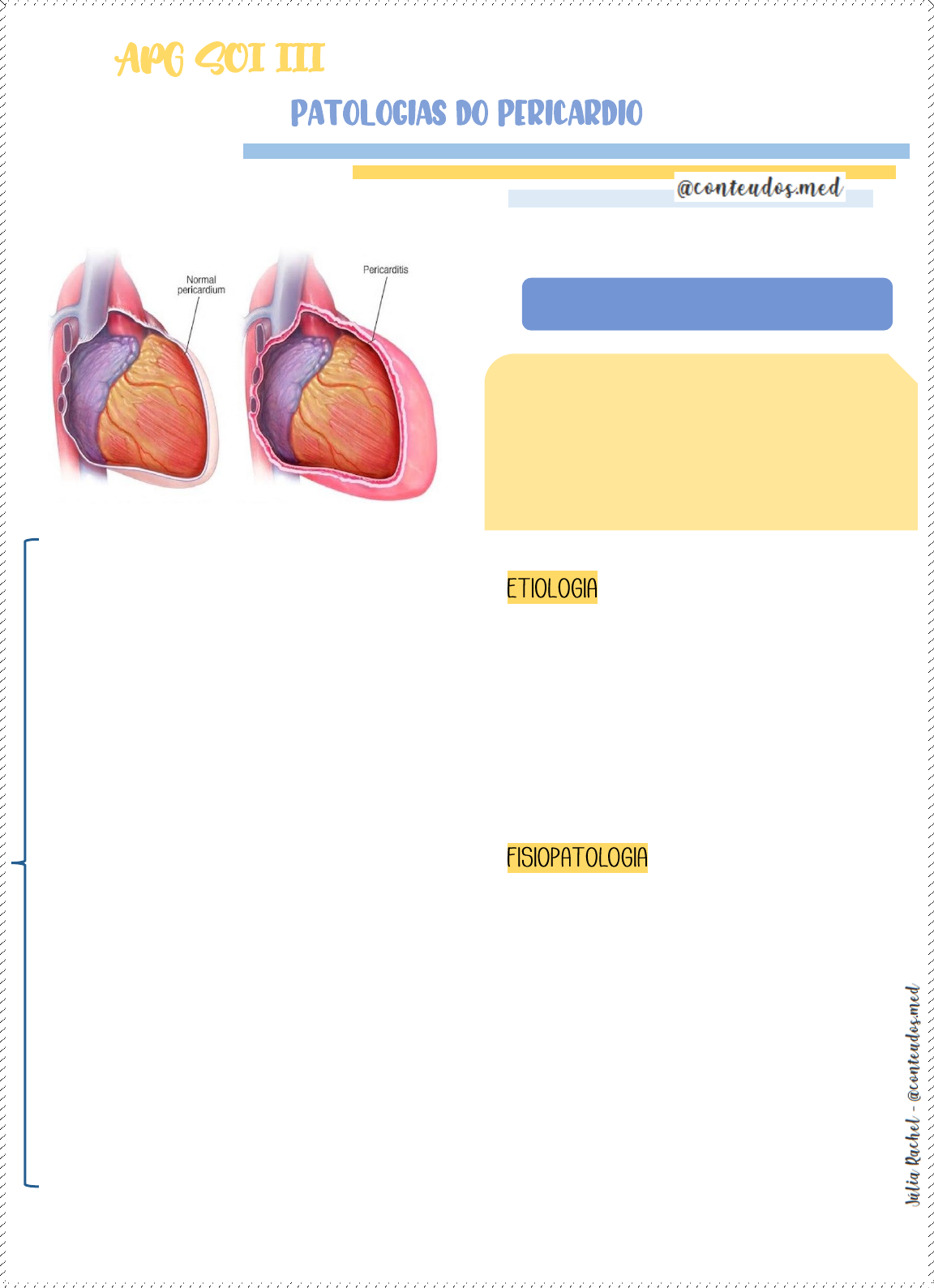 <p>O pericárdio é um saco fibroso avascular que</p><p>envolve o coração, composto por dois folhetos</p><p>(visceral e parietal) que contém o líquido</p><p>pericárdico, responsável pelo deslizamento dos</p><p>folhetos, a fim de viabilizar a mobilidade</p><p>cardíaca.</p><p>A pericardite é um processo inflamatório do</p><p>pericárdio e pode ser classificado em pericardite</p><p>aguda, subaguda ou crônica, de acordo com o</p><p>tempo de duração.</p><p>Ela pode desaparecer sem deixar sequelas</p><p>importantes, causar complicações</p><p>hemodinâmicas imediatas, se produzir um</p><p>derrame grande (que provoca tamponamento</p><p>cardíaco) ou progredir para um processo</p><p>fibrosante crônico (pericardite constritiva).</p><p>Sua etiologia pode ser idiopática, infecciosa</p><p>(decorrente de bactérias, fungos e parasitas) ou</p><p>não infecciosa, (decorrente de alguma doença</p><p>autoimune, doenças de órgãos adjacentes,</p><p>doenças metabólicas, neoplasias). Sendo mais</p><p>comum a idiopática e a viral.</p><p></p><p>A pericardite está associada a infecções virais</p><p>(principalmente por vírus Coxsackie e ecovírus),</p><p>bacterianas, doenças no tecido conjuntivo,</p><p>uremia, procedimentos cirúrgicos cardíacos,</p><p>toxicidade de fármacos, radioterapia, fungos</p><p>dentre outros.</p><p></p><p>As lesões pericárdicas, devido bactérias ou outros</p><p>agentes, resultam da liberação de mediadores</p><p>químicos de inflamação nos tecidos adjacentes,</p><p>iniciando o processo inflamatório.</p><p>Consequentemente, os macrófagos presentes no</p><p>tecido iniciam a fagocitose dos patógenos</p><p>invasores sendo acompanhados por neutrófilos e</p><p>monócitos. O aumento da permeabilidade da</p><p>capilar acarretando o preenchimento da área</p><p>por exsudato, o qual é composto de tecido</p><p>necrótico e bactérias mortas, neutrófilos e</p><p>PERICARDITE</p><p>. Pericardite aguda: dura menos que 6</p><p>semanas.</p><p>. Pericardite subaguda: dura entre 6</p><p>semanas e 6 meses.</p><p>. Pericardite crônica: dura mais de 6 meses.</p><p>macrófagos. Essa solução se cicatriza e pode</p><p>evoluir para a formação de um tecido fibrótico e</p><p>eventual aderência das duas camadas</p><p>pericárdicas.</p><p>Se houver acúmulo de líquido na cavidade, ocorre</p><p>o derrame pericárdico, que pode evoluir para</p><p>tamponamento cardíaco. Tal acúmulo promove a</p><p>compressão do coração impedindo seu</p><p>enchimento durante a diástole, resultando na</p><p>diminuição do débito cardíaco. Esse acúmulo de</p><p>líquido ocorre devido a ação das histaminas e os</p><p>demais mediadores químicos que dilatam os vasos</p><p>e aumentam a permeabilidade vascular, de modo</p><p>que as paredes dos vasos deixam líquidos e</p><p>proteínas para os tecidos causando edema</p><p>extracelular.</p><p></p><p>O diagnóstico se baseia na tríade de:</p><p>. Clínica: dor torácica;</p><p>. atrito pericárdico;</p><p>. alterações do eletrocardiograma.</p><p>A dor torácica é retroesternal, construtiva,</p><p>irradiada para pescoço, ombros ou costas; possui</p><p>variação de intensidade com mudança de</p><p>posição.</p><p>O atrito pericárdico é um ruído mais intenso</p><p>audível na borda esternal esquerda quando o</p><p>paciente senta com tronco inclinado para frente,</p><p>de tom áspero, presente tanto na sístole quanto</p><p>na diástole.</p><p>As alterações eletrocardiográficas são o</p><p>supradesnivelamento do segmento ST difuso e a</p><p>infra do segmento PR.</p><p>Além do ECG, tem como exames complementares</p><p>a radiografia de tórax, ecocardiograma,</p><p>marcadores laboratoriais de inflamação</p><p>sistêmica e exames laboratoriais de leucometria,</p><p>elevação da velocidade de hemossedimentação</p><p>(VHS) e aumento da proteína C reativa (PCR).</p><p></p><p>Em geral, os sintomas são controlados</p><p>eficientemente com anti-inflamatórios não</p><p>esteroides como ibuprofeno. A colchicina pode ser</p><p>acrescentada ao esquema terapêutico, pois</p><p>produz efeitos anti-inflamatórios, impedindo a</p><p>polimerização dos microtúbulos, inibindo a</p><p>migração e a fagocitose dos leucócitos.</p><p>Quando há infecção, frequentemente são</p><p>prescritos antibióticos específicos para o agente</p><p>etiológico.</p><p>Os corticoides podem ser usados para tratar</p><p>pacientes com doenças do tecido conjuntivo ou</p><p>pericardite sintomática grave, que não melhore</p><p>com AINE e colchicina. Quando for possível, os</p><p>corticoides deverão ser evitados, já que</p><p>aumentam o número de recidivas.</p><p>A posição de “Prece maometana”, na atitude</p><p>genupeitoral, facilita o enchimento do coração</p><p>nos casos de derrame pericárdico e alivia a dor.</p><p></p><p>Suas causas incluem:</p><p>• Seroso: insuficiência cardíaca congestiva,</p><p>hipoalbuminemia de qualquer causa.</p><p>DERRAME PERICÁRDICO</p><p>É uma complicação da pericardite aguda, onde</p><p>há acúmulo de líquido no espaço pericárdico</p><p>acima do valor normal.</p><p>• Sorossanguíneo: trauma torácico brusco,</p><p>tumores malignos, ruptura do IM ou dissecção</p><p>aórtica.</p><p>• Quiloso: obstrução linfática mediastinal.</p><p></p><p>À medida que há aumento cardíaco ou acúmulo</p><p>de fluido, o pericárdio tem tempo para dilatar.</p><p>Isso permite que os derrames pericárdicos</p><p>crônicos se tornem bastante grandes sem</p><p>interferir na função cardíaca. Assim, nos</p><p>derrames crônicos com menos de 500 mL de</p><p>volume, o único significado clínico é um</p><p>alargamento globular característico da sombra</p><p>do coração na radiografia torácica.</p><p>Em contraste, o desenvolvimento rápido de</p><p>coleções de fluidos de até 200 a 300 mL pode</p><p>produzir uma compressão clinicamente</p><p>devastadora nas paredes finas dos átrios e veia</p><p>cava ou nos 