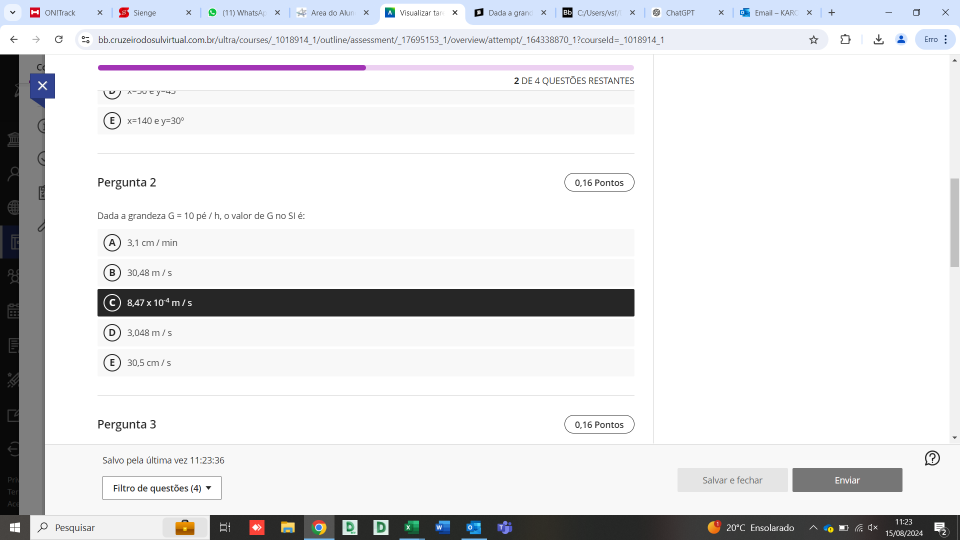 <p>ON!Track Sienge (11) WhatsAp Area do Alun A Visualizar Dada a grand Bb C:/Users/vsf/ ChatGPT Email KARC + - X Erro C X 2 DE 4 QUESTÕES RESTANTES E x=140 e y=30° Pergunta 2 0,16 Pontos Dada a grandeza G=10 pé / h, o valor de G no SI é: A 3,1 cm / min B 30,48 m / S 8,47 10-4 S D 3,048 m / S E 30,5 cm / S Pergunta 3 0,16 Pontos Salvo pela última vez 11:23:36 ? Salvar e fechar Enviar Filtro de questões (4) Pesquisar D D 1 11:23 W 20°C Ensolarado 15/08/2024 2</p>
