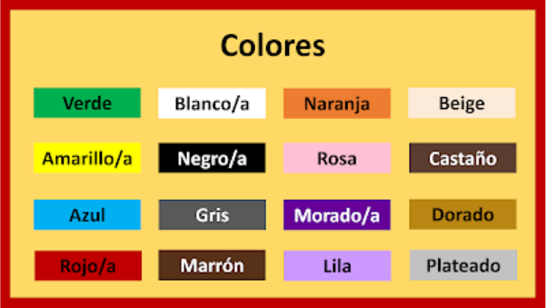 <p>As cores em espanhol – Los colores en español</p><p>Verde – verde</p><p>Amarillo/a – amarelo/a</p><p>Azul – azul</p><p>Rojo/a – vermelho</p><p>Blanco/a – branco/a</p><p>Negro/a – preto/a</p><p>Gris - cinza</p><p>Marrón – marrom</p><p>Naranja – laranja</p><p>Rosa – rosa</p><p>Morado/a – roxo</p><p>Lila – lilás</p><p>Beige – bege</p><p>Castaño – castanho</p><p>Dorado – dourado</p><p>Plateado - prateado</p><p>1) Selecione as cores conforme a cor da ilustração.</p><p>2) Complete as frases com as cores:</p><p>a) Tengo un coche .(Vermelho)</p><p>b) Mi casa es .(Laranja)</p><p>c) No me gusta el color . (cinza)</p><p>d) Tráigame aquella caja por favor.(preta)</p><p>e) El oro es .(amarelo)</p><p>Caja: caixa</p><p>Oro: ouro</p><p>As cores em espanhol – Los colores en español</p>