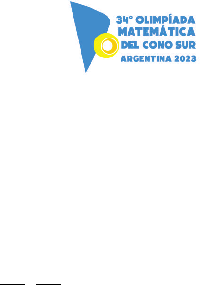 <p>PRIMEIRO DIA</p><p>7 de agosto de 2023</p><p>Problema 1.</p><p>Uma lista de n números inteiros positivos a1, a2, a3, . . . , an é dita buena caso se verifique simul-</p><p>taneamente:</p><p>• a1 < a2 < a3 < . . . < an,</p><p>• a1 + a 2</p><p>2 + a 3</p><p>3 + . . .+ a n</p><p>n ≤ 2023.</p><p>Para cada n ≥ 1, determine quantas listas buenas de n números existem.</p><p>Observação: a k</p><p>k = ak · ak · . . . · ak︸ ︷︷ ︸</p><p>k vezes</p><p>.</p><p>Problema 2.</p><p>Um plano é quadriculado em um tabuleiro infinito. Em cada casa deste tabuleiro há uma</p><p>lâmpada, inicialmente apagada. Uma operação permitida consiste em escolher um quadrado</p><p>de 3 × 3, 4 × 4 ou 5 × 5 casas e trocar de estado todas as lâmpadas desse quadrado (as que</p><p>estão apagadas se tornam acessas e as que estão acessas se tornam apagadas).</p><p>(a) Prove que para qualquer conjunto finito de lâmpadas é posśıvel, mediante uma sequência</p><p>finita de operações permitidas, que essas sejam as únicas lâmpadas acessas do tabuleiro.</p><p>(b) Prove que se em uma sequência de operações permitidas só se usar dois dos três tamanhos</p><p>de quadrados, então é imposśıvel que ao final as únicas lâmpadas acessas do tabuleiro</p><p>sejam as de um quadrado de 2× 2 casas.</p><p>Problema 3.</p><p>Em um semiplano, delimitado por uma reta r, temos triângulos equiláteros S1, S2, . . . , Sn cada</p><p>um deles com um lado paralelo a r, e cujo vértice oposto é o ponto do triângulo mais distante</p><p>a r.</p><p>Para cada triângulo Si, seja Ti seu triângulo medial. Sejam S a região coberta pelos triângulos</p><p>S1, S2, . . . , Sn e T a região coberta pelos triângulos T1, T2, . . . , Tn.</p><p>Prove que</p><p>área(S) ≤ 4 · área(T ).</p><p>Observação: O triângulo medial de um triângulo ABC é aquele cujos vértices são os pontos</p><p>médios dos lados AB, BC e CA.</p><p>Duração da prova: 4 horas</p><p>Cada problema vale 10 pontos</p><p>SEGUNDO DIA</p><p>8 de agosto de 2023</p><p>Problema 4.</p><p>Consideramos a sequência de números inteiros definida por a1 = 1, a2 = 2, e para cada n ≥ 2,</p><p>an+1 é o maior divisor primo de a1 + a2 + . . .+ an.</p><p>Calcule a100.</p><p>Problema 5.</p><p>Sejam ABC um triângulo acutângulo e D, E, F os pontos médios de BC, CA, AB, respecti-</p><p>vamente. A circunferência de diâmetro AD intersecta pela segunda vez as retas AB e AC nos</p><p>pontos P e Q, respectivamente. A paralela a reta BC por P intersecta DE no ponto R e a</p><p>paralela a reta BC por Q intersecta DF no ponto S. A circunferência circunscrita de DPR</p><p>intersecta novamente AB em X, a circunferência circunscrita de DQS intersecta novamente</p><p>AC em Y , e estas duas circunferências se intersectam novamente no ponto Z. Prove que Z é</p><p>o ponto médio de XY .</p><p>Problema 6.</p><p>Sejam x1, x2, . . . , xn números reais positivos. Para cada inteiro positivo k, seja</p><p>Sk = x k</p><p>1 + x k</p><p>2 + . . .+ x k</p><p>n .</p><p>(a) Prove que se S1 < S2 então a sequência S1, S2, S3, . . . é estritamente crescente.</p><p>(b) Prove que existem n e números positivos x1, x2, . . . , xn tais que S1 > S2 e a sequência</p><p>S1, S2, S3, . . . não é estritamente decrescente.</p><p>Duração da prova: 4 horas</p><p>Cada problema vale 10 pontos</p>