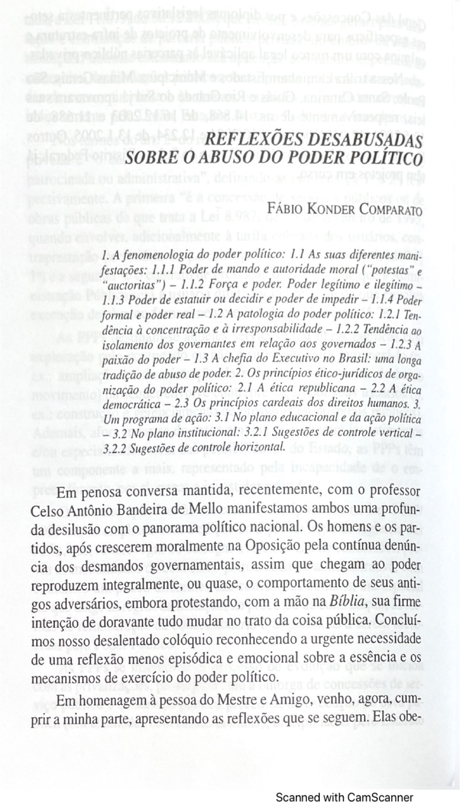 <p>REFLEXÕES DESABUSADAS SOBRE ABUSO DO PODER POLÍTICO FÁBIO KONDER COMPARATO 1. A fenomenologia do poder político: 1.1 As suas diferentes mani- festações: 1.1.1 Poder de mando e autoridade moral ("potestas" e "auctoritas") - 1.1.2 Força e poder. Poder legítimo e ilegítimo 1.1.3 Poder de estatuir ou decidir e poder de impedir - 1.1.4 Poder formal e poder real 1.2 A patologia do poder político: 1.2.1 Ten- dência à concentração e à irresponsabilidade - 1.2.2 Tendência ao isolamento dos governantes em relação aos governados 1.2.3 A paixão do poder - 1.3 A chefia do Executivo no Brasil: uma longa tradição de abuso de poder. 2. Os princípios ético-jurídicos de orga- nização do poder político: 2.1 A ética republicana 2.2 A ética democrática 2.3 Os princípios cardeais dos direitos 3. Um programa de ação: 3.1 No plano educacional e da ação política 3.2 No plano institucional: 3.2.1 Sugestões de controle vertical 3.2.2 Sugestões de controle horizontal. Em penosa conversa mantida, recentemente, com o professor Celso Antônio Bandeira de Mello manifestamos ambos uma profun- da desilusão com o panorama político nacional. Os homens e os par- tidos, após crescerem moralmente na Oposição pela contínua denún- cia dos desmandos governamentais, assim que chegam ao poder reproduzem integralmente, ou quase, o comportamento de seus anti- gos adversários, embora protestando, com a mão na Bíblia, sua firme intenção de doravante tudo mudar no trato da coisa pública. Concluí- mos nosso desalentado colóquio reconhecendo a urgente necessidade de uma reflexão menos episódica e emocional sobre a essência e os mecanismos de exercício do poder político. Em homenagem à pessoa do Mestre e Amigo, venho, agora, cum- prir a minha parte, apresentando as reflexões que se seguem. Elas obe- Scanned with CamScanner</p><p>FÁBIO KONDER COMPARATO 309 decem ao método ternário, cuja boa tem sido largamente demonstrada na análise dos problemas sociais: ver, julgar e agir. Apre- sento, assim, numa primeira parte, o que se poderia denominar a feno- menologia do poder político, para lembrar, em seguida, os princípios fundamentais da Política, e concluir com uma propos- ta de programa de ação. 1. A fenomenologia do poder político 1.1 As suas diferentes manifestações Não há realidade mais proteiforme que o poder. Hobbes, em pas- sagem famosa do (Parte I, Capítulo 10), apontou algumas de suas várias manifestações: "Reputação de poder é poder; pois ela atrai a adesão daqueles que pre- cisam de proteção. Assim é a reputação que alguém tenha de ser amado pelos seus conterrâneos (a chamada popularidade), pela mesma razão. o mesmo acontece com a qualidade que faz com que um homem seja amado ou temi- do por muitos; pois ela implica obter a assistência e serviço de muitos. "Bom sucesso é poder; ele cria a reputação de sabedoria, ou de sorte; a qual suscita o temor ou a confiança dos outros. "A afabilidade dos homens que já estão no poder o reforça, porque sus- cita a estima dos governados. "Reputação de prudência na condução da paz ou da guerra é poder; pois aos homens prudentes costumamos confiar o governo de nós mesmos, mais facilmente que a outros. "Nobreza é poder, não em todos os países, mas naqueles em que ela confere privilégios; porque o poder consiste justamente em tais privilégios. é poder; porque dá a impressão de prudência. "Forma (isto é, beleza) é poder; porque, sendo uma promessa do Bem, provoca a simpatia das mulheres e dos estrangeiros." Nem todas essas formas de poder, contudo, apresentam a mesma importância no plano político. Examinemos, portanto, com mais cui- dado, algumas de suas principais manifestações. Scanned with CamScanner</p><p>ESTUDOS DE DIREITO PUBLICO 310 1.1.1 Poder de mando e autoridade moral ("potestas" e "auctoritas") Essa distinção foi feita em Roma para distinguir, de um lado, a posição política dos e outros magistrados, que podiam im- por suas decisões ao povo (potestas ou imperium), e, de outro, a posi- ção do Senado, cujas decisões eram respeitadas unicamente em razão do prestígio moral ligado à instituição (composta dos descendentes presumidos dos fundadores de Roma), mesmo não tendo Senado poder algum para impor suas decisões ao povo. A Constituição da República Romana, como salientou Políbio no Livro VI de sua His- tória, era um misto de monarquia, oligarquia e democracia, que dificultava em muito, na prática, o abuso de poder. Os cônsules exer- ciam funções de natureza o Senado organizava-se como instituição oligárquica, enquanto ao povo eram reservados certos po- deres propriamente democráticos, como o de aprovar as leis propos- tas pelos cônsules e não vetadas pelo Senado. Nas instituições modernas essa antiga distinção não foi oficial- mente mantida, salvo em algumas Monarquias, como a Espanhola. Mas tudo depende, na prática, do efetivo prestígio moral dos agentes políticos, sejam eles ocupantes de cargo oficial, ou não. Por exemplo, após a independência da Índia, Gandhi, embora não ocupasse cargo oficial algum, gozou até a sua morte de uma autoridade moral incon- testável. Nenhuma grande decisão governamental era tomada sem 0 acordo prévio do Mahatma. Datafolha departamento de pesquisa do jornal Folha de S. Paulo - publicou os resultados de uma pesquisa de opinião realizada em todo o Brasil para avaliar o que chamou "po- der de influência" e "prestígio" de várias instituições Apurou-se que, no tocante ao "poder de influência", as três primei- ras instituições eram, em ordem decrescente, a imprensa (provavel- mente, o conjunto dos meios de comunicação de massa), a Presidên- cia da República e as instituições financeiras; e as três últimas eram os partidos políticos, as empresas estatais e os sindicatos de traba- lhadores. Quanto ao "prestígio", as instituições que mais se desta- caram foram a imprensa, os clubes