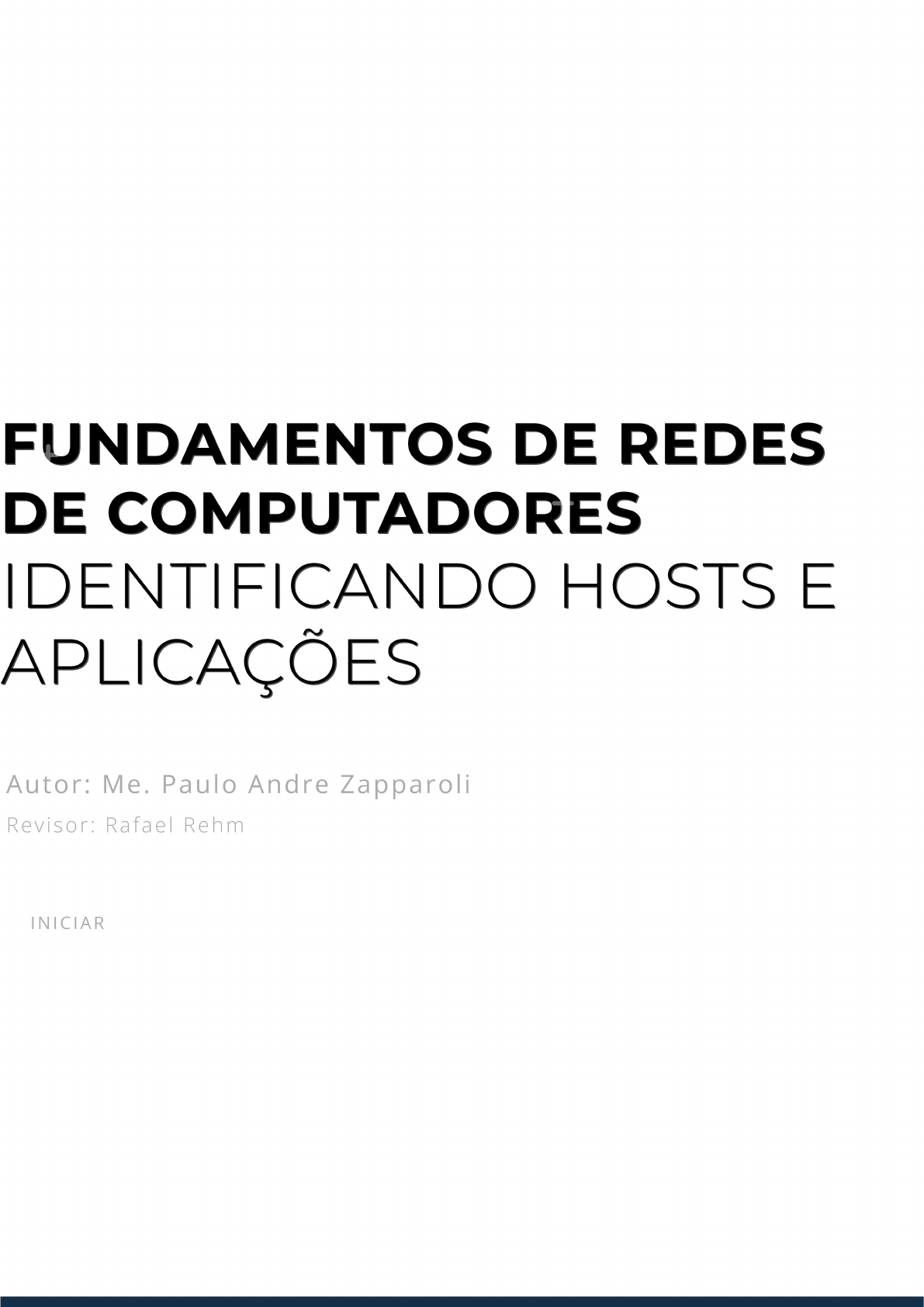 <p>FUNDAMENTOS DE REDES DE COMPUTADORES IDENTIFICANDO HOSTS E APLICAÇÕES Autor: Me. Paulo Andre Zapparoli Revisor: Rafael Rehm INICIAR</p><p>Introdução Aprenderemos nesta unidade quais as funções dos protocolos a camada de rede do modelo OSI. Como esses protocolos especificam o endereço de cada dispositivo de rede. Como o encapsulamento é feito da camada de rede. Como os pacotes da origem são transferidos à um destino em uma rede diferente. Também examinaremos como é feita a divisão das redes em grupos de hosts e como a comunicação entre as redes, chamada de roteamento, acontece. Outra camada do modelo OSI em foco nesta unidade é a camada de transporte. Entenderemos como ela executa suas funções de controle de fluxo, reconhecimento das aplicações nos dispositivos de origem e destino conexão e transporte dos dados. Compreenderemos como uma aplicação fará a formatação, transmissão e interpretação das mensagens enviadas e recebidas em uma comunicação de rede. Também será apresentado as características dos dois principais protocolo da camada de transporte do modelo TCP/IP o protocolo TCP e o protocolo UDP.</p><p>Camada de Rede A camada de rede está relacionada à transferência de pacotes da origem para o destino. Chegar ao destino pode exigir vários hops (saltos) em roteadores intermediários ao longo do percurso. Essa função contrasta claramente com a função da camada de enlace de dados, que tem objetivo mais modesto de apenas mover quadros de uma extremidade de um fio até a outra. Portanto, a camada de rede é a camada mais baixa que lida com a transmissão fim a fim." (Tanenbaum, 2011, pag. 267) A camada de rede ou Camada 3 do modelo OSI, tem como função oferecer serviços para que dispositivos finais troquem dados pela rede, o que muitas vezes é conhecido como transporte de ponta a ponta. Para atender esta necessidade a camada de rede utiliza quatro processos básicos: Endereçamento de dispositivos finais - Cada dispositivo final deve ter um endereço exclusivo para sua identificação na rede. A partir de agora chamaremos a cada um desse dispositivos final ou intermediário que tenha configurado um endereço IP e seja a origem ou destino em uma comunicação de host. Encapsulamento - é o processo pelo qual adiciona-se informações do cabeçalho IP, como endereços IPs de origem e destino, a PDU (unidade de dados) da camada de transporte ou segmento.</p><p>Roteamento para que o pacote de um host localize o host destino quando os dois participam de redes diferentes, é utilizado um serviço fornecido pela camada de rede que direciona o pacote no caminho que ele deve seguir, conhecido como roteamento. O dispositivo intermediário que executa o processo de roteamento é chamado roteador, ele é o responsável por escolher o melhor caminho para o pacote. Chamamos salto ou hop a cada roteador que um pacote atravessa para alcançar o host de destino. Desencapsulamento ao chegar um pacote à camada de rede o host checa se o endereço IP de destino no cabeçalho IP do pacote é seu, caso afirmativo remove o cabeçalho IP do pacote. O resultado deste desencapsulamento é a PDU da camada 4 que é transferida ao serviço adequado. os protocolos de camada de rede especificam o processamento e a estrutura do pacote que são adotados para transportar os dados de um host para outro. Como esta operação não leva em consideração os dados contidos em cada pacote, a camada de rede consegue transportar pacotes de diferentes tipos de comunicações entre vários hosts. Os protocolos da camada de rede que são geralmente implementados são: Protocolo de Internet versão 4 (IPv4) Protocolo de Internet versão 6 (IPv6) Protocolo IP O IP é um protocolo com baixa sobrecarga, oferece apenas as funções necessárias para enviar um pacote de uma origem a um destino por um sistema interconectado de redes. O protocolo não tem a preocupação de rastrear e gerenciar o fluxo de pacotes. São 3 as características básicas do IP: Sem conexão significa que o protocolo não cria uma conexão dedicada de ponta a ponta para que os dados sejam enviados. O IP não necessita que se estabeleça uma conexão de ponta a ponta antes do encaminhamento dos pacotes, nem requer informações adicionais para se manter uma conexão. Isso reduz a sobrecarga no protocolo IP, devido a isso os remetentes não possuem nenhuma informação sobre os dispositivos de destino: se estão ativos ou funcionais, se o recebeu o pacote ou se possui condições de ler o pacote. Melhor esforço O protocolo IP não garante que o pacote enviado por um remetente foi, de fato, recebido pelo destinatário. Isso significa que o IP não</p><p>tem a preocupação de gerenciar e recuperar pacotes não entregues ou corrompidos, por isso são há implementação no protocolo para checagem se a entrega foi bem-sucedida e por isso não tem capacidade de retransmitir os pacotes em caso de erros. Independente de mídia - O protocolo IP podem ser transportados por cabo de cobre como sinais elétricos, nas fibras como sinais ópticos ou em redes sem fio por sinais de rádio. A responsabilidade de preparar um pacote IP para transmissão pelo meio de comunicação é da camada 2 (enlace de dados) do modelo OSI pegar Sendo assim o transporte de pacotes do protocolo IP não está limitado a meio de transmissão em particular. Existe um caso que é relevante tratarmos. Os meios físicos tem uma característica muito importante para a camada de rede observar que é a MTU (maximum transmission unit unidade máxima de transmissão). MTU é o tamanho máximo da PDU que o meio consegue transportar. A camada de rede recebe da camada de enlace de dados o valor da MTU. Então a camada de rede determina o tamanho que os pacotes podem ter. Nos casos em que o roteador, ou outro dispositivo intermediário, precisa encaminhar o pacote para um meio que tem a MTU menor, ele deverá dividir o pacote. Esse processo é chamado de fragmenta
