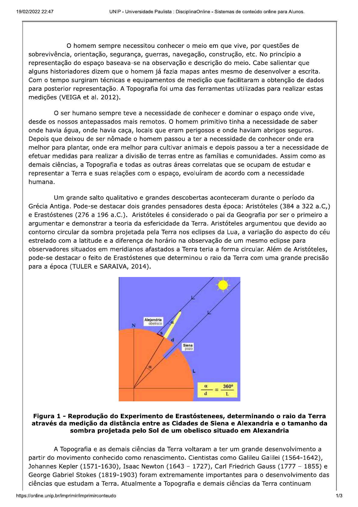 <p>19/02/2022 22:47 UNIP Universidade Paulista DisciplinaOnline Sistemas de conteúdo online para Alunos. homem sempre necessitou conhecer o meio em que vive, por questões de sobrevivência, orientação, segurança, guerras, navegação, construção, etc. No princípio a representação do espaço baseava-se na observação e descrição do meio. Cabe salientar que alguns historiadores dizem que o homem já fazia mapas antes mesmo de desenvolver a escrita. Com o tempo surgiram técnicas e equipamentos de medição que facilitaram a obtenção de dados para posterior representação. A Topografia foi uma das ferramentas utilizadas para realizar estas medições (VEIGA et al. 2012). ser humano sempre teve a necessidade de conhecer e dominar o espaço onde vive, desde os nossos antepassados mais remotos. O homem primitivo tinha a necessidade de saber onde havia água, onde havia caça, locais que eram perigosos e onde haviam abrigos seguros. Depois que deixou de ser nômade o homem passou a ter a necessidade de conhecer onde era melhor para plantar, onde era melhor para cultivar animais e depois passou a ter a necessidade de efetuar medidas para realizar a divisão de terras entre as famílias e comunidades. Assim como as demais ciências, a Topografia e todas as outras áreas correlatas que se ocupam de estudar e representar a Terra e suas relações com o espaço, evoluíram de acordo com a necessidade humana. Um grande salto qualitativo e grandes descobertas aconteceram durante o período da Grécia Antiga. Pode-se destacar dois grandes pensadores desta época: Aristóteles (384 a 322 a.C,) e Erastóstenes (276 a 196 a.C.). Aristóteles é considerado o pai da Geografia por ser o primeiro a argumentar e demonstrar a teoria da esfericidade da Terra. Aristóteles argumentou que devido ao contorno circular da sombra projetada pela Terra nos eclipses da Lua, a variação do aspecto do céu estrelado com a latitude e a diferença de horário na observação de um mesmo eclipse para observadores situados em meridianos afastados a Terra teria a forma circular. Além de Aristóteles, pode-se destacar o feito de Erastóstenes que determinou o raio da Terra com uma grande precisão para a época (TULER e SARAIVA, 2014). Alejandria N Siena L a 360° d L Figura 1 Reprodução do Experimento de Erastóstenees, determinando o raio da Terra através da medição da distância entre as Cidades de Siena e Alexandria e o tamanho da sombra projetada pelo Sol de um obelisco situado em Alexandria A Topografia e as demais ciências da Terra voltaram a ter um grande desenvolvimento a partir do movimento conhecido como renascimento. Cientistas como Galileu Galilei (1564-1642), Johannes Kepler (1571-1630), Isaac Newton (1643 1727), Carl Friedrich Gauss (1777 1855) e George Gabriel Stokes (1819-1903) foram extremamente importantes para o desenvolvimento das ciências que estudam a Terra. Atualmente a Topografia e demais ciências da Terra continuam https://online.unip.br/imprimir/imprimirconteudo 1/3</p><p>19/02/2022 22:47 UNIP Universidade Paulista : DisciplinaOnline Sistemas de conteúdo online para Alunos. evoluindo tecnicamente e principalmente tecnologicamente, com equipamentos e softwares que vem otimizando o trabalho de Topografia. Conceitos Fundamentais Etimologicamente a palavra TOPOS, em grego, significa lugar e GRAPHEN descrição, assim, de uma forma bastante simples, Topografia significa descrição do lugar. A seguir são apresentadas algumas definições de autores para a Topografia: "A Topografia tem por objetivo o estudo dos instrumentos e métodos utilizados para obter a representação gráfica de uma porção do terreno sobre uma superfície plana" (DOUBEK, 1989). "A Topografia tem por finalidade determinar o contorno, dimensão e posição relativa de uma porção limitada da superfície terrestre, sem levar em conta a curvatura resultante da esfericidade terrestre" (ESPARTEL, Segundo Tuler e Saraiva (2014) o principal objetivo da Topografia "é a obtenção da planta topográfica, para se obter a planta topográfica executam-se os levantamentos topográficos". Esse levantamento topográfico e a utilização da Topografia parte da premissa que todo levantamento é realizado sobre o plano topográfico. Este plano topográfico parte da premissa que para uma porção de espaço reduzido da Terra eu posso desconsiderar os efeitos da curvatura da Terra sobre as medições e aproximar a Terra de um plano. Com a finalidade de facilitar o estudo da Topografia a dividimos em Topometria e a Topologia. A topometria trata-se de métodos e instrumentos para avaliação de grandezas (angulares e/ou lineares) que definem os pontos topográficos (pontos no terreno em estudo) considerando os planos horizontais e verticais. Já a topologia cuida do estudo das formas do relevo, tendo como objetivo a representação e interpretação de uma planta de relevo do terreno. Podemos subdividir a topometria em planimetria, altimetria e planialtimetria. A planimetria estuda os métodos e instrumentos para medição de distâncias e direções no plano horizontal. A altimetria estuda os métodos e instrumentos para medir distâncias no plano vertical, ou seja medir as diferenças de níveis e ângulos verticais. A planialtimetria é a união das duas técnicas para obter uma planta que represente o plano topográfico com as diferenças de nível. Até que limite podemos considerar a Terra como "plana" para realização de um levantamento Topográfico? Veiga et. Al. (2012) apresenta que Considera a porção da Terra em estudo com sendo plana. É a simplificação utilizada pela Topografia. Esta aproximação é válida dentro de certos limites e facilita bastante os cálculos topográficos. Face aos erros decorrentes destas simplificações, este plano tem suas dimensões limitadas. Tem-se adotado como limite para este plano na prática a dimensão de 20 a 30 km. A NRB 13133 (Execução de Levantamento Topográfico) ad