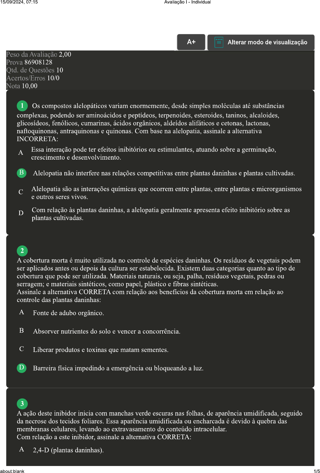 <p>15/09/2024. 07:15 Avaliação Individual A+ Alterar modo de visualização Peso da Avaliação 2,00 Prova 86908128 de Questões 10 Acertos/Erros 10/0 Nota 10,00 1 Os compostos alelopáticos variam enormemente, desde simples moléculas até substâncias complexas, podendo ser aminoácidos e terpenoides, esteroides, taninos, alcaloides, glicosídeos, fenólicos, cumarinas, ácidos orgânicos, aldeídos alifáticos e cetonas, lactonas, naftoquinonas, antraquinonas e quinonas. Com base na alelopatia, assinale a alternativa INCORRETA: A Essa interação pode ter efeitos inibitórios ou estimulantes, atuando sobre a germinação, crescimento e desenvolvimento. B Alelopatia não interfere nas relações competitivas entre plantas daninhas e plantas cultivadas. C Alelopatia são as interações químicas que ocorrem entre plantas, entre plantas e microrganismos e outros seres vivos. D Com relação às plantas daninhas, a alelopatia geralmente apresenta efeito inibitório sobre as plantas cultivadas. 2 A cobertura morta é muito utilizada no controle de espécies daninhas. Os resíduos de vegetais podem ser aplicados antes ou depois da cultura ser estabelecida. Existem duas categorias quanto ao tipo de cobertura que pode ser utilizada. Materiais naturais, ou seja, palha, resíduos vegetais, pedras ou serragem; e materiais sintéticos, como papel, plástico e fibras sintéticas. Assinale a alternativa CORRETA com relação aos benefícios da cobertura morta em relação ao controle das plantas daninhas: A Fonte de adubo orgânico. B Absorver nutrientes do solo e vencer a concorrência. C Liberar produtos e toxinas que matam sementes. D Barreira física impedindo a emergência ou bloqueando a luz. 3 A ação deste inibidor inicia com manchas verde escuras nas folhas, de aparência umidificada, seguido da necrose dos tecidos foliares. Essa aparência umidificada ou encharcada é devido à quebra das membranas levando ao extravasamento do conteúdo intracelular. Com relação a este inibidor, assinale a alternativa CORRETA: A 2,4-D (plantas daninhas). about:blank 1/5</p><p>15/09/2024, 07:15 Avaliação Individual B Protox (síntese de clorofila). C Inibidor de mitose celular. D ACCase (ácidos graxos). 4 [Laboratório Virtual Identificação de Plantas Daninhas na Cultura de Soja] As plantas daninhas são plantas indesejadas que prejudicam crescimento das culturas em geral. Geralmente, têm a característica de serem resistentes a doenças, e a sua ocorrência é um dos fatores que mais afetam a produtividade e rendimento agrícola de várias culturas. Com relação aos efeitos diretos que as plantas daninhas causam na cultura principal, neste caso a soja, assinale a alternativa CORRETA: A Interferência e perda de rendimento. B Aumento nos custos de produção. C Dificuldade de colheita. D Hospedagem de pragas e doenças. 5 [Laboratório Virtual Identificação de Plantas Daninhas na Cultura de Soja] Planta daninha de ciclo anual, que infesta lavouras anuais e perenes, desenvolvendo-se bem em qualquer tipo de solo, sobretudo em locais com temperatura e umidade elevadas, apresenta distribuição em todo território, com ampla dispersão devido capacidade de produzir uma grande quantidade de sementes, que são facilmente disseminadas pelo vento durante todo ano. Com relação à planta daninha descrita no enunciado, assinale a alternativa CORRETA: A Buva. B Capim-amargoso. C Capim-pé-de-galinha. D Caruru. 6 Com a domesticação das plantas para produção de alimentos, ocorreu uma adaptação dessas espécies vegetais aos novos ambientes e novas práticas de cultivo. Esse manejo e mudança da estrutura do ambiente nativo fez com que as espécies silvestres evoluíssem e se adaptassem aos sistemas de cultivo, tornando sua sobrevivência mais eficiente e aumentando a produtividade. Com base nas causas das adaptações evolutivas, classifique V para as sentenças verdadeiras e F para as falsas: ( ) Aumento da seleção de sementes, que se tornam inaptas em crescer fora do solo arado e preparado e dependem de semeadura. ( ) Uso extensivo de herbicidas, que levou ao desenvolvimento de mecanismos de resistência. about:blank 2/5</p><p>15/09/2024, 07:15 Avaliação Individual ( ) Redução das monoculturas, que selecionaram conjuntamente plantas daninhas especializadas. ( ) Colheita combinada da cultura e das espécies daninhas, levando a modificações que permitiram a espécie daninha ser colhida em conjunto à lavoura. Assinale a alternativa que apresenta a sequência CORRETA: A B V-V-F-V C D V-F-V-V 7 Com relação à duração da competição, podemos avaliar dois aspectos: efeito da emergência das plantas daninhas junto à planta cultivada e quanto tempo é permitido que elas cresçam juntas antes de um controle; e efeito das plantas daninhas que emergem após as plantas cultivadas já estarem estabelecidas no solo. Com base na duração da competição, classifique V para as sentenças verdadeiras e F para as falsas: ( ) O período crítico em que as espécies daninhas podem ter vantagens competitivas está relacionado primariamente com a competição por nutrientes. ( ) Podemos permitir crescimento de plantas daninhas até certo período antes que seus efeitos competitivos causem perda de produtividade. ( Podemos definir período crítico a partir do qual se não houver controle da espécie daninha, inicia-se a perda da produtividade da planta cultivada ou se a planta daninha se estabelecer após ele, não precisará ser controlada. ( ) Assim como se as plantas daninhas emergirem após certo período do cultivo já estabelecido, não haverá necessidade de controle até momento da colheita. Assinale a alternativa que apresenta a sequência CORRETA: A B V-F-V-F F-V-V-V D 8 Do ponto de vista evolutivo, as plantas daninhas representam um dos mais bem-sucedidos grupos de plantas, que evoluíram devido à perturbação humana nas áreas silvestres, seja na construção de cidades ou no desenvolvimen