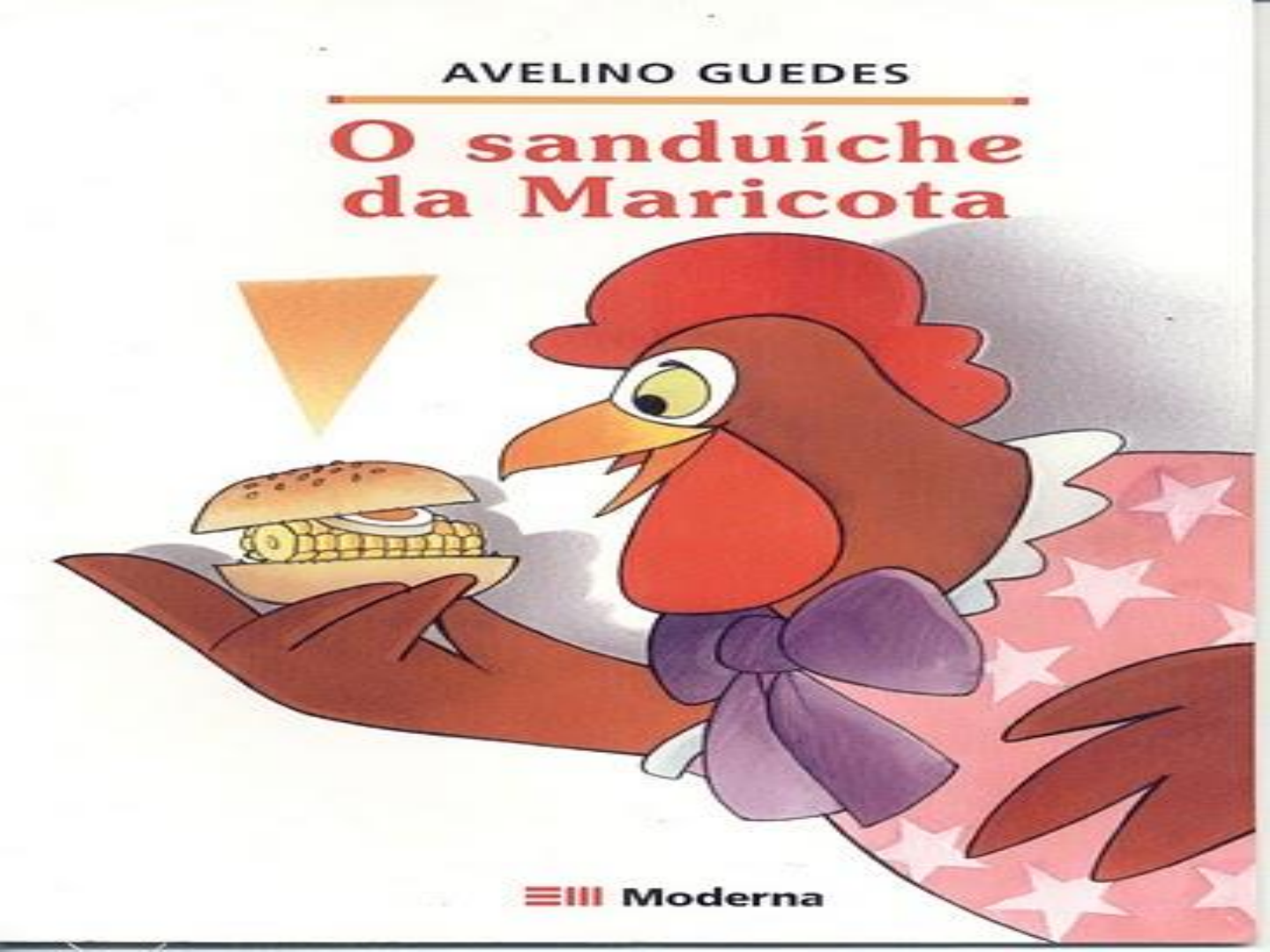 <p>AVELINO GUEDES O da Maricota Moderna</p><p>A galinha Maricota preparou um pão, milho, quirera e ovo. Mas, quando ia comer. 4 6 7</p><p>a campainha tocou. 9</p><p>Era o bode Serafim, que olhou o sanduíche e exclamou: "Vixe! Falta aí um capim". 4 10 11</p><p>chegou Kim, o gato, a galinha, vendo o Ipitou: "Falta sardinha". 13</p><p>o cão, também veio n seu jeito de bom moço. educado, sugeriu: nele um bom osso". 15</p><p>Sempre zumbindo e agitada, chegou a abelha Isabel. Olhou o esquisito recheio: "Melhora se puser mel". 0.0 4 44 17 16</p><p>a janela, ouvindo o papo, uito metido a bacana, lou, convencido, o macaco: Claro que falta banana!" 19</p><p>"Banana? Sardinha? Mel?" - era o rato Aleixo - "Milho? Osso? Capim? Argh!! Vocês esqueceram o queijo!" 20 21</p><p>A brincadeira acabou quando a raposa Celinha olhou bem pra Maricota e falou: "Falta galinha". 22 23</p><p>24 25</p><p>Maricota ficou brava: "Fora daqui, minha gente!" - jogou fora o sanduíche e começou novamente: 27 26</p><p>Pão, milho, quirera e ovo. Como era pra ter sido. Quem quiser que faça o seu com o recheio preferido. 28 29</p>