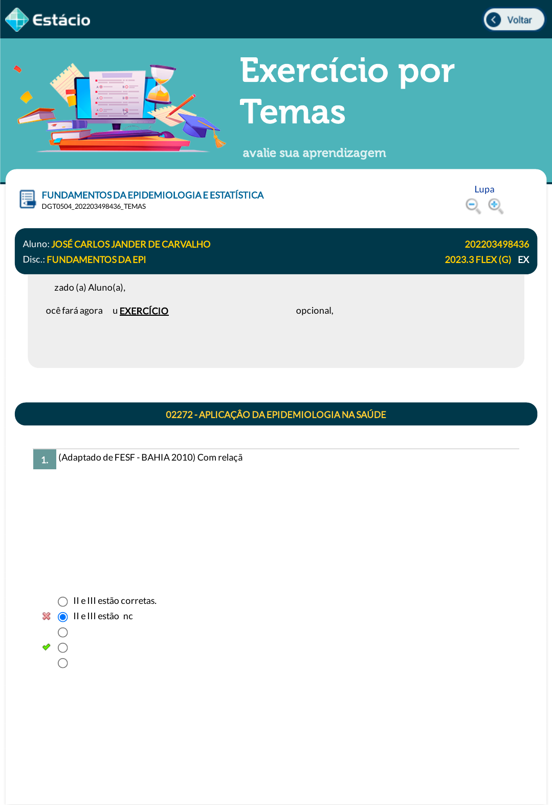 <p>15/10/2023, 14:25 Estácio: Alunos</p><p>https://simulado.estacio.br/alunos/ 1/5</p><p>Exercício por</p><p>Temas</p><p>avalie sua aprendizagem</p><p>(Adaptado de FESF - BAHIA 2010) Com relação à transição epidemiológica no Brasil, analise as assertivas e assinale</p><p>a alternativa que aponta a(s) correta(s).</p><p>I - No Brasil, velhos e novos problemas em saúde coexistem, com predominância das doenças crônico-</p><p>degenerativas, embora as doenças transmissíveis ainda desempenhem um papel importante.</p><p>II - O processo de transição epidemiológica é caracterizado pela substituição das doenças crônicas não</p><p>transmissíveis por doenças transmissíveis e pelo deslocamento da carga de morbi-mortalidade dos grupos mais</p><p>idosos aos grupos mais jovens.</p><p>III. O aumento na expectativa de vida acarreta maior possibilidade de expressão das doenças crônicas isoladas ou</p><p>múltiplas e se constitui como um dos fatores que acelera o processo de transição epidemiológica.</p><p>FUNDAMENTOS DA EPIDEMIOLOGIA E ESTATÍSTICA</p><p>Lupa</p><p>DGT0504_202203498436_TEMAS</p><p>Aluno: JOSÉ CARLOS JANDER DE CARVALHO Matr.: 202203498436</p><p>Disc.: FUNDAMENTOS DA EPI 2023.3 FLEX (G) / EX</p><p>Prezado (a) Aluno(a),</p><p>Você fará agora seu EXERCÍCIO! Lembre-se que este exercício é opcional, mas não valerá ponto para sua avaliação. O</p><p>mesmo será composto de questões de múltipla escolha.</p><p>Após responde cada questão, você terá acesso ao gabarito comentado e/ou à explicação da mesma. Aproveite para se</p><p>familiarizar com este modelo de questões que será usado na sua AV e AVS.</p><p>02272 - APLICAÇÂO DA EPIDEMIOLOGIA NA SAÚDE</p><p>1.</p><p>II e III estão corretas.</p><p>II e III estão incorretas.</p><p>I e II estão corretas</p><p>I e III estão corretas.</p><p>Somente a III está correta.</p><p>Data Resp.: 15/10/2023 14:24:48</p><p>Explicação:</p><p>Predomina no cenário epidemiológico brasileiro atual as doenças crônicas não degenerativas, no entanto, ainda</p><p>é alta a carga das doenças transmissíveis. O processo de transição epidemiológica brasileiro passou justamente</p><p>pela diminuição da morbimortalidade das doenças infecciosas e aumento das doenças crônicas, especialmente</p><p>às ligadas ao aparelho cardio-vasculhar. O aumento da expectativa de vida da população também contribui para</p><p>o processo de transição epidemiológica.</p><p>javascript:voltar();</p><p>javascript:voltar();</p><p>javascript:voltar();</p><p>javascript:voltar();</p><p>javascript:diminui();</p><p>javascript:diminui();</p><p>javascript:aumenta();</p><p>javascript:aumenta();</p><p>15/10/2023, 14:25 Estácio: Alunos</p><p>https://simulado.estacio.br/alunos/ 2/5</p><p>A promoção da saúde é apontada como uma das melhores estratégias para a redução das iniquidades da saúde e</p><p>para a construção de uma sociedade mais saudável. Portanto, a responsabilidade da promoção da saúde,</p><p>(CEFET BAHIA Prefeitura de Barreiras - 2019) Ao tomar como referência o conceito ampliado de saúde,</p><p>encontram-se, nos Determinantes Sociais da Saúde (DSS), elementos essenciais que contribuem para uma maior</p><p>compreensão de como a saúde é sensível ao ambiente social. Os DSS funcionam como um elemento de justiça</p><p>social, sendo assim, um importante desa�o da saúde coletiva (CEBALLOS, 2015). Em relação aos DSS, é correto</p><p>a�rmar que:</p><p>(Adaptado de IADES - 2018 - SES-DF)</p><p>O Brasil foi o primeiro país a criar a própria Comissão Nacional sobre Determinantes Sociais da Saúde (CNDSS),</p><p>integrando-se ao movimento global em torno dos determinantes sociais da saúde (DSS), desencadeado pela</p><p>Organização Mundial da Saúde (OMS). Quanto aos DSS e o relatório �nal da CNDSS, analise as alternativas assinale</p><p>a alternativa correta.</p><p>2.</p><p>é de cada indivíduo e da comunidade onde vive.</p><p>cabe ao setor cultural e saúde.</p><p>é exclusivamente do setor saúde.</p><p>depende da situação econômica de cada município para disponibilizar os recursos para as ações sanitárias.</p><p>é resultado de um conjunto de fatores sociais, econômicos, políticos e culturais, coletivos e individuais.</p><p>Data Resp.: 15/10/2023 14:24:51</p><p>Explicação:</p><p>A promoção da saúde envolve a articulação de diferentes áreas, incluindo a social, econômica, política, cultural,</p><p>coletiva e individual. O fomento da prática de exercícios físicos pode ser entendido como promoção da saúde e</p><p>tem sido estimulado por muitos municípios pelo país a partir da criação de academias populares. Assim, não</p><p>podemos dizer que a promoção da saúde é exclusividade de um setor apenas e nem da comunidade em que ele</p><p>vive.</p><p>3.</p><p>o suporte social tem pouca in�uência no nível de saúde das pessoas, embora boas relações sociais e redes</p><p>fortes de apoio aumentem a saúde.</p><p>o gradiente social in�uencia na expectativa de vida, de modo que esta é maior e as doenças são menos</p><p>comuns, quanto mais baixa for a posição na escala social.</p><p>altas taxas de desemprego não guardam qualquer relação com uma maior ocorrência de doenças e mortes</p><p>prematuras nas pessoas.</p><p>os comportamentos, escolhas e hábitos individuais de saúde não interferem no nível de saúde das pessoas,</p><p>pois este depende da classe social de cada um.</p><p>circunstâncias estressantes, com contínua ansiedade, insegurança e isolamento social, têm poderosos efeitos</p><p>sobre a saúde e podem contribuir para uma morte prematura.</p><p>Data Resp.: 15/10/2023 14:24:54</p><p>Explicação:</p><p>A condição de saúde das pessoas pode ser impactada pelos determinantes sociais da saúde. Os determinantes de</p><p>origem psicossocial também têm grande in�uência na saúde. O estresse prolongado, a ansiedade e a violência</p><p>são 