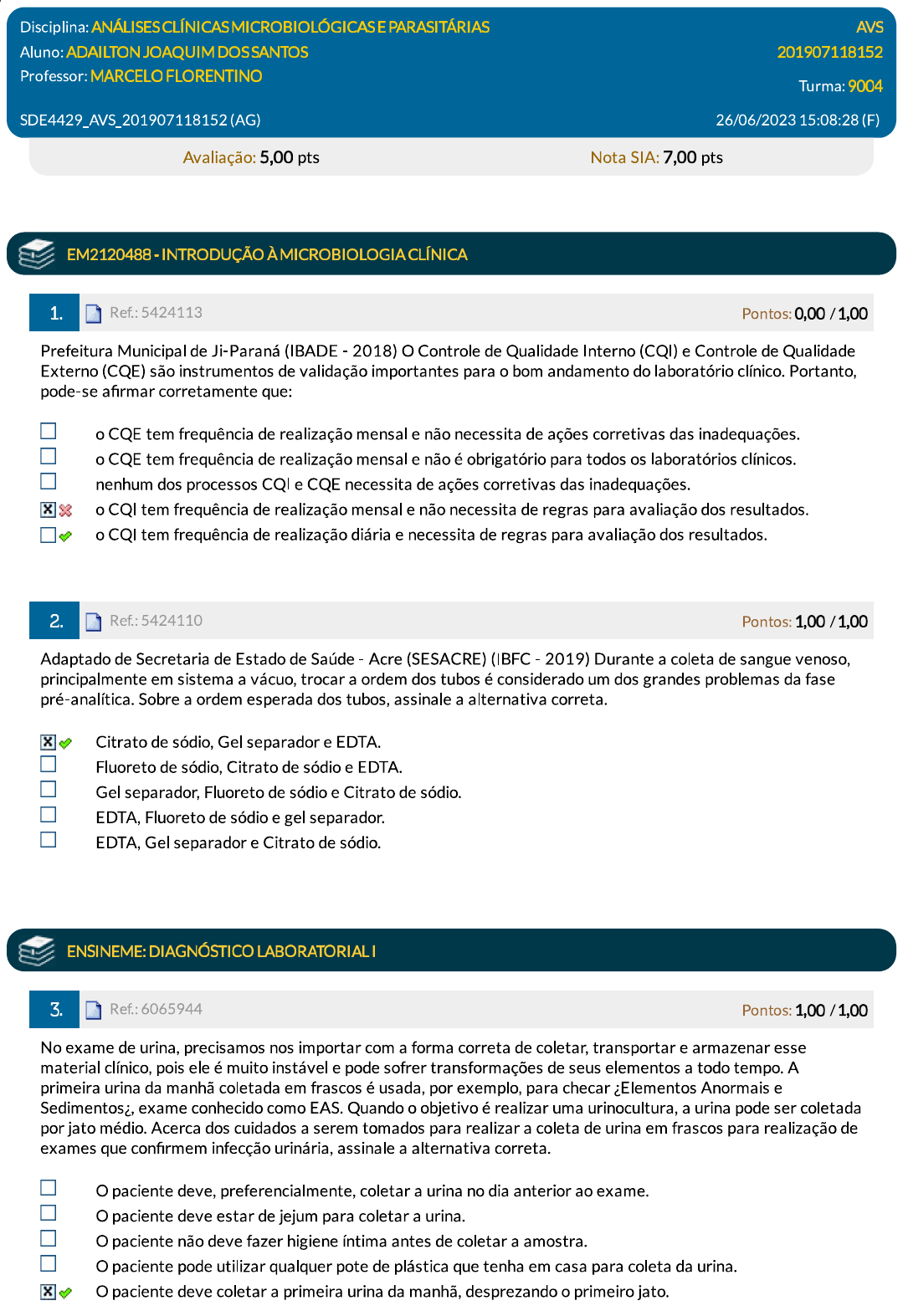 <p>Disciplina: ANÁLISES PARASITÁRIAS AVS Aluno: ADAILTON JOAQUIM DOSSANTOS 201907118152 Professor: MARCELO FLORENTINO Turma: 9004 SDE4429_AVS_201907118152(AG) 26/06/2023 15:08:28 (F) Avaliação: 5,00 pts Nota SIA: 7,00 pts EM2120488 INTRODUÇÃO À MICROBIOLOGIACLÍNICA 1. 5424113 Pontos: Prefeitura Municipal de Ji-Paraná (IBADE 2018) Controle de Qualidade Interno (CQI) e Controle de Qualidade Externo (CQE) são instrumentos de validação importantes para o bom andamento do laboratório clínico. Portanto, pode-se afirmar corretamente que: o CQE tem frequência de realização mensal e não necessita de ações corretivas das inadequações. o CQE tem frequência de realização mensal e não é obrigatório para todos os laboratórios clínicos. nenhum dos processos CQI e CQE necessita de ações corretivas das inadequações. o CQI tem frequência de realização mensal e não necessita de regras para avaliação dos resultados. o CQI tem frequência de realização diária e necessita de regras para avaliação dos resultados. 2. Ref.: 5424110 Pontos: Adaptado de Secretaria de Estado de Saúde Acre (SESACRE) (IBFC 2019) Durante a coleta de sangue venoso, principalmente em sistema a vácuo, trocar a ordem dos tubos é considerado um dos grandes problemas da fase pré-analítica. Sobre a ordem esperada dos tubos, assinale a alternativa correta. Citrato de sódio, Gel separador e EDTA. Fluoreto de sódio, Citrato de sódio e EDTA. Gel separador, Fluoreto de sódio e Citrato de sódio. EDTA, Fluoreto de sódio e gel separador. EDTA, Gel separador e Citrato de sódio. ENSINEME: DIAGNÓSTICO LABORATORIAL 3. Ref.: 6065944 Pontos: No exame de urina, precisamos nos importar com a forma correta de coletar, transportar e armazenar esse material clínico, pois ele é muito instável e pode sofrer transformações de seus elementos a todo tempo. A primeira urina da manhã coletada em frascos é usada, por exemplo, para checar ¿Elementos Anormais e exame conhecido como EAS. Quando o objetivo é realizar uma urinocultura, a urina pode ser coletada por jato médio. Acerca dos cuidados a serem tomados para realizar a coleta de urina em frascos para realização de exames que confirmem infecção urinária, assinale a alternativa correta. paciente deve, preferencialmente, coletar a urina no dia anterior ao exame. paciente deve estar de jejum para coletar a urina. paciente não deve fazer higiene íntima antes de coletar a amostra. paciente pode utilizar qualquer pote de plástica que tenha em casa para coleta da urina paciente deve coletar a primeira urina da manhã, desprezando o primeiro jato.</p><p>ENSINEME: DIAGNÓSTICO LABORATORIAL 4. Ref.: 3993059 Pontos: 0,00 /1,00 Entre as diferentes provas bioquímicas utilizadas para identificação de bactérias, qual destas tem como objetivo observar a fermentação de açúcares? Ágar TSI. Degradação da ureia. Teste da oxidase. Prova VP. Descarboxilação de aminoácidos. 5. Ref.: 7805240 Pontos: 0,00 / 1,00 As culturas nas amostras de fezes são conhecidas como coproculturas, que é um método utilizado no diagnóstico de enterobactérias intestinais patogênicas. O método de rotina visa à detecção, principalmente, das enterobactérias: Bactérias saprófitas e Mycobacterium. Salmonelas e fungos leveduriformes. Mycobacterium e Escherichia coli Bactérias saprófitas e Escherichia coli. Salmonelas e Escherichia coli. ENSINEME: INTRODUÇÃO PARASITOLÓGICAS 6. Ref.: 4104279 Pontos: 0,00 / 1,00 Uma mulher apresentou todos os sintomas de toxoplasmose e para confirmação diagnóstica foi realizado o teste de ELISA para detecção de anticorpos da classe IgM e IgG. No entanto, o resultado foi negativo e o médico garantiu que ela não estava doente. O médico está certo? Sim, pois esse método apresenta grande sensibilidade e especificidade e é o padrão ouro para esse diagnóstico. Não, pois o método de escolha foi errado, o médico deveria ter feito um exame de fezes pelo método de Wills. Não, pois o método de escolha foi errado, o médico deveria ter feito um exame de fezes pelo método de Faust. Não, pois após o contato com o parasita, o organismo produz anticorpos, mas a detecção demora um período que é chamado janela imunológica e a paciente pode estar nesse período. Sim, pois esse método é utilizado para a detecção de anticorpos e assim que temos o contato com o parasita eles já são produzidos e detectados. ENSINEME: DE</p><p>7. Ref.: 4104319 Pontos: 1,00 / 1,00 Enterobius vermicularisé um parasito que possui um único hospedeiro. A passagem do parasito de uma pessoa para outra faz-se pela transferência dos ovos, que devem permanecer pelo menos algumas horas no meio exterior para tornarem-se infectantes. Sobre as formas de transmissão de E. vermicularis, está correto afirmar que: Os ovos que ficam retidos na região perianal não desenvolvem sua capacidade infectante. A forma de infecção mais frequente é por meio da ingestão de carne de boi ou porco mal cozidas. A infecção de um novo hospedeiro dá-se geralmente pela inalação ou ingestão dos ovos disseminados por via aérea. A taxa de autoinfecção é muito baixa devido aos anticorpos formados. A transmissão indireta da região anal para a boca, através das mãos contaminadas, não ocorre com frequência. ENSINEME: PLATELMINTOS DE 8. Ref.: 3992583 Pontos: 1,00 / 1,00 Com relação aos parasitas e às doenças que causam, pode-se afirmar que I. A larva cercária, do Schistosoma mansoni, penetra no homem pela pele, causando-lhe a II. A teníase é doença causada pela Taenia solium ou pela Taenia saginata. III. A cisticercose é doença causada pela larva da Taenia solium. IV. A fasciolíase é uma doença causada pelo Ascaris lumbricoides. V. saneamento básico pode interferir na transmissão de verminoses Estão corretas: apenas e apenas V apenas I, II, III e V apenas I, e III apenas e III ENSINEME: PROTOZOÁRIOS DE VIAS DIGESTIVASE GENITURINÁRIAS DE IM