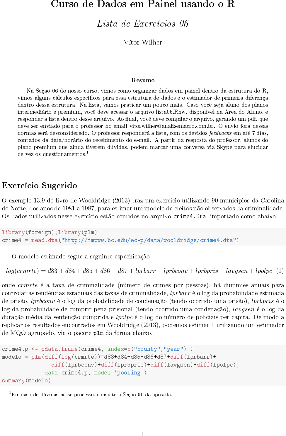 <p>Curso de Dados em Painel usando o R</p><p>Lista de Exercícios 06</p><p>Vítor Wilher</p><p>Resumo</p><p>Na Seção 06 do nosso curso, vimos como organizar dados em painel dentro da estrutura do R,</p><p>vimos alguns cálculos especí�cos para essa estrutura de dados e o estimador de primeira diferença</p><p>dentro dessa estrutura. Na lista, vamos praticar um pouco mais. Caso você seja aluno dos planos</p><p>intermediário e premium, você deve acessar o arquivo lista06.Rnw, disponível na Área do Aluno, e</p><p>responder a lista dentro desse arquivo. Ao �nal, você deve compilar o arquivo, gerando um pdf, que</p><p>deve ser enviado para o professor no email vitorwilher@analisemacro.com.br. O envio fora dessas</p><p>normas será desconsiderado. O professor responderá a lista, com os devidos feedbacks em até 7 dias,</p><p>contados da data/horário do recebimento do e-mail. A partir da resposta do professor, alunos do</p><p>plano premium que ainda tiverem dúvidas, podem marcar uma conversa via Skype para elucidar</p><p>de vez os questionamentos.1</p><p>Exercício Sugerido</p><p>O exemplo 13.9 do livro de Wooldridge (2013) traz um exercício utilizando 90 municipios da Carolina</p><p>do Norte, dos anos de 1981 a 1987, para estimar um modelo de efeitos não observados da criminalidade.</p><p>Os dados utilizados nesse exercício estão contidos no arquivo crime4.dta, importado como abaixo.</p><p>library(foreign);library(plm)</p><p>crime4 = read.dta("http://fmwww.bc.edu/ec-p/data/wooldridge/crime4.dta")</p><p>O modelo estimado segue a seguinte especi�cação</p><p>log(crmrte) = d83 + d84 + d85 + d86 + d87 + lprbarr + lprbconv + lprbpris+ lavgsen+ lpolpc (1)</p><p>onde crmrte é a taxa de criminalidade (número de crimes por pessoas), há dummies anuais para</p><p>controlar as tendências estaduais das taxas de criminalidade, lprbarr é o log da probabilidade estimada</p><p>de prisão, lprbconv é o log da probabilidade de condenação (tendo ocorrido uma prisão), lprbpris é o</p><p>log da probabilidade de cumprir pena prisional (tendo ocorrido uma condenação), lavgsen é o log da</p><p>duração média da sentenção cumprida e lpolpc é o log do número de policiais per capita. De modo a</p><p>replicar os resultados encontrados em Wooldridge (2013), podemos estimar 1 utilizando um estimador</p><p>de MQO agrupado, via o pacote plm da forma abaixo.</p><p>crime4.p <- pdata.frame(crime4, index=c("county","year") )</p><p>modelo = plm(diff(log(crmrte))~d83+d84+d85+d86+d87+diff(lprbarr)+</p><p>diff(lprbconv)+diff(lprbpris)+diff(lavgsen)+diff(lpolpc),</p><p>data=crime4.p, model='pooling')</p><p>summary(modelo)</p><p>1Em caso de dúvidas nesse processo, consulte a Seção 01 da apostila.</p><p>1</p><p>## Pooling Model</p><p>##</p><p>## Call:</p><p>## plm(formula = diff(log(crmrte)) ~ d83 + d84 + d85 + d86 + d87 +</p><p>## diff(lprbarr) + diff(lprbconv) + diff(lprbpris) + diff(lavgsen) +</p><p>## diff(lpolpc), data = crime4.p, model = "pooling")</p><p>##</p><p>## Balanced Panel: n = 90, T = 6, N = 540</p><p>##</p><p>## Residuals:</p><p>## Min. 1st Qu. Median 3rd Qu. Max.</p><p>## -0.6593588 -0.0783777 0.0029582 0.0750358 0.6830594</p><p>##</p><p>## Coefficients:</p><p>## Estimate Std. Error t-value Pr(>|t|)</p><p>## (Intercept) 0.0077130 0.0170579 0.4522 0.65133</p><p>## d83 -0.0998652 0.0238952 -4.1793 3.421e-05 ***</p><p>## d84 -0.0479370 0.0235021 -2.0397 0.04188 *</p><p>## d85 -0.0046109 0.0234998 -0.1962 0.84452</p><p>## d86 0.0275145 0.0241494 1.1393 0.25507</p><p>## d87 0.0408273 0.0244153 1.6722 0.09508 .</p><p>## diff(lprbarr) -0.3274947 0.0299801 -10.9237 < 2.2e-16 ***</p><p>## diff(lprbconv) -0.2381065 0.0182341 -13.0583 < 2.2e-16 ***</p><p>## diff(lprbpris) -0.1650459 0.0259690 -6.3555 4.488e-10 ***</p><p>## diff(lavgsen) -0.0217608 0.0220909 -0.9851 0.32505</p><p>## diff(lpolpc) 0.3984263 0.0268820 14.8213 < 2.2e-16 ***</p><p>## ---</p><p>## Signif. codes: 0 '***' 0.001 '**' 0.01 '*' 0.05 '.' 0.1 ' ' 1</p><p>##</p><p>## Total Sum of Squares: 22.197</p><p>## Residual Sum of Squares: 12.596</p><p>## R-Squared: 0.43251</p><p>## Adj. R-Squared: 0.42179</p><p>## F-statistic: 40.3182 on 10 and 529 DF, p-value: < 2.22e-16</p><p>Uma vez estimado o modelo, pede-se que você interprete cada um dos coe�cientes e seu efeito sobre</p><p>a taxa de criminalidade.</p><p>Referências</p><p>Wooldridge, J. M. Introductory Econometrics: A Modern Approach. Editora Cengage, 2013.</p><p>2</p>