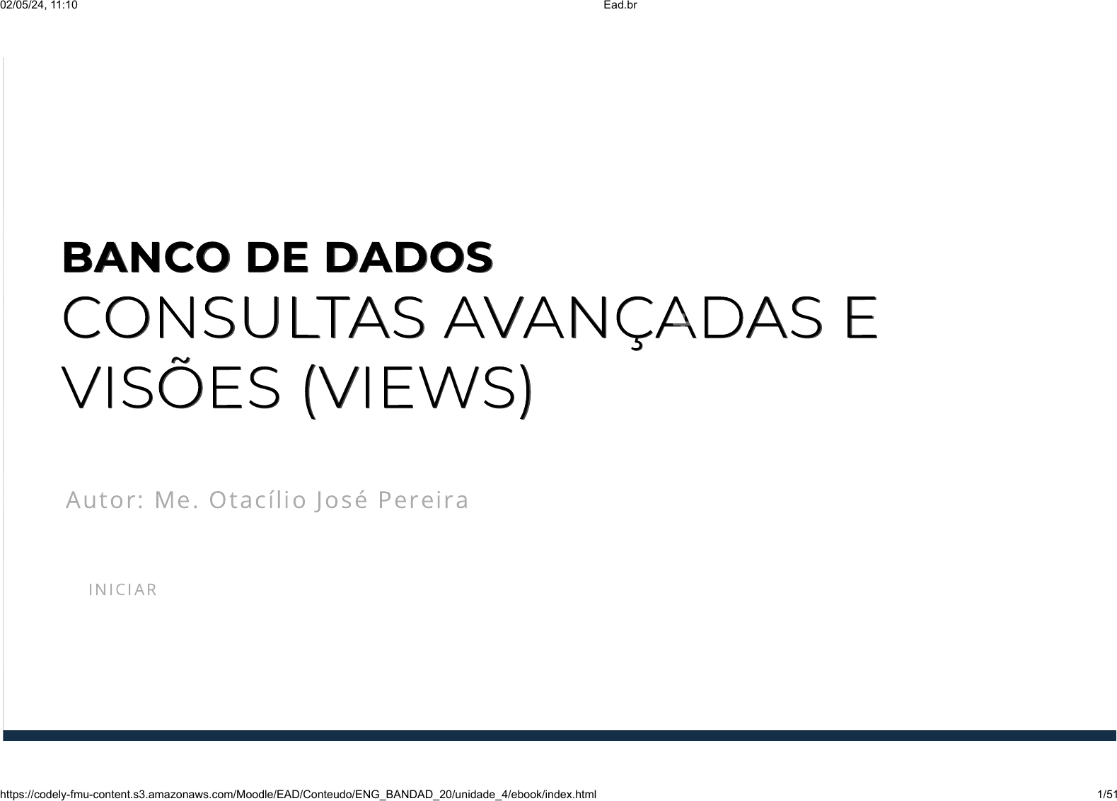 <p>BANCO DE DADOSBANCO DE DADOS</p><p>CONSULTAS AVANÇADAS ECONSULTAS AVANÇADAS E</p><p>VISÕES (VIEWS)VISÕES (VIEWS)</p><p>Autor: Me. Otacíl io José Pereira</p><p>IN IC IAR</p><p>02/05/24, 11:10 Ead.br</p><p>https://codely-fmu-content.s3.amazonaws.com/Moodle/EAD/Conteudo/ENG_BANDAD_20/unidade_4/ebook/index.html 1/51</p><p>introdução</p><p>Introdução</p><p>Quando estamos estudando banco de dados, ao iniciar com consultas exploramos os recursos do</p><p>comando SELECT para os primeiros resultados que em geral já são interessantes.</p><p>Esta unidade visa evoluir a construção de consultas com recursos mais avançados associados a este</p><p>comando de SELECT. Serão vistos tópicos como junções, comandos para ordenação e agrupamento</p><p>dos dados, uso de funções de agregação como somatórios e contabilizações e por �m como criar</p><p>visões (views) para tornar mais fácil e prático a manipulação de consultas.</p><p>Todos estes recursos são bem úteis em tarefas cotidianas de produzir relatórios e atender</p><p>demandas de usuários que precisam extrair informação e conhecimento mais apurado a partir do</p><p>banco de dados.</p><p>Vamos em frente!</p><p>02/05/24, 11:11 Ead.br</p><p>https://codely-fmu-content.s3.amazonaws.com/Moodle/EAD/Conteudo/ENG_BANDAD_20/unidade_4/ebook/index.html 2/51</p><p>02/05/24, 11:11 Ead.br</p><p>https://codely-fmu-content.s3.amazonaws.com/Moodle/EAD/Conteudo/ENG_BANDAD_20/unidade_4/ebook/index.html 3/51</p><p>Em um primeiro momento no aprendizado com comandos de DML como o SELECT o foco é</p><p>selecionar os dados de uma tabela, por exemplo, quais os clientes do sexo feminino, entretanto é</p><p>mais comum precisarmos de dados que estão presentes em diversas tabelas. Se a estruturação dos</p><p>dados divide cada registro em sua respectiva tabela, Clientes, Compras, Cidades, Produtos, ao</p><p>recuperar estes dados é preciso de alguma forma para juntá-los.</p><p>JunçõesJunções</p><p>02/05/24, 11:11 Ead.br</p><p>https://codely-fmu-content.s3.amazonaws.com/Moodle/EAD/Conteudo/ENG_BANDAD_20/unidade_4/ebook/index.html 4/51</p><p>Vamos analisar um exemplo que envolve uma loja virtual, com seus dados de clientes, cidades e de</p><p>compras. Parte do modelo está exposto a seguir na Figura 4.1. Imagine que haja a necessidade de</p><p>saber quais clientes (Nome e Contato) com suas respectivas Cidades (Dcr_Cidade) e que realizaram</p><p>compras no mês de abril (campo Data_Compra em Compras), talvez para fazer um contato e saber</p><p>se o cliente está satisfeito com a compra. Perceba que Nome e Contato estão na tabela Cliente, a</p><p>descrição da cidade está em Cidade e Data e Valor estão na tabela de Compras. Fica então a</p><p>questão, como colocar estes dados juntos?</p><p>Figura 4.1 - Parte de modelo de exemplo do cenário de Loja Virtual</p><p>Fonte: Elaborado pelo autor (2019).</p><p>Um primeiro raciocínio é partirmos da ideia da chave estrangeira, ao estudar sobre a modelagem</p><p>dos dados elas surgem como forma de representar os relacionamentos entre entidades (no Modelo</p><p>de Entidade e Relacionamento) e tabelas (no Modelo Relacional), servem como elo entre as duas</p><p>02/05/24, 11:11 Ead.br</p><p>https://codely-fmu-content.s3.amazonaws.com/Moodle/EAD/Conteudo/ENG_BANDAD_20/unidade_4/ebook/index.html 5/51</p><p>tabelas em que há um relacionamento 1:N por exemplo. Portanto, as chaves estrangeiras</p><p>desempenham um papel chave para fazer as junções dos dados.</p><p>Primeiro exemplo de junção (Inner Join)</p><p>Para compreender melhor este uso das chaves estrangeiras, vamos para um exemplo. Observe a</p><p>Figura 4.2, do lado esquerdo temos um conjunto de resultados provenientes da tabela Cliente. À</p><p>direita encontram-se as cidades cadastradas na tabela Cidade. Como transformar, na linha com</p><p>nome ‘Adriana Araújo’, o valor de código da cidade 1 na descrição da Cidade ‘Salvador’? É necessário</p><p>um mecanismo que faça com que a chave estrangeira 1 seja consultada (via junção) na tabela de</p><p>cidade. Aproveite esta lista de clientes para perceber que existem valores que não possuem a cidade</p><p>associada (valores NULL), no caso os clientes ‘Rodrigo Vieira’ e ‘Fabiana Moreira’, eles não devem</p><p>conseguir participar da junção pois não terão valores correspondentes na outra tabela.</p><p>02/05/24, 11:11 Ead.br</p><p>https://codely-fmu-content.s3.amazonaws.com/Moodle/EAD/Conteudo/ENG_BANDAD_20/unidade_4/ebook/index.html 6/51</p><p>Figura 4.2 - Exemplo de duas tabelas dissociadas</p><p>Fonte: Elaborado pelo autor (2019).</p><p>O mecanismo para resolver esta necessidade é a junção entre tabelas, e um primeiro tipo é a junção</p><p>interna ou “inner join” cuja sentença está escrita no Quadro 4.1. A ideia é para cada código de cidade</p><p>em Cliente buscar na tabela de Cidade a linha que contém o mesmo código, isto é, o campo</p><p>Cod_Cidade serve como elo entre as duas tabelas.</p><p>02/05/24, 11:11 Ead.br</p><p>https://codely-fmu-content.s3.amazonaws.com/Moodle/EAD/Conteudo/ENG_BANDAD_20/unidade_4/ebook/index.html 7/51</p><p>O resultado deste comando de junção pode ser visualizado a seguir na Figura 4.3, compare com as</p><p>tabelas Cliente e Cidade dissociadas da Figura 4.2, cada registro tem agora a descrição da cidade</p><p>equivalente ao código que foi usado na junção. O registro de ‘Adriana Araújo’ com código de cidade</p><p>3, foi associado ou juntado com a descrição ‘Salvador’ vinda da tabela de Cidade. Perceba também</p><p>que apenas 8 linhas foram recuperadas e existem 10 clientes, o que ocorre é que os clientes sem</p><p>valores no campo cidade (NULL) não conseguem fazer a junção.</p><p>Quadro 4.1 - Exemplo de Inner Join</p><p>Fonte: Elaborado pelo autor.</p><p>02/05/24, 11:11 Ead.br</p><p>https://codely-fmu-content.s3.amazonaws.com/Moodle/EAD/Conteudo/ENG_BANDAD_20/unidade_4/ebook/index.html 8/51<