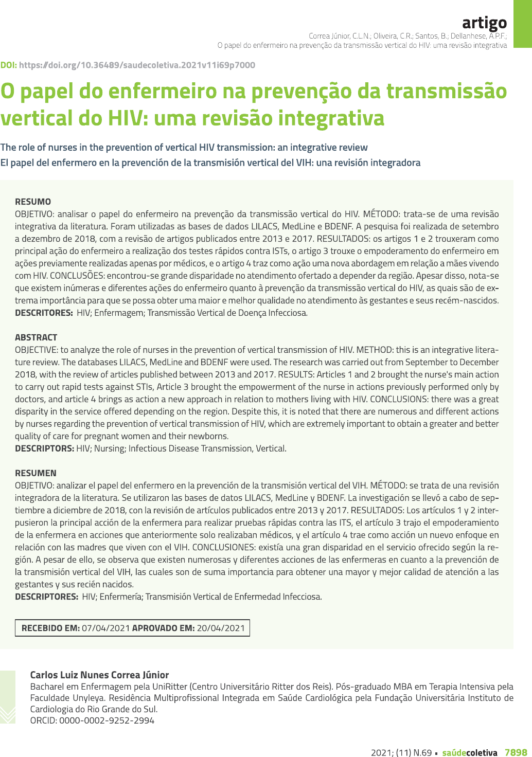 <p>artigo Correa Júnior, C.L.N.; Oliveira, C.R.; Santos, Dellanhese, A.P.F.; papel do enfermeiro na prevenção da transmissão vertical do HIV: uma revisão integrativa DOI: https://doi.org/10.36489/saudecoletiva.2021v11i69p7000 papel do enfermeiro na prevenção da transmissão vertical do HIV: uma revisão integrativa The role of nurses in the prevention of vertical HIV transmission: an integrative review El papel del enfermero en la prevención de la transmisión vertical del VIH: una revisión integradora RESUMO OBJETIVO: analisar o papel do enfermeiro na prevenção da transmissão vertical do HIV. MÉTODO: trata-se de uma revisão integrativa da literatura. Foram utilizadas as bases de dados LILACS, MedLine e BDENF. A pesquisa foi realizada de setembro a dezembro de 2018, com a revisão de artigos publicados entre 2013 e 2017. RESULTADOS: os artigos 1 e 2 trouxeram como principal ação do enfermeiro a realização dos testes rápidos contra ISTs, o artigo 3 trouxe o empoderamento do enfermeiro em ações previamente realizadas apenas por médicos, e o artigo 4 traz como ação uma nova abordagem em relação a mães vivendo com HIV. CONCLUSÕES: encontrou-se grande disparidade no atendimento ofertado a da região. Apesar disso, nota-se que existem inúmeras e diferentes ações do enfermeiro quanto à prevenção da transmissão vertical do HIV, as quais são de ex- trema importância para que se possa obter uma maior e melhor qualidade no atendimento às gestantes e seus recém-nascidos. DESCRITORES: HIV; Enfermagem; Transmissão Vertical de Doença Infecciosa. ABSTRACT OBJECTIVE: to analyze the role of nurses in the prevention of vertical transmission of HIV. METHOD: this is an integrative litera- ture review. The databases LILACS, MedLine and BDENF were used. The research was carried out from September to December 2018, with the review of articles published between 2013 and 2017. RESULTS: Articles 1 and 2 brought the nurse's main action to carry out rapid tests against STIs, Article 3 brought the empowerment of the nurse in actions previously performed only by doctors, and article 4 brings as action a new approach in relation to mothers living with HIV. CONCLUSIONS: there was a great disparity in the service offered depending on the region. Despite this, it is noted that there are numerous and different actions by nurses regarding the prevention of vertical transmission of HIV, which are extremely important to obtain a greater and better quality of care for pregnant women and their newborns. DESCRIPTORS: HIV; Nursing; Infectious Disease Transmission, Vertical. RESUMEN OBJETIVO: analizar el papel del enfermero en la prevención de la transmisión vertical del VIH. MÉTODO: se trata de una revisión integradora de la literatura. Se utilizaron las bases de datos LILACS, MedLine y BDENF. La investigación se llevó a cabo de sep- tiembre a diciembre de 2018, con la revisión de artículos publicados entre 2013 y 2017. RESULTADOS: Los artículos 1 y 2 inter- pusieron la principal acción de la enfermera para realizar pruebas rápidas contra las ITS, el artículo 3 trajo el empoderamiento de la enfermera en acciones que anteriormente solo realizaban médicos, y el artículo 4 trae como acción un nuevo enfoque en relación con las madres que viven con el VIH. CONCLUSIONES: una gran disparidad en el servicio ofrecido según la re- gión. A pesar de ello, se observa que existen numerosas y diferentes acciones de las enfermeras en cuanto a la prevención de la transmisión vertical del VIH, las cuales son de suma importancia para obtener una mayor y mejor calidad de atención a las gestantes y sus recién nacidos. DESCRIPTORES: HIV; Enfermería; Transmisión Vertical de Enfermedad Infecciosa. RECEBIDO EM: 07/04/2021 APROVADO EM: 20/04/2021 Carlos Luiz Nunes Correa Júnior Bacharel em Enfermagem pela UniRitter (Centro Universitário Ritter dos Reis). Pós-graduado MBA em Terapia Intensiva pela Faculdade Unyleya. Residência Multiprofissional Integrada em Saúde Cardiológica pela Fundação Universitária Instituto de Cardiologia do Rio Grande do Sul. ORCID: 0000-0002-9252-2994 2021; (11) N.69 saúdecoletiva 7898</p><p>artigo Correa Júnior, Oliveira, C.R., Santos, Dellanhese, A.P.F.; papel do enfermeiro na prevenção da transmissão vertical do HIV: uma revisão integrativa Cláudia Rodrigues de Oliveira Bacharel em Enfermagem pela Unirriter. Enfermeira Sanitarista na Clínica da Família Campo da Tuca, Porto Alegre-RS. ORCID: 0000-0003-0074-9495 Bruna dos Santos Bacharel em Biomedicina pela Universidade Federal do Rio Grande do Sul (UFRGS). Residente na Residência Multiprofissional em Saúde Coletiva da UFRGS. ORCID: 0000-0002-8477-5692 Amanda Pereira Ferreira Dellanhese Gerente da Clínica da Família Campo da Tuca, Porto Alegre-RS. Doutora em Saúde da Criança e do Adolescente pela UFRGS. Docente Colaboradora da Residência Integrada Multiprofissional em Saúde Coletiva da UFRGS. ORCID: 0000-0002-1515-9693 INTRODUÇÃO to de 23,8% na taxa de detecção de HIV No entanto, na assistência à saúde há di- em gestantes: em 2017, foram notificadas versos fatores que dificultam a implemen- A epidemia do vírus da imunodefi- 7.882 gestantes infectadas pelo HIV no tação de intervenções contra a transmissão ciência humana (HIV) representa Brasil, sendo 2,8 casos/mil de nascidos vertical do HIV, sendo algumas delas a um grande problema de saúde pú- Cerca de 35% dessas transmissões baixa cobertura de pré-natal e assistência blica. Segundo o relatório de estatística da ocorrem durante a gestação, 65% ocorrem ao parto, despreparo ou desatualização dos UNAIDS1, desde o início da epidemia em no peri-parto e há um risco de 7 a 22% de profissionais em relação a protocolos de 1980, cerca de 75,7 milhões de pessoas fo- transmissão vertical através da amamenta- cuidado, além de questões sociais que ge- ram infectadas pelo HIV. Sabe-se que há Sem o adequado tratamento du