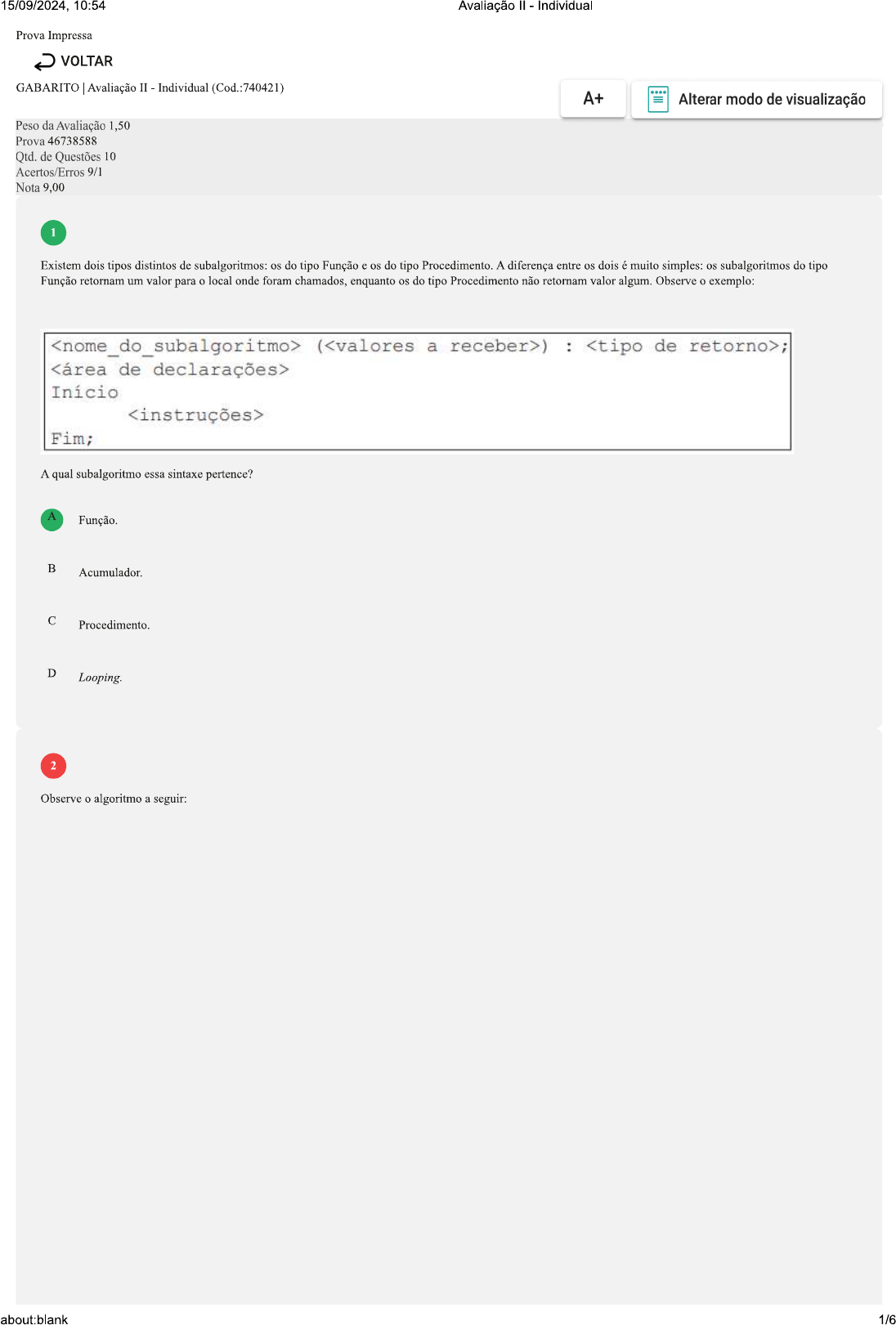 <p>15/09/2024, 10:54 Avaliação - Individual Prova Impressa VOLTAR GABARITO Avaliação II - Individual (Cod.:740421) A+ Alterar modo de visualização Peso da Avaliação 1,50 Prova 46738588 Qtd. de Questões 10 Acertos/Erros 9/1 Nota 9,00 1 Existem dois tipos distintos de subalgoritmos: os do tipo Função e os do tipo Procedimento. A diferença entre os dois é muito simples: os subalgoritmos do tipo Função retornam um valor para o local onde foram chamados, enquanto os do tipo Procedimento não retornam valor algum. Observe o exemplo: (<valores a receber>) : <tipo de retorno>; <área de declarações> Início <instruções> Fim; A qual subalgoritmo essa sintaxe pertence? Função. B Acumulador. C Procedimento. D Looping. 2 Observe o algoritmo a seguir: about:blank 1/6</p><p>15/09/2024, 10:54 Avaliação Individual 1 Algoritmo Calcula Media; 2 var 3 { Variáveis para armazenar três notas e a média calculada} 4 Notal, Nota2, Nota3, Media : 5 6 Início 7 Escreva ('Informe a nota 1: 8 Leia (Notal) ; 9 10 Escreva ('Informe a nota 11 Leia (Nota2) ; 12 13 Escreva ('Informe a nota 3: 14 Leia (Nota3) ; 15 16 { Agora que há três notas armazenadas, calcula-se a média e 17 armazena-se-a na variável Media } 18 Media (Notal + Nota2 + Nota3) / 3; 19 20 Se Media >= 6,5 então 21 Início 22 Escreva aluno está aprovado com média: ; 23 Fim 24 Senão Se Media >= 5 então 25 Início 26 Escreva aluno está em exame com média: ; 27 Fim 28 Senão 29 Início 30 Escreva aluno está reprovado com média: ; 31 Fim 32 Fim. Tendo como entrada os valores 7, 3 e qual seria a saída apresentada por esse algoritmo? "O aluno está em exame com média: B "O aluno está aprovado com média: C "O aluno está reprovado com média: 3". D "O aluno está aprovado com média: Revisar Conteúdo do Livro about:blank 2/6</p><p>15/09/2024, 10:54 Avaliação Individual 3 Em uma estrutura de repetição, quando uma flag nunca for satisfeita, a estrutura nunca irá parar de executar (repetir). Quando isso acontece, dizemos que a estrutura "entrou em looping". Exemplo: "Enquanto faça". Se a variável X nunca receber o valor 0 (zero) ou um valor menor do que 0 (zero), a estrutura nunca irá parar de repetir. Qual técnica de programação essa descrição representa? A Maior valor. B Looping. C Acumuladores. D Menor valor. 4 É a estrutura de seleção de múltipla escolha. Como ela se chama? A Estrutura Caso-Caso. B Estrutura Escolha-Caso. C Estrutura Escolha-Escolha. D Estrutura Composta Escolha-Caso. 5 Existem dois tipos distintos de subalgoritmos: os do tipo Função e os do tipo Procedimento. A diferença entre os dois é muito simples: os subalgoritmos do tipo Função retornam um valor para o local onde foram chamados, enquanto os do tipo Procedimento não retornam valor algum. Observe o exemplo: (<valores a receber>) ; <área de declarações> Início <instruções> Fim; A qual subalgoritmo essa sintaxe pertence? A Looping. B Acumulador. C Procedimento. D Função. about:blank 3/6</p><p>15/09/2024, 10:54 Avaliação Individual 6 Em muitos casos, é necessário repetir uma instrução ou um mesmo conjunto de instruções mais de uma vez. Estas estruturas repetirão um bloco de instruções até que uma determinada condição seja atendida. Condição é uma expressão que resultará sempre em verdadeiro ou falso, exatamente como são usadas na estrutura SE- ENTÃO. Observe o exemplo: 1 Algoritmo EnquantoFaca; 2 var 3 continuar : 4 Início 5 Escreva ('Informe "s" para continuar e outro caractere para 6 não continuar ') ; 7 Leia (continuar) ; 8 9 Enquanto (continuar = 's') faça 10 Início 11 Escreva ('Você quis continuar! ; 12 13 Escreva ('Informe "s" para continuar : ') ; 14 Leia (continuar) ; 15 Fim 16 Escreva ('Você não quis mais continuar! ; 17 Fim. Qual estrutura de repetição esse exemplo representa? ENQUANTO-FAÇA. B C D SE-ENTÃO. 7 Utilizados quando for necessário somar vários valores e, a cada valor, in acumulando o montante dessa soma em uma variável. Exemplo: SomaSalarios SomaSalarios + Salário. Nesse exemplo, cada vez que for executada essa instrução, o valor da variável Salario será adicionado à soma de salários calculada até o momento e o resultado desaa soma será armazenado novamente na variável SomaSalarios. A qual técnica de programação essa descrição representa? A Contadores. B Acumuladores. C Looping. D about:blank 4/6</p><p>15/09/2024, 10:54 Avaliação - Individual 8 É a linguagem utilizada especificamente para construção de algoritmos. Que linguagem é essa? A Língua de sinais. B Inglês. C Delta. D Pseudolinguagem; 9 Considere o algoritmo a seguir: Escolha (<identificador>) caso <valor 1> : Início Bloco de instruções Fim caso <valor 2> : Início Bloco de instruções Fim caso : Início Bloco de instruções Fim caso : Início about:blank 5/6</p><p>15/09/2024, 10:54 Avaliação - Individual Bloco de instruções Fim senão Início Bloco de instruções Fim Fim Ele corresponde a que estrutura? A Estrutura Escolha-Caso. B Estrutura Caso-Caso. C Estrutura Composta Escolha-Caso. D Estrutura Simples Escolha-Escolha. 10 Há situações nas quais precisamos saber quantas vezes uma estrutura de repetição executou, por exemplo. Para esses casos, deve-se atribuir a uma variável o conteúdo que ela já possui até o momento, somado ao valor de contagem, que geralmente Dessa forma: var Qual técnica de programação essa descrição representa? A Looping. B Contadores. C Acumuladores. D Inicialização. Imprimir about:blank 6/6</p>