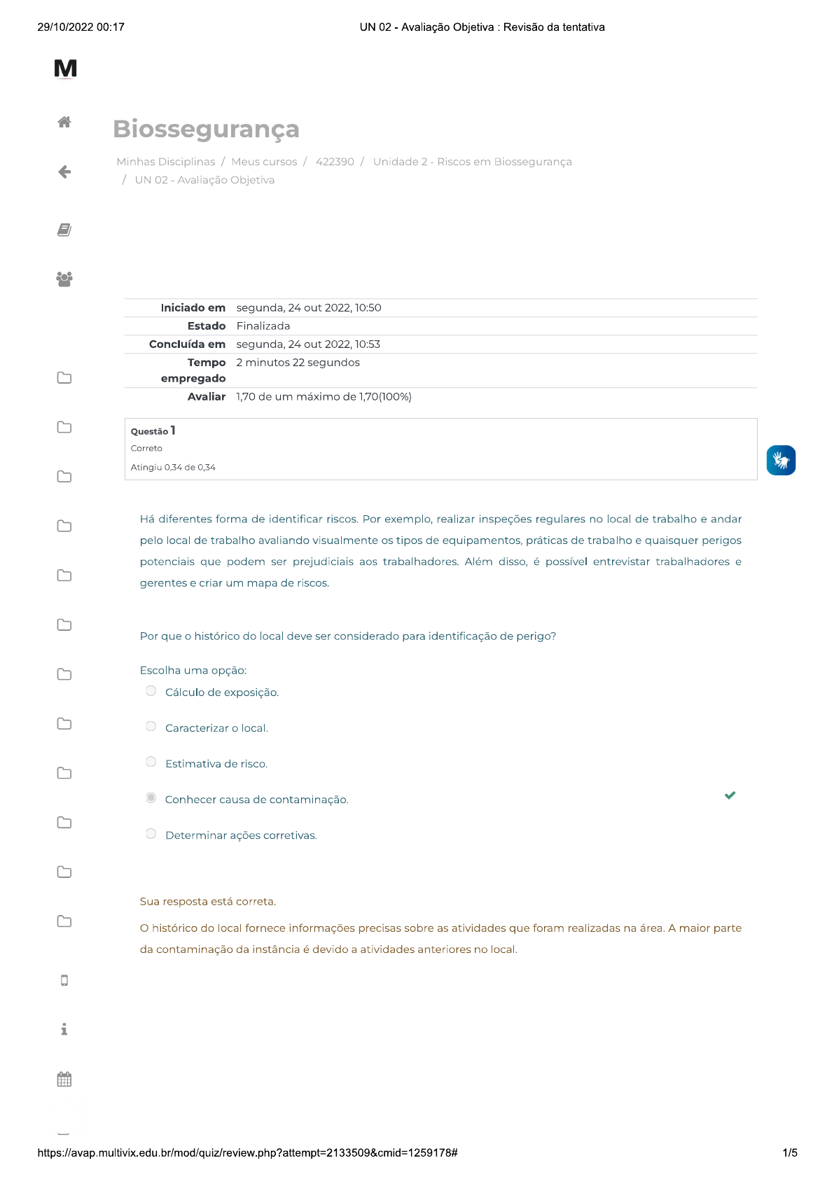 <p>29/10/2022 00:17 UN 02 - Avaliação Objetiva : Revisão da tentativa M Biossegurança Minhas Disciplinas / Meus cursos / 422390 / Unidade 2 - Riscos em Biossegurança / UN 02 Avaliação Objetiva Iniciado em segunda, 24 out 2022, 10:50 Estado Finalizada Concluída em segunda, 24 out 2022, 10:53 Tempo 2 minutos 22 segundos empregado Avaliar 1,70 de um máximo de 1,70(100%) Questão 1 Correto Atingiu 0,34 de 0,34 Há diferentes forma de identificar riscos. Por exemplo, realizar inspeções regulares no local de trabalho e andar pelo local de trabalho avaliando visualmente os tipos de equipamentos, práticas de trabalho e quaisquer perigos potenciais que podem ser prejudiciais aos trabalhadores. Além disso, é possível entrevistar trabalhadores e gerentes e criar um mapa de riscos. Por que histórico do local deve ser considerado para identificação de perigo? Escolha uma opção: Cálculo de exposição. Caracterizar local. Estimativa de risco. Conhecer causa de contaminação. Determinar ações corretivas. Sua resposta está correta. histórico do local fornece informações precisas sobre as atividades que foram realizadas na área. A maior parte da contaminação da instância é devido a atividades anteriores no local. i 1/5</p><p>29/10/2022 00:17 UN 02 - Avaliação Objetiva : Revisão da tentativa Questão 2 M Correto Atingiu 0,34 de 0,34 A exposição humana a produtos químicos perigosos pode ocorrer na fonte ou produto químico pode mover-se para um local onde as pessoas possam entrar em contato com ele. Os produtos químicos podem se mover através do ar, solo e água. Eles também podem estar em plantas ou animais e podem atingir ar que respiramos, os alimentos que comemos e a água que bebemos. Qual a denominação do processo que determina se a exposição a um produto químico pode aumentar a incidência de efeitos adversos à saúde? Escolha uma opção: Avaliação de risco. Caracterização de risco. Identificação de perigo. Avaliação de toxicidade. Avaliação de exposição. Sua resposta está correta. A identificação de perigo rastreia o caminho das toxinas e também determina a probabilidade de ocorrência em humanos. i 2/5</p><p>29/10/2022 00:17 UN 02 - Avaliação Objetiva : Revisão da tentativa Questão 3 M Correto Atingiu 0,34 de 0,34 A identificação de perigo é parte do processo usado para avaliar se alguma situação, item, coisa etc., em particular pode ter potencial de causar danos. termo frequentemente usado para descrever processo completo é a avaliação de risco: Identificar perigos e fatores de risco que têm potencial de causar danos, ou seja, identificação de perigo. Qual dos dados a seguir é irrelevante para a identificação do perigo? Escolha uma opção: População afetada. Uso do terreno. Estimativa de risco. Inventário de reagentes. Nível de contaminantes. Sua resposta está correta. A estimativa do risco é feita na caracterização do risco, enquanto as demais alternativas desempenham um papel importante na identificação de um perigo. i https://avap.multivix.edu.br/mod/quiz/review.php?attempt=2133509&cmid=1259178# 3/5</p><p>29/10/2022 00:17 UN 02 - Avaliação Objetiva : Revisão da tentativa Questão 4 M Correto Atingiu 0,34 de 0,34 Os danos são provavelmente ocasionados pelo manuseio de reagente químico do qual pode vir ocorrer como consequência de uma variedade de aspectos - incluso a porção de reagente químico em um produto; a forma como produto é utilizado; e qual categoria de exposição ao reagente químico ocorre usualmente com a utilização de um produto que é constituído o reagente químico. Das alternativas assinale a que representa um risco químico. Escolha uma opção: Seringas e agulhas. Ruído devido a equipamentos. Proteínas recombinantes. Produtos de reação. Baixa temperatura em câmaras frias. Sua resposta está correta. Os produto de reação são o resultado da reação química de dois reagentes, que a depender de suas respectivas naturezas e condições de processamento podem constituir um risco ao manipulador. i https://avap.multivix.edu.br/mod/quiz/review.php?attempt=2133509&cmid=1259178 4/5</p><p>29/10/2022 00:17 UN 02 - Avaliação Objetiva : Revisão da tentativa Questão 5 M Correto Atingiu 0,34 de 0,34 Os riscos de acidentes, também conhecidos como riscos mecânicos, são riscos criados pelo uso ou pela exposição a equipamentos, máquinas e instalações acionados ou operados manualmente por operadores humanos. Os riscos de acidentes podem ocasionar lesões mecânicas que são causadas principalmente por contato ou emaranhamento com máquinas. Das alternativas abaixo, assinale a que representa um risco de acidente. Escolha uma opção: Radiação. Queimadura. Frio. Ruído. Calor. Sua resposta está correta. Os riscos de acidentes são as consequências diretas nos indivíduos dos perigos inerentes ao ambiente de trabalho, como é caso da queimadura. As demais alternativas representam riscos físicos. Conteúdo online Seguir para... Conteúdo online 5/5</p>
