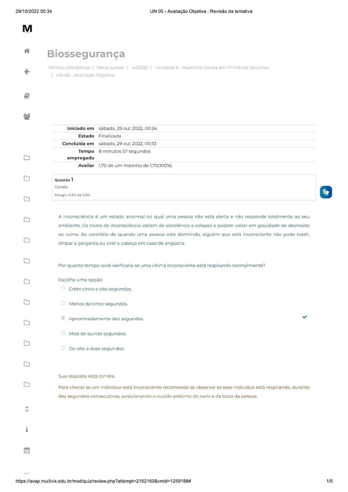<p>29/10/2022 00:34 UN 05 - Avaliação Objetiva : Revisão da tentativa M Biossegurança Minhas Disciplinas / Meus cursos / 422390 / Unidade 5 Aspectos Gerais em Primeiros Socorros / UN 05 Avaliação Objetiva Iniciado em sábado, 29 out 2022, 00:24 Estado Finalizada Concluída em sábado, 29 out 2022, 00:33 Tempo 8 minutos 57 segundos empregado Avaliar 1,70 de um máximo de 1,70(100%) Questão 1 Correto Atingiu 0,34 de 0,34 A é um estado anormal no qual uma pessoa não está alerta e não responde totalmente ao seu ambiente. Os níveis de variam de sonolência a colapso e podem variar em gravidade de desmaios ao coma. Ao contrário de quando uma pessoa está dormindo, alguém que está inconsciente não pode tossir, limpar a garganta ou virar a cabeça em caso de angústia. Por quanto tempo você verificaria se uma vítima inconsciente está respirando normalmente? Escolha uma opção: Entre cinco e oito segundos. Menos de cinco segundos. Aproximadamente dez segundos. Mais de quinze segundos. De oito a doze segundos. Sua resposta está correta. Para checar se um indivíduo está inconsciente recomenda-se observar se esse indivíduo está respirando, durante dez segundos consecutivos, posicionando ouvido próximo do nariz e da boca da pessoa. i 1/5</p><p>29/10/2022 00:34 UN 05 - Avaliação Objetiva : Revisão da tentativa Questão 2 M Correto Atingiu de 0,34 Quando inconsciente, a pessoa corre risco de asfixia, por isso é muito importante manter as vias respiratórias desobstruídas enquanto aguarda cuidados médicos. Se você encontrar uma pessoa inconsciente, tente determinar que causou a perda de consciência. Verifique se ele/ela está usando uma etiqueta de alerta médico. Se você puder determinar que causou a perda de consciência, ligue para os serviços médicos de emergência. Em uma emergência no trabalho, serviço médico especializado foi acionado, contudo não chegou a tempo hábil de salvar indivíduo. Qual a consequência desse fato? Escolha uma opção: serviço de emergência é responsabilizado por não chegar a tempo. A empresa é processado por negligência ao fato que ocasionou óbito do empregado. A empresa fabricante do produto que ocasionou acidente é responsabilizada pelo ocorrido. Os colegas de trabalho do indivíduo são culpados por não prestarem socorro. Estado é culpado por não oferecer serviço médico de emergência adequado. Sua resposta está correta. Quando um socorrista não chega a tempo, a empresa ou empregador pode ser processado por negligência. 2/5</p><p>29/10/2022 00:34 UN 05 - Avaliação Objetiva : Revisão da tentativa Questão 3 M Correto Atingiu 0,34 de 0,34 A pode ser causada por muitos ferimentos e tipos de doenças. As causas comuns de inconsciência são lesões na cabeça por queda ou golpe. As causas de específicas dos desmaios podem ser encontradas no tópico Desmaios. diabetes afeta açúcar no sangue, e muito açúcar (hiperglicemia) e pouco açúcar (hipoglicemia) pode levar à perda de consciência na forma de coma diabético ou choque insulínico, respectivamente. Qual é a causa da angina? Escolha uma opção: Sangue insuficiente alcançando os músculos das pernas. Sangue insuficiente chegando ao músculo cardíaco. Sangue insuficiente chegando aos pulmões. Sangue insuficiente chegando ao cérebro. Sangue excedente chegando aos pulmões. Sua resposta está correta. A angina é uma condição patológica caracterizada pela insuficiência da irrigação sanguínea no miocárdio, que é músculo cardíaco. https://avap.multivix.edu.br/mod/quiz/review.php?attempt=2162160&cmid=1259188# 3/5</p><p>29/10/2022 00:34 UN 05 - Avaliação Objetiva : Revisão da tentativa Questão 4 M Correto Atingiu 0,34 de 0,34 Ressuscitação cardiopulmonar é um procedimento de emergência para salvar vidas, executado quando a respiração ou batimento cardíaco de alguém param. Isso pode acontecer após um choque elétrico, ataque cardíaco ou afogamento. A ressuscitação cardiopulmonar combina respiração de resgate e compressões torácicas. Como a ressuscitação cardiopulmonar pode auxiliar um indivíduo a regressar ao estado de normalidade? Escolha uma opção: Restaura o fluxo sanguíneo para coração de um individuo Auxilia que coração de um indivíduo volte a bater novamente Restitui fluxo sanguíneo regular removendo as ateromas das veias. Restabelece os impulsos nervosos da contração do miocárdio. Recondiciona o ritmo sistólico-diastólico do coração de uma pessoa. Sua resposta está correta. Quando uma pessoa sofre uma parada cardíaca, coração para de bater ou para de bater com eficácia. Isso interrompe fluxo de sangue, de acordo com a AHA. A RCP ajuda uma pequena quantidade de sangue a continuar a fluir para coração e cérebro até a chegada de um médico de emergência. 4/5</p><p>29/10/2022 00:34 UN 05 Avaliação Objetiva : Revisão da tentativa Questão 5 M Correto Atingiu 0,34 de 0,34 A é estado em que uma pessoa de incapacidade responsiva a estímulos, aparentando sonolência. Indivíduos podem ficar em estado de por alguns segundos - em caso de desmaios, por exemplo - ou por períodos extensos. Indivíduos que permanecem inconscientes e apresentam-se não responsivos a altos ruídos ou tremores. Esses indivíduos podem cessar a respiração ou pulsação pode enfraquecer. Como você deve abrir as vias aéreas de uma vítima inconsciente? Escolha uma opção: Impulso mandibular. Impulso da cabeça. Inclinação da cabeça e da mandíbula. Inclinação da cabeça e do queixo. Feedback geral: Levantamento do queixo. Sua resposta está correta. Conteúdo online Seguir para... Conteúdo online i https://avap.multivix.edu.br/mod/quiz/review.php?attempt=2162160&cmid=1259188# 5/5</p>