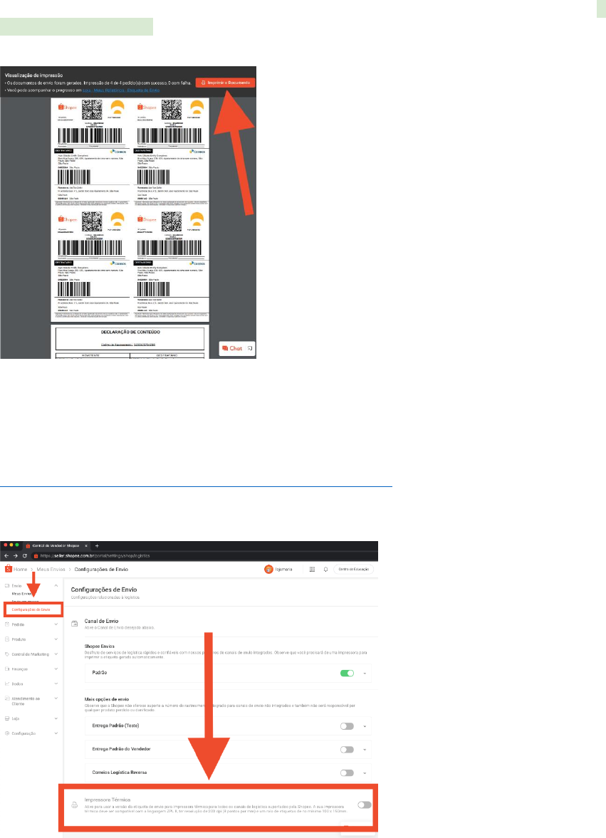 <p>Atualização de Etiquetas de Envio</p><p>ETIQUETAS EM PDF</p><p>As Etiquetas de envio em PDF para impressora normal agora podem conter até 4</p><p>etiquetas por folha A4</p><p>Para configurar a etiqueta de envio em PDF:</p><p>Central do Vendedor > Meus Envios > Configurações de Envio</p><p>https://seller.shopee.com.br/portal/settings/shop/logistics</p><p>• Deixe o botão “Impressora Térmica” desativado (cinza).</p><p>Como gerar a etiqueta em PDF de UM PEDIDO:</p><p>https://seller.shopee.com.br/portal/settings/shop/logistics</p><p>Entre na Central do Vendedor > Meus Envios > A Enviar</p><p>https://seller.shopee.com.br/portal/sale/shipment?type=toship</p><p>• Em Configurações de Envio, deixe o botão 'Impressora Térmica' desativado</p><p>(cinza).</p><p>• Depois de organizar o envio do pedido, clique em "Imprimir guia de postagem".</p><p>• A página "Visualização de Impressão" será aberta com um arquivo contendo a</p><p>etiqueta de envio e a declaração de conteúdo em formato PDF.</p><p>• Clique em 'Imprimir o Documento" para imprimir ou salvar em PDF.</p><p>https://seller.shopee.com.br/portal/sale/shipment?type=toship</p><p>Gerar Etiqueta em PDF EM MASSA</p><p>Entre em Central do Vendedor > Envio em Massa > Gerar Documentos</p><p>https://seller.shopee.com.br/portal/sale/ship?type=print</p><p>• Depois de organizar o envio em massa, selecione os pedidos que deseja gerar</p><p>as etiquetas.</p><p>• Selecione "Etiqueta de Envio" e "PDF".</p><p>• (Opcional) Selecione outros arquivos que deseja gerar entre Lista de Escolhas,</p><p>Declaração de Conteúdo e Lista de Embalagem.</p><p>• Clique em "Gerar Documentos Selecionados".</p><p>https://seller.shopee.com.br/portal/sale/ship?type=print</p><p>• A página "Visualização de Impressão" será aberta com um arquivo contendo a</p><p>etiquetas de envio com até 4 etiquetas por folha A4.</p><p>• Clique em 'Imprimir o Documento" para imprimir ou salvar em PDF.</p><p>Gerar Etiqueta em PDF via Integradores e ERPs</p><p>• Em Configurações de Envio na Central do Vendedor, deixe o botão 'Impressora</p><p>Térmica' desativado (cinza).</p><p>• Utilize o portal da Integradoras ou ERPs para fazer o download das etiquetas de</p><p>envio dos seus pedidos.</p><p>• Para mais detalhes, entre em contato Integradoras ou ERP</p><p>https://seller.shopee.com.br/edu/article/3540</p><p>Etiquetas de Envio em ZPL - Impressora Térmica</p><p>Configurar Etiqueta de Envio em ZPL</p><p>Entre em Central do Vendedor > Meus Envios > Configurações de Envio</p><p>https://seller.shopee.com.br/portal/settings/shop/logistics</p><p>• Deixe o botão 'Impressora Térmica' ativado (verde).</p><p>• A mensagem "Salvo com sucesso" vai aparecer se a configuração for alterada</p><p>com sucesso.</p><p>https://seller.shopee.com.br/edu/article/3540</p><p>https://seller.shopee.com.br/portal/settings/shop/logistics</p><p>Gerar Etiqueta em ZPL de um Pedido</p><p>Entre em Central do Vendedor > Meus Envios > A Enviar</p><p>https://seller.shopee.com.br/portal/sale/shipment?type=toship</p><p>• Em Configurações de Envio, deixe o botão 'Impressora Térmica' ativado (verde).</p><p>• Depois de organizar o envio do pedido, clique em "Imprimir guia de postagem".</p><p>https://seller.shopee.com.br/portal/sale/shipment?type=toship</p><p>• A página "Visualização de Impressão" será aberta e um arquivo .zip será</p><p>baixado.</p><p>• O arquivo .zip contém uma pasta com a etiqueta em código ZPL em um arquivo</p><p>.txt e a declaração de conteúdo em PDF.</p><p>• Envie o arquivo .txt para a impressão na sua impressora térmica.</p><p>Gerar Etiqueta em ZPL em Massa</p><p>Entre em Central do Vendedor > Envio em Massa > Gerar Documentos</p><p>https://seller.shopee.com.br/portal/sale/ship?type=print</p><p>https://seller.shopee.com.br/portal/sale/ship?type=print</p><p>• Depois de organizar o envio em massa, selecione os pedidos que deseja gerar</p><p>as etiquetas.</p><p>• Selecione "Etiqueta de Envio" e "ZPL".</p><p>• (Opcional) Selecione outros arquivos que deseja gerar entre Lista de Escolhas,</p><p>Declaração de Conteúdo e Lista de Embalagem.</p><p>• Clique em "Gerar Documentos Selecionados".</p><p>• A página "Visualização de Impressão" será aberta e um arquivo .zip será</p><p>baixado.</p><p>• O arquivo .zip contém uma pasta com todas as etiquetas em código ZPL em um</p><p>só arquivo .txt.</p><p>• Envie o arquivo .txt para a impressão na sua impressora térmica.</p><p>• A página "Visualização de Impressão" será aberta e um arquivo .zip será</p><p>baixado.</p><p>• O arquivo .zip contém uma pasta com todas as etiquetas em código ZPL em um</p><p>só arquivo .txt.</p><p>• Envie o arquivo .txt para a impressão na sua impressora térmica.</p><p>Gerar Etiqueta em ZPL via Integradoras e ERPs</p><p>• Em Configurações de Envio na Central do Vendedor, deixe o botão 'Impressora</p><p>Térmica' ativado (verde).</p><p>• Utilize o portal da Integradoras ou ERPs para fazer o download das etiquetas</p><p>de envio dos seus pedidos.</p><p>• Para mais detalhes, entre em contato Integradoras ou ERP:</p><p>https://seller.shopee.com.br/edu/article/3540</p><p>https://seller.shopee.com.br/edu/article/3540</p>