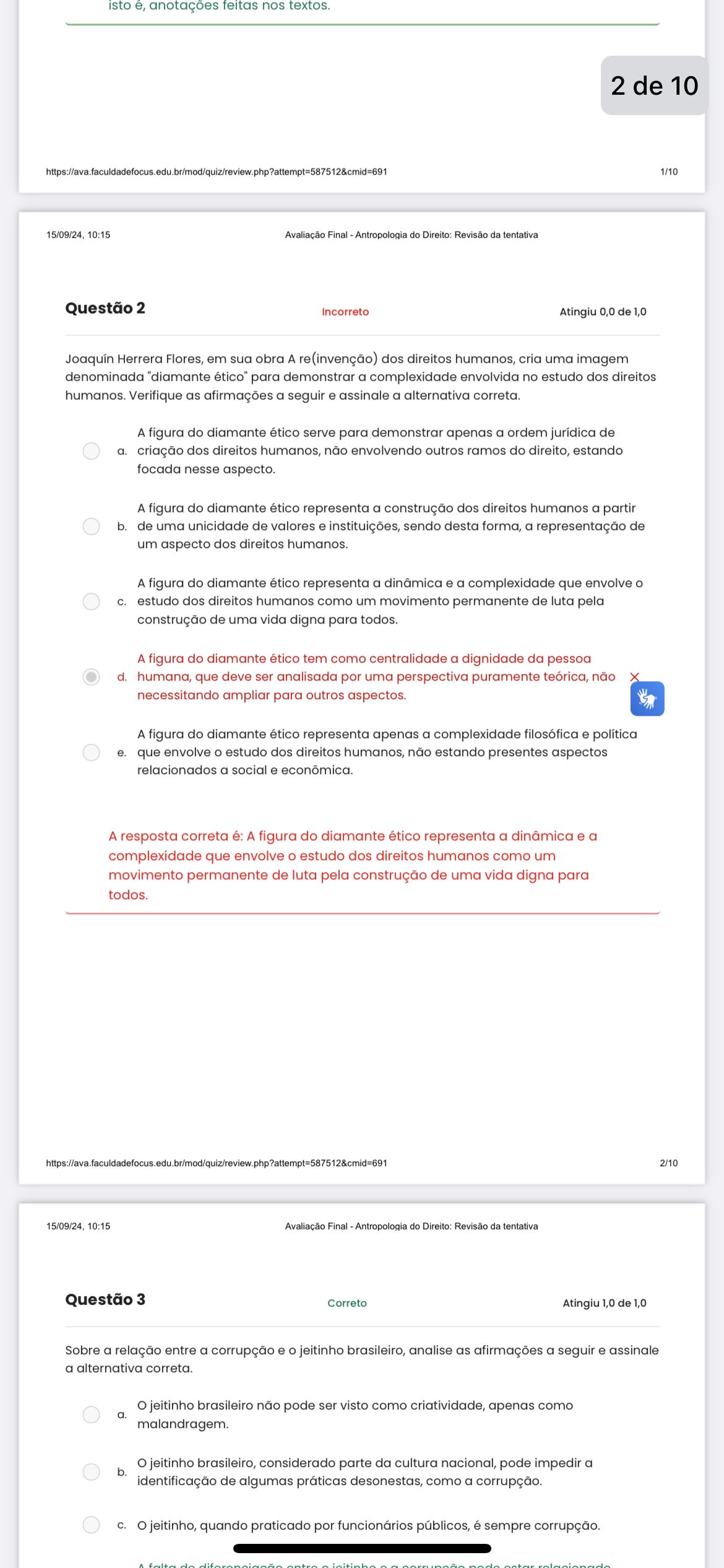 <p>isto é, anotações feitas nos textos. 2 de 10 1/10 15/09/24, 10:15 Avaliação Final Antropologia do Direito: Revisão da tentativa Questão 2 Incorreto Atingiu 0,0 de 1,0 Joaquín Herrera Flores, em sua obra A re(invenção) dos direitos humanos, cria uma imagem denominada "diamante ético" para demonstrar a complexidade envolvida no estudo dos direitos Verifique as afirmações a seguir e assinale a alternativa correta. A figura do diamante ético serve para demonstrar apenas a ordem jurídica de a. criação dos direitos humanos, não envolvendo outros ramos do direito, estando focada nesse aspecto. A figura do diamante ético representa a construção dos direitos humanos a partir b. de uma unicidade de valores e instituições, sendo desta forma, a representação de um aspecto dos direitos A figura do diamante ético representa a dinâmica e a complexidade que envolve o C. estudo dos direitos humanos como um movimento permanente de luta pela construção de uma vida digna para todos. A figura do diamante ético tem como centralidade a dignidade da pessoa d. humana, que deve ser analisada por uma perspectiva puramente teórica, não necessitando ampliar para outros aspectos. A figura do diamante ético apenas a complexidade filosófica e política e. que envolve o estudo dos direitos humanos, não estando presentes aspectos relacionados a social e econômica A resposta correta é: A figura do diamante ético representa a dinâmica e a complexidade que envolve o estudo dos direitos humanos como um movimento permanente de luta pela construção de uma vida digna para todos. 2/10 10:15 Avaliação Final Antropologia do Direito: Revisão da tentativa Questão 3 Correto Atingiu 1,0 de 1,0 Sobre a relação entre a corrupção e o jeitinho brasileiro, analise as afirmações a seguir e assinale a alternativa correta. o jeitinho brasileiro não pode ser visto como criatividade, apenas como a. malandragem. o jeitinho brasileiro, considerado parte da cultura nacional, pode impedir a b. identificação de algumas práticas desonestas, como a corrupção. C. jeitinho, quando praticado por funcionários públicos, é sempre corrupção. falta</p>