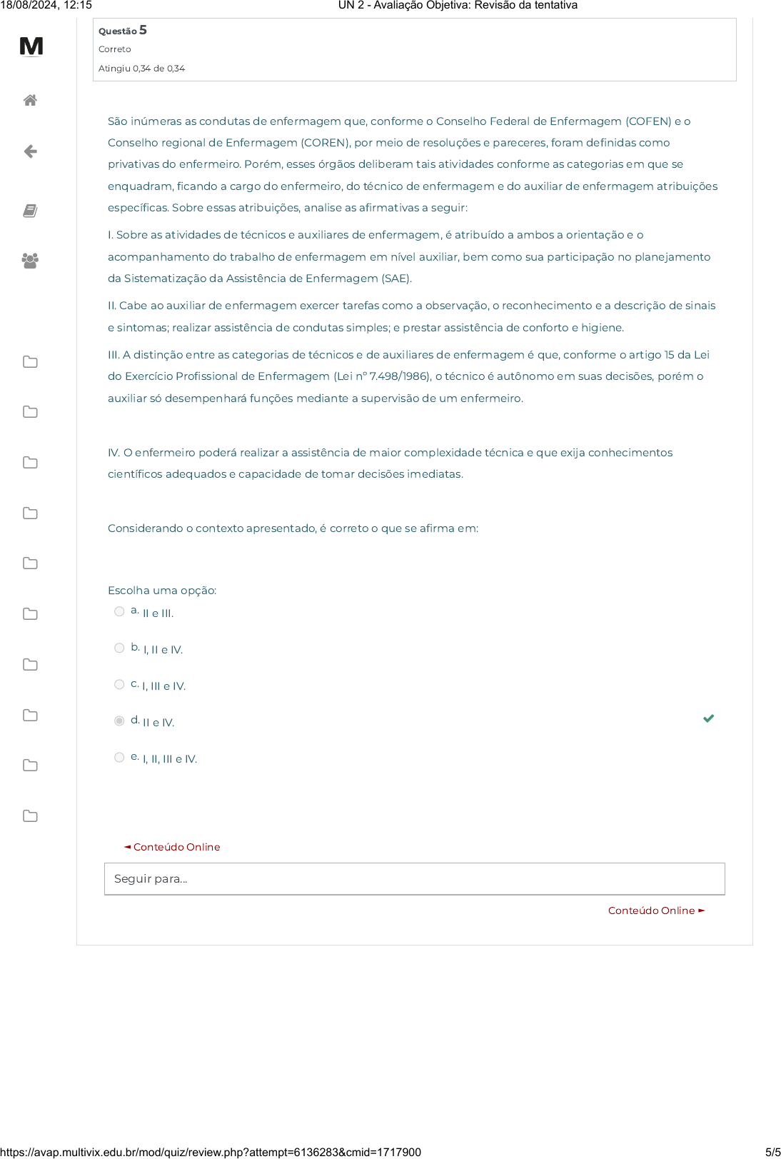 <p>18/08/2024, 12:15 UN 2 - Avaliação Objetiva: Revisão da tentativa Questão 5 M Correto Atingiu 0,34 de 0,34 São inúmeras as condutas de enfermagem que, conforme Conselho Federal de Enfermagem (COFEN) e Conselho regional de Enfermagem (COREN), por meio de resoluções e pareceres, foram definidas como privativas do enfermeiro. Porém, esses órgãos deliberam tais atividades conforme as categorias em que se enquadram, ficando a cargo do enfermeiro, do técnico de enfermagem e do auxiliar de enfermagem atribuições específicas. Sobre essas atribuições, analise as afirmativas a seguir: I. Sobre as atividades de técnicos e auxiliares de enfermagem, é atribuído a ambos a orientação e acompanhamento do trabalho de enfermagem em nível auxiliar, bem como sua participação no planejamento da Sistematização da Assistência de Enfermagem (SAE). II. Cabe ao auxiliar de enfermagem exercer tarefas como a observação, reconhecimento e a descrição de sinais e sintomas; realizar assistência de condutas simples; e prestar assistência de conforto e higiene. III. A distinção entre as categorias de técnicos e de auxiliares de enfermagem é que, conforme artigo 15 da Lei do Exercício Profissional de Enfermagem (Lei n° técnico é autônomo em suas decisões, porém auxiliar só desempenhará funções mediante a supervisão de um enfermeiro. IV. enfermeiro poderá realizar a assistência de maior complexidade técnica e que exija conhecimentos científicos adequados e capacidade de tomar decisões Considerando contexto apresentado, é correto que se afirma em: Escolha uma opção: b. I, e IV. d. e IV. e. III e IV. Conteúdo Online Seguir para.. Conteúdo Online 5/5</p>
