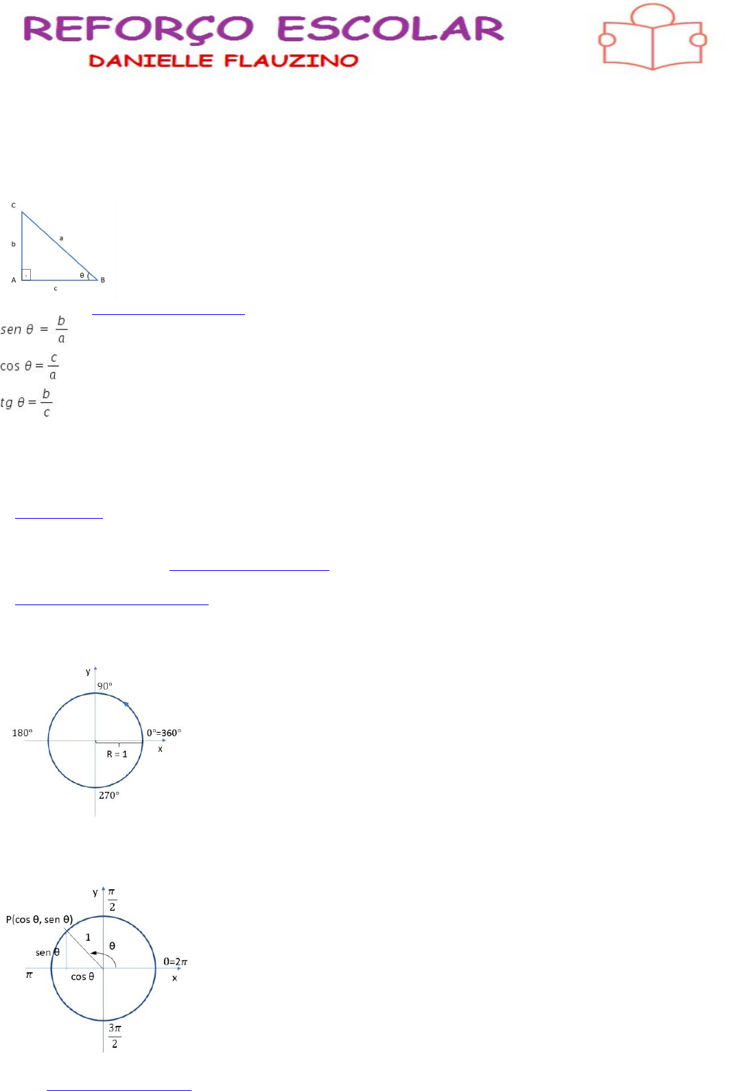 <p>Relações Trigonométricas</p><p>As relações trigonométricas são relações entre valores das funções trigonométricas de um mesmo arco. Essas relações também são chamadas de identidades trigonométricas.</p><p>Inicialmente a trigonometria tinha como objetivo o cálculo das medidas dos lados e ângulos dos triângulos.</p><p>Nesse contexto, as razões trigonométricas sen θ , cos θ e tg θ são definidas como relações entre os lados de um triângulo retângulo.</p><p>Dado um triângulo retângulo ABC com um ângulo agudo θ, conforme figura abaixo:</p><p>Definimos as razões trigonométricas seno, cosseno e tangente em relação ao ângulo θ, como:</p><p>Sendo,</p><p>a: hipotenusa, ou seja, lado oposto ao ângulo de 90º</p><p>b: cateto oposto ao ângulo θ</p><p>c: cateto adjacente ao ângulo θ</p><p>Relações fundamentais</p><p>A trigonometria ao longo dos anos foi se tornando mais abrangente, não se restringindo apenas aos estudos dos triângulos.</p><p>Dentro deste novo contexto, define-se o círculo unitário, também chamado de circunferência trigonométrica. Ele é utilizado para estudar as funções trigonométricas.</p><p>Circunferência trigonométrica</p><p>A circunferência trigonométrica é uma circunferência orientada de raio igual a 1 unidade de comprimento. Associamos a ela um sistema de coordenadas cartesianas.</p><p>Os eixos cartesianos dividem a circunferência em 4 partes, chamadas de quadrantes. O sentido positivo é anti-horário, conforme figura abaixo:</p><p>Usando a circunferência trigonométrica, as razões que a princípio foram definidas para ângulos agudos (menores que 90º), passam a ser definidas para arcos maiores de 90º.</p><p>Para isso, associamos um ponto P, cuja abscissa é o cosseno de θ e cuja ordenada é o seno de θ.</p><p>Como todos os pontos da circunferência trigonométrica estão a uma distância de 1 unidade da origem, podemos usar o teorema de Pitágoras. O que resulta na seguinte relação trigonométrica fundamental:</p><p>Podemos definir ainda a tg x, de um arco de medida x, no círculo trigonométrico como sendo:</p><p>Outras relações fundamentais:</p><p>· Cotangente do arco de medida x</p><p>· Secante do arco de medida x.</p><p>· Cossecante do arco de medida x.</p><p>Relações trigonométricas derivadas</p><p>Partido das relações apresentadas, podemos encontrar outras relações. Abaixo, mostramos duas importantes relações decorrentes das relações fundamentais.</p><p>Exercícios Sobre Relações Trigonométricas</p><p>Questão 1 A expressão , com sen θ ≠ 1, é igual a:</p><p>a) sen θ</p><p>b) sen θ + 1</p><p>c) tg θ . cos θ</p><p>d) 1</p><p>e) sen θ</p><p>sec θ</p><p>Questão 2 Se cos 2x = 0,2, então tg² x é igual a:</p><p>a) 1/2</p><p>b) 2/3</p><p>c) 3/4</p><p>d) 4/3</p><p>e) 2</p><p>Questão 3 Determine o valor de A = , sabendo que sen x = 4/5 e que x pertence ao 1° quadrante.</p><p>Questão 4 Determine os valores de tg x, cotg x, sec x e cossec x, sabendo que cos x = 4/5 e que o ângulo x encontra-se no 1° quadrante.</p><p>Redução ao primeiro quadrante no ciclo trigonométrico</p><p>A redução ao primeiro quadrante permite trabalhar as funções trigonométricas em ângulos localizados em todo o ciclo trigonométrico.</p><p>Quando estamos trabalhando com Trigonometria e deparamo-nos com um ângulo que não se encontra no primeiro quadrante, sempre podemos reduzi-lo de forma a encontrar o ângulo correspondente a esse que esteja justamente no 1° quadrante. Isso é possível graças à simetria presente no ciclo trigonométrico. Mas precisamos nos atentar para o que ocorre com os sinais das funções trigonométricas em cada quadrante. Vejamos a seguir algumas formas de trabalhar a mudança de quadrante no ciclo trigonométrico.</p><p>Redução ao Primeiro Quadrante</p><p>Na figura a seguir, considere o ângulo x, destacado em vermelho no primeiro quadrante. Nós podemos encontrar os ângulos que são correspondentes a x nos demais quadrantes. A distância desses ângulos a x é sempre um valor múltiplo de 90°, de modo que o módulo das funções trigonométricas desses ângulos não se altera.</p><p>Método prático para redução ao primeiro quadrante</p><p>Se o ângulo com o qual estamos trabalhando for y e ele estiver no segundo quadrante, seu correspondente no 1° quadrante será o ângulo x tal que π – x = y ou 180° – x = y.</p><p>Exemplo 1:</p><p>Considere o ângulo 150°. Para reduzi-lo ao 1° quadrante, teremos o seguinte:</p><p>180° – x = 150°</p><p>x = 30°</p><p>Analogamente, se o ângulo y pertencer ao terceiro quadrante, seu correspondente x no primeiro quadrante será dado por x + π = y ou 180° + x = y.Não pare agora... Tem mais depois da publicidade ;)</p><p>Vale lembrar que os ângulos correspondentes possuem valores parecidos de seno, cosseno e tangente, e a distinção ocorre pelo sinal. No primeiro quadrante, os valores de seno, cosseno e tangente são positivos. No segundo quadrante, o seno é positivo, enquanto o cosseno e a tangente são negativos. No terceiro quadrante, seno e cosseno são negativos, enquanto a tangente é positiva. No quarto quadrante, seno e tangente são negativos, e o cosseno é positivo. Podemos ver a distinção entre os sinais na imagem a seguir:</p><p>Confira os sinais das funções trigonométricas de acordo com o quadrante</p><p>exercíxios redução ao 1 quadrante</p><p>Questão 1 Reduza ao 1° quadrante o ângulo de 150°.</p><p>Questão 2 Reduza ao 1° quadrante o ângulo de 310°.</p><p>Questão 3 Reduza ao 1° quadrante o ângulo de 4π/3.</p><p>Questão 4 Considere as afirmações a seguir:</p><p>I. tan 92° = –tan 88°</p><p>II. tan 178° = tan 88°</p><p>III. tan 268° = tan 88°</p><p>IV. tan 272° = –tan 88°</p><p>Quais estão corretas?</p><p>a) I, III</p><p>b) III, IV</p><p>c) I, II, IV</p><p>d) I, III, IV</p><p>e) II, III, IV</p><p>image9.jpeg</p><p>image10.jpeg</p><p>image11.jpeg</p><p>image12.