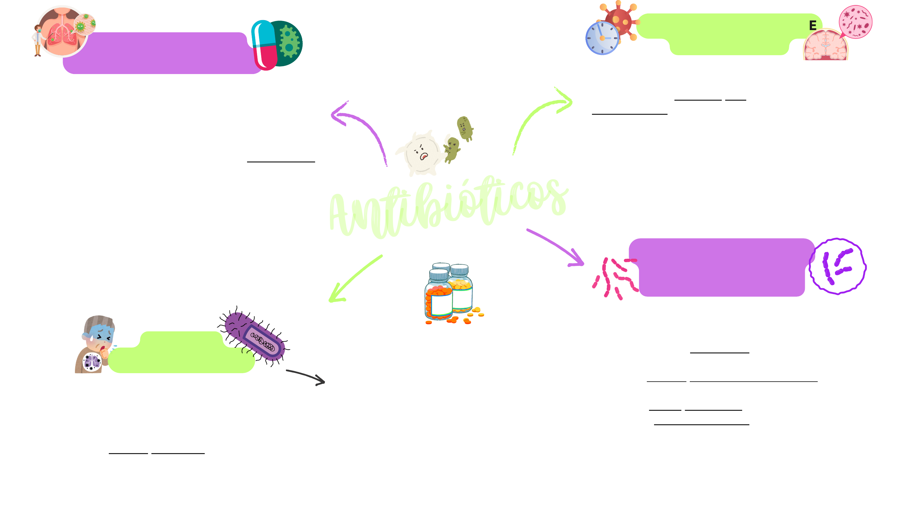 <p>AntibióticosAntibióticos</p><p>AFETAM A SÍNTESE DE</p><p>PROTEÍNAS BACTERIANAS</p><p>INTERFEREM NA SÍNTESE</p><p>OU NO FOLATO</p><p>INTERFEREM NA SÍNTESE</p><p>DO PEPTIDOGLICANO</p><p>(BETALACTÂMICOS)</p><p>AFETAM A</p><p>TOPOISOMERASE II</p><p>MECANISMO DE AÇÃO: Atuam interferindo a</p><p>ação da enzima topoisomerase II no</p><p>superenovelamento do DNA bacteriano, não</p><p>permitindo sua transcrição ou replicação.</p><p>FÁRMACOS: Fluoroquinolonas (Ciprofloxacina,</p><p>Levofloxacina, Ofloxacina, Norfloxacina, Ácido</p><p>nalicíxico e Moxifloxacina).</p><p>MECANISMO DE AÇÃO: Atuam inibindo a síntese do</p><p>peptidoglicano presente na parede celular bacteriana.</p><p>FÁRMACOS: Penicilinas (Benzilpenicilina,</p><p>Fenoximetilpenicilina, Ampicilina, Pivampicilina e</p><p>Amoxilina); Cefalosporinas e Cefamicinas (Cefalexina,</p><p>Cefadroxil, Cefotaxima, Cefuroxina, Ceftazidima e</p><p>Ceftriaxona); Carbapenêmicos (Imipenem, Meropenem e</p><p>Ertapenem) e Monobactâmicos (Aztreonam).</p><p>MECANISMO DE AÇÃO: Atuam inibindo a síntese</p><p>protéica em diversas maneiras como competição</p><p>com RNA transportador, inibição da</p><p>transpeptidação, inibição da translocação entre</p><p>outros.</p><p>FÁRMACOS: O subgrupo das tetraciclinas</p><p>(Cloranfenicol, Aminoglicosídeos, Macrolídeos,</p><p>Estreptograminas, Lincosamidas, Oxalazidononas</p><p>e Ácido fusídico).</p><p>MECANISMO DE AÇÃO: Atuam inibindo a síntese do</p><p>folato.</p><p>FÁRMACOS: Trimetropina e o subgrupo das</p><p>Sulfonamidas (Sulfanilamida, sulfatiazina,</p><p>sulfametoxazol, sulfassalazina e sulfametopirazina).</p><p>EFEITO TERAPÊUTICO: Bacteriostático (Inibem ou</p><p>interrompem o crescimento bacteriano).</p><p>INDICAÇÕES CLÍNICAS: Infecções urinárias e renais;</p><p>Meningite; Infecção de ouvido, entre outros.</p><p>EFEITO TERAPÊUTICO: Bactericidas, pois degradam a</p><p>parede celular das bactérias, tornando-a muito fácil de</p><p>sofrer lise e choque osmótico.</p><p>INDICAÇÕES CLÍNICAS: Infecções por bactérias GRAM +</p><p>e GRAM -.</p><p>EFEITO TERAPÊUTICO: Bacteriostático (Inibem ou</p><p>interrompem o crescimento bacteriano).</p><p>INDICAÇÕES CLÍNICAS: De 1° escolha em casos de</p><p>clamídia, brucelose, cólera e leptospirose. São de</p><p>2° escolha em infecções respiratórias, acne,</p><p>meningite e diarréia.</p><p>EFEITO TERAPÊUTICO: Bacteriostático</p><p>(Inibem ou interrompem o crescimento</p><p>bacteriano).</p><p>INDICAÇÕES CLÍNICAS: Infecções do</p><p>trato urinário e respiratórios por</p><p>Pseudomonas e H.influenzae, prostatite,</p><p>gonorréia, otite e infecções por</p><p>bactérias GRAM + e GRAM -.</p><p>Stephany Cristine Pereira - 4° Período</p><p>https://www.infoescola.com/genetica/transcricao/</p><p>https://www.infoescola.com/genetica/replicacao/</p><p>https://www.infoescola.com/farmacologia/quinolonas/</p><p>https://www.infoescola.com/bioquimica/sintese-de-proteinas/</p><p>https://www.infoescola.com/bioquimica/sintese-de-proteinas/</p><p>https://www.infoescola.com/genetica/rna-transportador/</p>