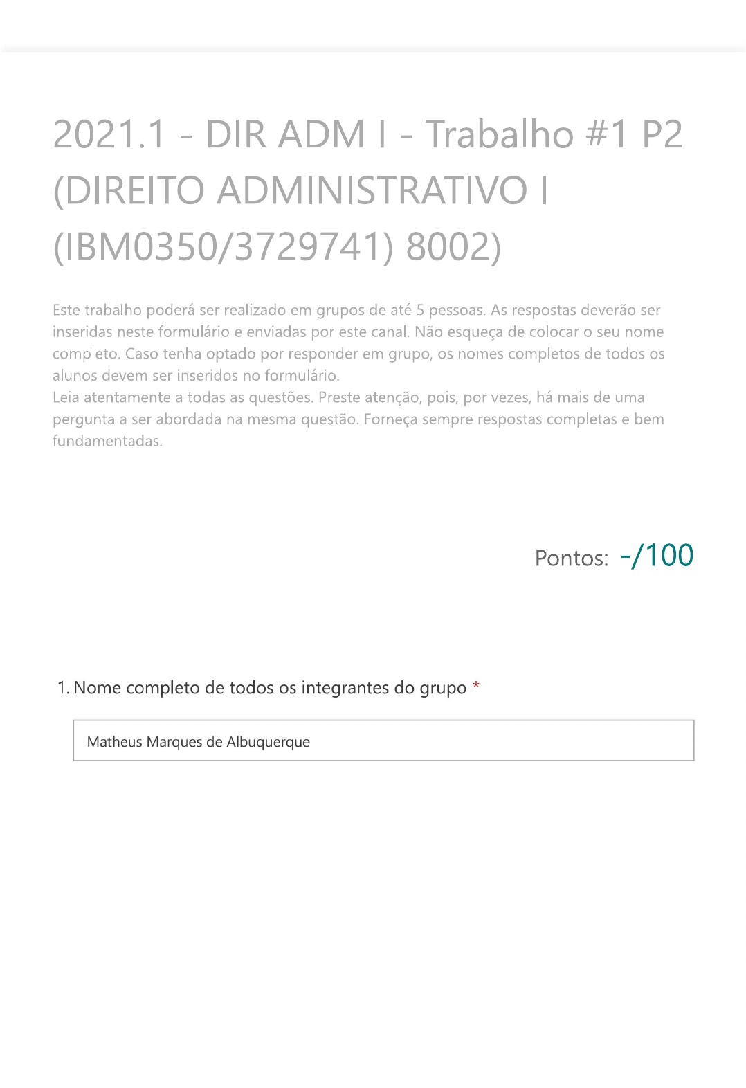 <p>2021.1 - DIR ADM - Trabalho #1 P2 (DIREITO ADMINISTRATIVO (IBM0350/3729741) 8002) Este trabalho poderá ser realizado em grupos de até 5 pessoas. As respostas deverão ser inseridas neste formulário e enviadas por este canal. Não esqueça de colocar seu nome completo. Caso tenha optado por responder em grupo, os nomes completos de todos os alunos devem ser inseridos no formulário. Leia atentamente a todas as questões. Preste atenção, pois, por vezes, há mais de uma pergunta a ser abordada na mesma questão. Forneça sempre respostas completas e bem fundamentadas. Pontos: -/100 1. Nome completo de todos os integrantes do grupo * Matheus Marques de Albuquerque</p><p>2. Como recentemente divulgado pela imprensa, o governo federal está estudando publicar um decreto para proibir as redes sociais de apagarem publicações de seus usuários. Isso somente seria possível quando houvesse ordem judicial nesse sentido. (https://oglobo.globo.com/brasil/apos- redes-sociais-de-apagarem-publicacoes-25025710) Segundo autoridades publicas ouvidas pela imprensa, o decreto teria como fundamento os arts. 18 e 19 da lei que instituiu o marco civil da internet. Considerando as possibilidades e limites do poder de polícia exercido pelo Estado, dê a sua opinião quanto à juridicidade desse decreto, fundamento as suas conclusões. * (40 Pontos) poder estatal de limitar as liberdades individuais, desde que observando o interesse público, pode ser compreendido como Poder de Polícia. A fundamentação desse ato discricionário do estado se pauta nos princípios da supremacia do Interesse público e da Dignidade da Pessoa Humana. Tal poder busca fiscalizar o cumprimento de uma norma que se alicerça na limitação da liberdade. Podendo esta, ainda, ser categorizada como negativa (aquela que impõe o dever de abstenção) ou positiva (aquela que exige determinadas condutas ativas). No caso em tela, observa-se a aplicação da limitação de liberdade negativa através de um decreto, ou seja, o governo federal busca impedir que as publicações de usuários das redes sociais sejam apagadas pelo corpo dirigente da empresa. Contudo, o decreto preparado pelo atual governo federal pode ser entendido como ameaçador aos princípios administrativos, uma vez que o legislador deve observar o princípio da impessoalidade ou da objetividade para elaborar uma lei de caráter limitador. Isto porque, percebe-se uma tendência pessoal para a aplicação deste decreto, uma vez que, supostamente, busca tutelar sobre as postagens do atual presidente, utilizando o decreto como uma espécie de instrumento que, conforme a matéria citada como referência no enunciado da questão, figura como uma "resposta do governo" às atitudes da rede que apagam as postagens do atual presidente da república e uma medida que serviria a tutelar</p><p>3. Antônia nasceu com uma síndrome rara, que provoca muita dificuldade para a sua respiração e a obriga a usar um equipamento sofisticado e de alto custo para viabilizar a sua sobrevivência. Esse equipamento é fornecido pelo SUS. No entanto, o seu uso impede a locomação de Antônia, pois é fixo e faz com que a menina, de 12 anos, não possa nunca deixar o seu quarto, prejudicando de modo incontornável a sua socialização e qualquer perspectiva de uma vida produtiva. Seus pais descobriram uma universidade sueca está desenvolvendo, ainda de maneira experimental, um aparelho móvel que poderá desempenhar a mesma função. A universidade está em busca de voluntários, portadores dessa síndrome, para receberem o equipamento, como parte da fase final da pesquisa. Para se apresentar como voluntária, Antônia precisaria se mudar para a Suécia e bancar os custos de cerca de US$ 3 milhões de dólares para a aquisição do equipamento. Sem dispor dos recursos necessários, a família recorre ao hospital municipal que a atende, solicitando que seja custeada a viagem de Antônia e seus pais para a Suécia, seja assegurada uma verba para o a sobrevivência da família pelo período necessário e para a aquisição do equipamento. O hospital. no entanto, recusa patrocinar o tratamento experimental, por falta de recursos. A família recorre, então, ao Prefeito da cidade que, após consultar o secretário municipal da saúde, também indefere o pleito pela mesma razão. Os pais de Antônia, então, representando-a, ingressam em juízo, pleiteando que a decisão do Prefeito seja considerada ilegal e inconstitucional, por violação ao direito à saúde, determinando-se ao Município que arque com os custos necessários para viabilizar o tratamento. Como juiz do caso, como você decidiria? Responda fundamentadamente. * (30 Pontos)</p><p>O caso traz uma situação bastante sensível que abrange o tema dos direitos e garantias fundamentais, especificamente o direito à saúde, e o papel estatal de provê-la. No entanto, observa-se que o fundamento do prefeito para que pudesse justificar o indeferimento do pleito, pauta-se na escassez dos recursos orçamentários do hospital municipal que recebeu a solicitação do custeio de tratamento. Partindo do pressuposto de que o afirmado pelo prefeito é verdade, alguns princípios poderão ser mencionados para corroborar sua fundamentação. Primeiramente, deve-se citar o princípio da prevalência do interesse público sobre o privado. De acordo com os ensinamentos de Celso Antônio Bandeira de Mello, esse princípio figura como um importante alicerce para a ordem social estável, ao firmar a prevalência do interesse da coletividade sobre o particular. Aplicando ao caso exposto, analisa-se que: 1) o custeio do tratamento é exorbitante, custando aproximadamente 15 milhões de reais; 2) o hospital alega não ter recursos para arcar com tal preço. Portanto, infere-se que, caso ocorra o custeio, haverá um rombo orçamentário significativo para o hospital municipal prejudicando sua organização e, consequentemente, o atendimento de outros cidadãos