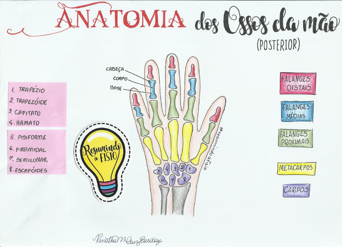<p>NATOMIA dos Osses da (POSTERIOR) FALANGES CORPO DISTAIS BASE 1. FALANGES 2. 3. CAPITATO 4. HAMATO FALANGES PROXIMAIS 5. PISIFORME 6. PIRAMIDAL a FISIO METACARPOS SEMILUNAR 1 8. . ESCAFOIDES 6 7 8 CARPOS</p>