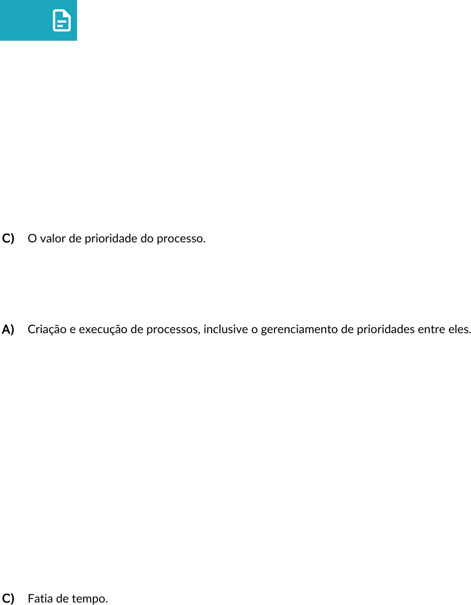 <p>Pré Teste</p><p>1)</p><p>Quando um computador é multiprogramado, normalmente há muitos processos ou threads</p><p>que competem pelo tempo de CPU concomitantemente. Isso ocorre sempre que dois ou</p><p>mais processos estão no estado pronto. Se somente uma CPU estiver disponível nesse</p><p>momento, deverá ser feita a escolha de qual processo será executado.</p><p>Qual é um dos mecanismos que podem ser utilizados para esse escalonamento?</p><p>A) O valor do UID.</p><p>B) O valor do PID.</p><p>C) O valor de prioridade do processo.</p><p>2)</p><p>O sistema operacional (SO) é considerado o principal software do computador. Entre os mais</p><p>conhecidos, temos o Windows e o Linux. O sistema operacional é responsável por qual</p><p>atividade?</p><p>A) Criação e execução de processos, inclusive o gerenciamento de prioridades entre eles.</p><p>B) Criar documentos de edição de texto e planilhas.</p><p>C) Verificar a velocidade da internet.</p><p>3)</p><p>Sistemas operacionais (SO) precisam utilizar algoritmos de escalonamento com definição de</p><p>regras para execução de processos. O Round-Robin é um algoritmo de escalonamento que</p><p>trabalha a partir do(a) _____________ atribuído(a) a cada um dos processos. Uma pequena</p><p>unidade de tempo (quantum) é definida para um processo, e a fila de espera é gerada de</p><p>modo circular. Após executar a partir de sua ______________, o processo volta para o final da</p><p>fila, até ser executado novamente.</p><p>Assinale a alternativa que preenche corretamente as lacunas do texto.</p><p>A) PCB.</p><p>B) Tempo de clock.</p><p>C) Fatia de tempo.</p><p>A gerência do processador pode ser considerada uma das atividades mais importantes em</p><p>um sistema operacional (SO), desde que começaram a surgir sistemas multiprogramáveis, em</p><p>que múltiplos processos poderiam permanecer na memória principal, de modo a</p><p>compartilhar o uso da CPU. Como diversos processos podem estar no estado de pronto,</p><p>algum critério deve ser determinante para que o processo A ou B seja alocado para uso no</p><p>processador. Para essa ação, existe uma técnica chamada de política de escalonamento, base</p><p>da gerência do processador e da multiprogramação em um SO. Durante o escalonamento,</p><p>4)</p><p>Kelvyo Miranda</p><p>Realce</p><p>Kelvyo Miranda</p><p>Realce</p><p>Kelvyo Miranda</p><p>Realce</p><p>um processo passa por determinadas fases, denominadas estados.</p><p>Um processo do tipo I/O Bound é caracterizado por permanecer boa parte de seu ciclo de</p><p>vida nesse estado. Que estado é esse?</p><p>A) Novo.</p><p>B) Pronto.</p><p>C) Suspenso.</p><p>5)</p><p>O escalonador de um sistema operacional multitarefa tem por finalidade distribuir o acesso</p><p>aos recursos do sistema entre tarefas ou processos que os solicitam.</p><p>Assinale a alternativa que melhor caracteriza um escalonador que trabalha com</p><p>escalonamento de processos por prioridade.</p><p>A) Um processo em uma fila em estado de “pronto” é executado pelo processador, de acordo</p><p>com sua fatia de tempo. Assim que finaliza sua execução, volta para o final da fila, caso não</p><p>tenha sido finalizado.</p><p>B) Um processo é movido do estado de pronto e posicionado em uma fila para ser executado.</p><p>C) O processo com maior prioridade volta para o começo da fila, depois que é executado dentro</p><p>de sua fatia de tempo.</p><p>Kelvyo Miranda</p><p>Realce</p><p>Kelvyo Miranda</p><p>Realce</p><p>Pós Teste</p><p>1)</p><p>Sistemas operacionais (SO) gerenciam a execução de um processo, alternando seu estado</p><p>conforme as fases por que pode passar.</p><p>Considerando que um determinado computador tem um único processador de um núcleo,</p><p>assinale a alternativa que melhor define um dos possíveis estados de um processo.</p><p>A) Em execução: nesse estado, o processo é executado, podendo ter mais de um estado.</p><p>B) Bloqueado: ao chegar nesse estado, além de ser bloqueado, o processo é descartado, não</p><p>podendo mais voltar ao estado “em execução”.</p><p>C) Pronto: o processo está temporariamente parado, enquanto aguarda ser executado.</p><p>2)</p><p>A partir de sua criação, um processo pode ter cinco estados possíveis: novo, pronto,</p><p>executando, suspenso e finalizado. Em um sistema operacional (SO), qual das transições de</p><p>estado listadas nas alternativas a seguir não é possível?</p><p>A) Do estado “pronto” para “executando”.</p><p>B) Do estado “pronto” para “bloqueado”.</p><p>C) Do estado “executando” para “pronto”.</p><p>3)</p><p>Um computador (hardware) sozinho não provê a interface necessária para que seus usuários</p><p>o operem. Todo computador, para ser operável, necessita de um sistema operacional (SO).</p><p>Sobre sistemas operacionais, assinale a alternativa correta.</p><p>A) O SO serve para efetuar o controle e o gerenciamento do computador, abrangendo tanto as</p><p>partes físicas quanto as lógicas.</p><p>B) O Linux é um sistema operacional de código fechado e, por isso, é pouco utilizado.</p><p>C) O Windows é um sistema operacional de código aberto e, por isto, é muito utilizado.</p><p>4)</p><p>Os processos inicializados em um sistema operacional podem ter diferentes estados quanto</p><p>ao processamento na CPU. Assinale a alternativa que contém o responsável pelo</p><p>gerenciamento e controle dos estados de cada processo.</p><p>A) Thread.</p><p>B) Escalonador.</p><p>C) Memória.</p><p>Os sistemas operacionais utilizam o conceito de processo para executar os programas, e</p><p>esses processos têm estados. Quanto aos estados dos processos, assinale a alternativa 5)</p><p>Kelvyo Miranda</p><p>Realce</p><p>Kelvyo Miranda</p><p>Realce</p><p>Kelvyo Miranda</p><p>Realce</p><p>Kelvyo Miranda</p><p>Realce</p><p>correta.</p><p>A) Um processo no estado “pronto” pode passar para o estado “em execução” diretamente.</p><p>B) Um processo no est
