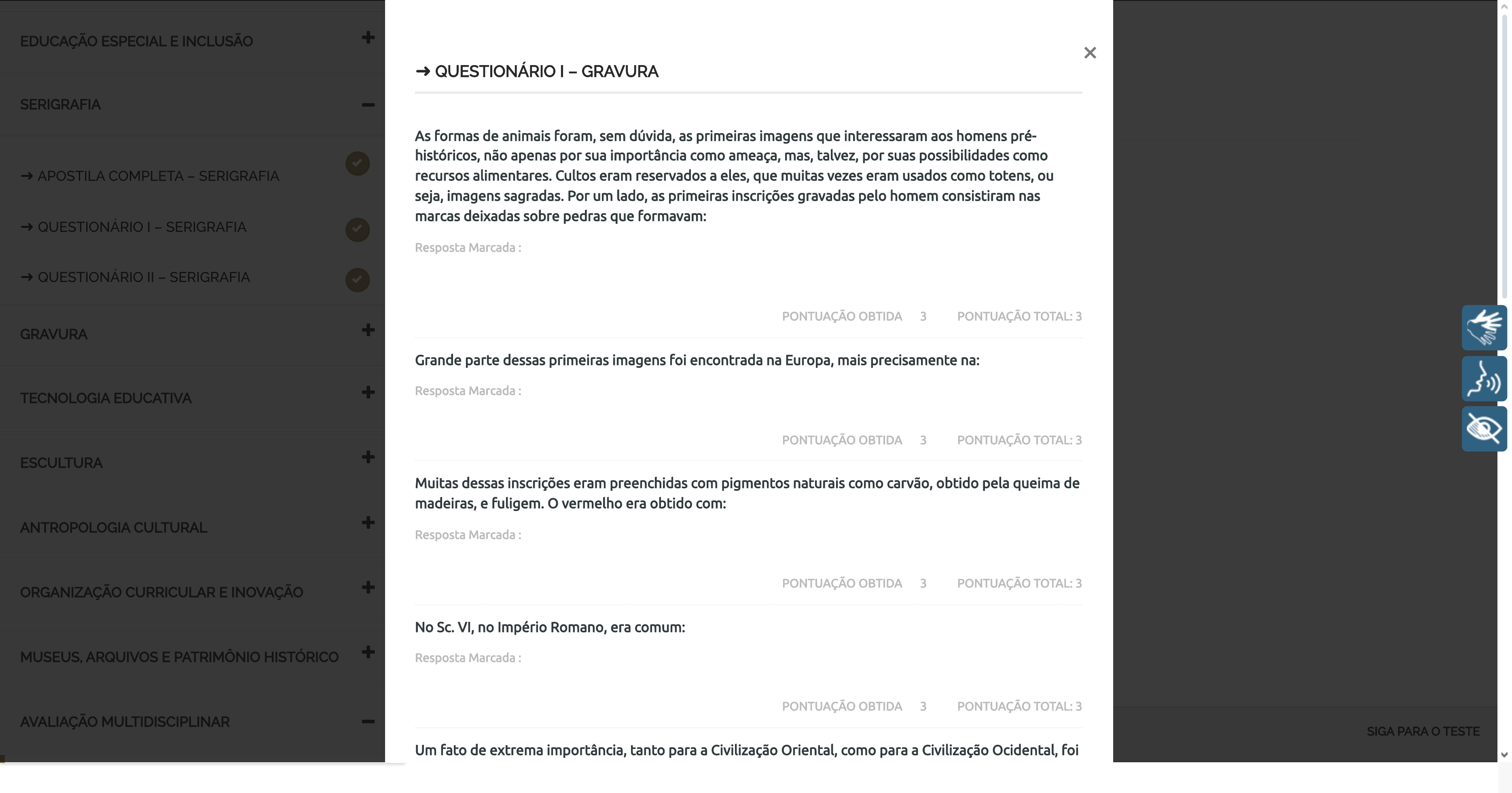 <p> 2 HORAS</p><p>➜ QUESTIONÁRIO I – GRAVURA</p><p>EDUCAÇÃO ESPECIAL E INCLUSÃO </p><p>SERIGRAFIA </p><p>➜ APOSTILA COMPLETA – SERIGRAFIA</p><p></p><p>➜ QUESTIONÁRIO I – SERIGRAFIA </p><p>➜ QUESTIONÁRIO II – SERIGRAFIA </p><p>GRAVURA </p><p>TECNOLOGIA EDUCATIVA </p><p>ESCULTURA </p><p>ANTROPOLOGIA CULTURAL </p><p>ORGANIZAÇÃO CURRICULAR E INOVAÇÃO </p><p>MUSEUS, ARQUIVOS E PATRIMÔNIO HISTÓRICO </p><p>AVALIAÇÃO MULTIDISCIPLINAR </p><p> AULA ANTERIOR VERIFICAR RESULTADOS SIGA PARA O TESTE</p><p>➜ QUESTIONÁRIO I – GRAVURA</p><p>PONTUAÇÃO TOTAL: 3PONTUAÇÃO OBTIDA 3</p><p>As formas de animais foram, sem dúvida, as primeiras imagens que interessaram aos homens pré-</p><p>históricos, não apenas por sua importância como ameaça, mas, talvez, por suas possibilidades como</p><p>recursos alimentares. Cultos eram reservados a eles, que muitas vezes eram usados como totens, ou</p><p>seja, imagens sagradas. Por um lado, as primeiras inscrições gravadas pelo homem consistiram nas</p><p>marcas deixadas sobre pedras que formavam:</p><p>Resposta Marcada :</p><p>as paredes de seus abrigos (cavernas) e, por outro, derivavam das marcas impressas sobre as mesmas</p><p>paredes com suas mãos, muitas vezes pintadas com sangue dos animais que caçavam.</p><p>PONTUAÇÃO TOTAL: 3PONTUAÇÃO OBTIDA 3</p><p>Grande parte dessas primeiras imagens foi encontrada na Europa, mais precisamente na:</p><p>Resposta Marcada :</p><p>Espanha, França, Inglaterra, Alemanha, Itália, Áustria e União Soviética.</p><p>PONTUAÇÃO TOTAL: 3PONTUAÇÃO OBTIDA 3</p><p>Muitas dessas inscrições eram preenchidas com pigmentos naturais como carvão, obtido pela queima de</p><p>madeiras, e fuligem. O vermelho era obtido com:</p><p>Resposta Marcada :</p><p>o óxido de zinco, o amarelo com o ocre, o branco por meio da pulverização de giz.</p><p>PONTUAÇÃO TOTAL: 3PONTUAÇÃO OBTIDA 3</p><p>No Sc. VI, no Império Romano, era comum:</p><p>Resposta Marcada :</p><p>o uso de estêncil, aplicado com folhas de ouro sobre documentos o�ciais.</p><p>Um fato de extrema importância, tanto para a Civilização Oriental, como para a Civilização Ocidental, foi</p><p>×</p><p>https://ava.unifaveni.com.br/membros/33986980857/course/course-results/?action=14560646</p>