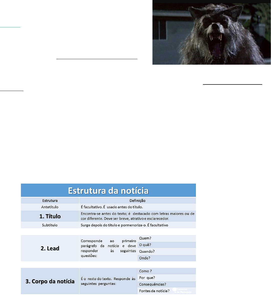 <p>Plano de aula_ Gêneros lendas e notícias _ 8ºAno</p><p>Morador do Paraná afirma ter visto lobisomem: 'Momento de terror'</p><p>Em entrevista à uma rádio local, Renato disse que animal tinha braços longos, peludos e pernas curvadas</p><p>· HORA 7 | Filipe Siqueira, do R7</p><p>· 23/03/2021 - 02H00</p><p>Imagem meramente ilustrativa</p><p>DIVULGAÇÃO/WARNER BROS</p><p>Um morador relata que viu o que chamou de lobisomem, em Realeza, sudoeste do Paraná. O avistamento teria ocorrido no dia 13 de madrugada e desde então o caso viralizou, após o homem, identificado como Renato, ter dado entrevista para uma rádio local.</p><p>Renato afirma que a história começou quando ele testemunhou uma confusão com um grupo de pelo menos 10 cachorros. Quando ele foi ver o que estava acontecendo, avistou uma criatura peluda, de braços longos, pernas curvadas e com a cabeça avantajada.</p><p>O bicho foi atacado pelo grupo de cachorros, mas deu um salto de cinco metros e deixou os animais para trás.</p><p>Ele conseguiu gravar a aparição, mas a criatura já estava em um matagal próximo. Como a região é bem escura, é possível ouvir apenas os uivos da suposta criatura.</p><p>Ele descreveu a situação como "um momento de terror e pânico", e disse também que nunca viu algo do tipo na região. Renato diz também que, desde então, está tomando calmantes para dormir mais tranquilamente.</p><p>Uivo suspeito?</p><p>Nos comentários do vídeo, alguns afirmaram que o caso é claramente falso, por causa do uivo do animal. Enquanto uns ressaltaram que o uivo se assemelha demais com o de lobos, outros comentaram que o ruído foi bem captado pelo celular de Renato, o que pode indicar edição no vídeo. Já outros disseram que Renato parecia claramente abalado durante a entrevista, o que poderia ser uma prova da veracidade do relato dele.</p><p>ATIVIDADES:</p><p>1. Vamos analisar a notícia acima, observando o seguinte esquema abaixo:</p><p>2. PRODUÇÃO TEXTUAL (em dupla ou individual): Após observarem as partes componentes da tabela, escolham alguma lenda do folclore regional e transformem em uma notícia fictícia. Fiquem atentos aos aspectos/dados contidos na narrativa da lenda: nomes dos personagens, datas ou locais, fatos marcantes, podendo acrescentar também elementos que não aparecem no texto como um trecho de entrevista, por exemplo. Usem de muita criatividade e imaginação!</p><p>image2.png</p><p>image1.jpg</p>