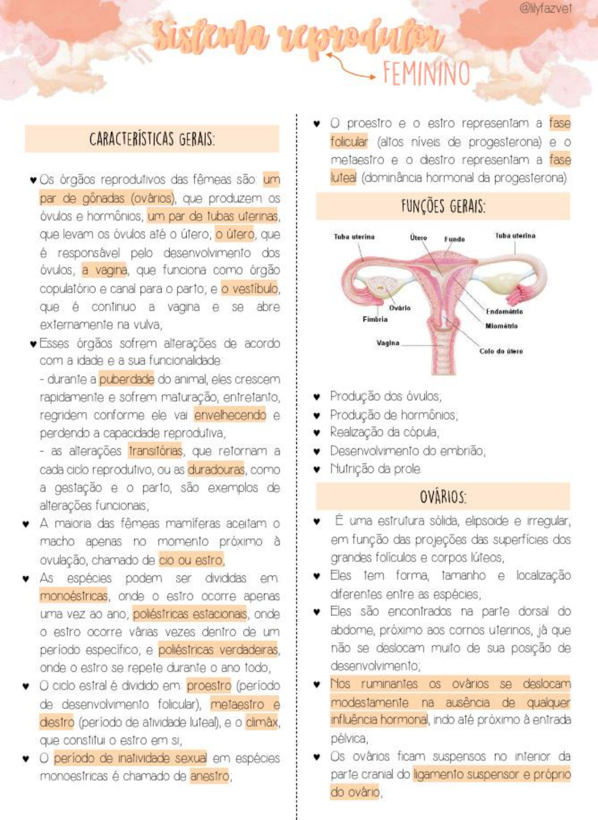 <p>FEMININO proestro e estro representam a fase CARACTERÍSTICAS GERAIS: folicular (altos níveis de progesterona) e o metaestro e representam a fase Os órgãos reprodutivos das fêmeas são um luteal (dominância hormonal da progesterona) par de que produzem FUNÇÕES GERAIS: óvulos e um par de tubas uterinas, que levam os óvulos até o útero; o útero, que Tuba uterina Tuba uterina Fundo é responsável pelo desenvolvimento dos óvulos, a vagina, que funciona como órgão e canal para parto; e vestibulo, que é continuo a vagina e se abre Fimbria externamente na vulva; Miométrio Esses órgãos sofrem alterações de acordo Vagina Colo do com a idade e a sua funcionalidade durante a puberdade do animal, eles crescem rapidamente e sofrem maturação, Produção dos óvulos, regridem conforme ele envelhecendo e Produção de perdendo a capacidade reprodutiva, Realização da as alterações transitórias, que a Desenvolvimento do cada ciclo reprodutivo, ou as duradouras, como Nutrição da prole a gestação e parto, são exemplos de alterações A maioria das fêmeas mamiferas aceitam o É uma estrutura sólida, elipsoide e irregular, macho apenas no momento próximo à em função das projeções das superfícies dos ovulação, chamado de ou grandes foliculos e corpos As espécies podem ser divididas em Eles tem forma, tamanho e localização monoéstricas, onde estro ocorre apenas diferentes entre as uma vez ao estacionais, onde Eles são encontrados na parte dorsal do o estro ocorre vezes dentro de um abdome, próximo aos cornos uterinos, já que e poliéstricas verdadeiras, não se deslocam muito de sua posição de onde estro se repete durante o ano todo, desenvolvimento; O ciclo estral é dividido em proestro (periodo Nos ruminantes OS ovários se deslocam de desenvolvimento folicular), metaestro e modestamente na ausência de qualquer de atividade luteal), e o influência hormonal, indo até próximo à entrada que o estro em Si, pélvica, de inatividade sexual em espécies Os ovários ficam suspensos no da monoestricas é chamado de parte cranial do ligamento suspensor e próprio do</p><p>contida no interior de um arcabouço mais denso (cortex), córtex é envolvido pela túnica albugínea e apresenta espalhados em várias fases A B de desenvolvimento e regressão (cada folículo apresenta apenas um único óvulo); A medula apresenta uma grande vascularização, servindo como fonte de nutrientes para todas as que se desenvolvem dentro do O que envolve OS ovários é chamado de D Quando ocorre a ruptura dos durante a ovulação, ele se transforma no corpo hemorrágico, uma vez que, seu interior é preenchido de sangue, O corpo se transforma E rapidamente no corpo (amarelo), que são estruturas transitórias que crescem e regridem A, Ovário de uma vaca (monotoca) B, de uma entre um de estro e subsequente, cadela em estado quescente C, Ovário de uma cadela desde que não haja a gestação, servindo de apresentando vários foliculos maduros D, Ovário de uma fontes de progesterona e porca apresentando foliculos maduros E Quando OS corpos regridem, eles são Ovário seccionado de uma vaca apresentando grande por tecido conjuntivo corpo Ovário de uma égua, com a fossa do que constituem o corpo albicans (branco), maduro Desenvolvimento do Células Líquido Os ovários estrutura igual em todas as Foliculo Primário Secundário Folicular Estroma espécies, menos nas éguas, onde órgão se assemelha ao formato de um rim, Foliculo Maduro de OVÁRIO Rompido liberado (Ovulação) Corpo albicans ovário de uma vaca ovário de uma égua do Formado Nas éguas também, a ovulação só ocorre na TUBAS UTERINAS: fossa ovulatória, enquanto nas demais espécies pode ocorrer em qualquer parte do As tubas uterinas são estreitas e geralmente Eles são responsáveis por produzir óvulos Elas captam OS óvulos e liberar OS hormônios e pelos ovários e os levam para útero, além progesterona, de transportarem OS durante O órgão poder ser dividido em uma porção sua central frouxa e mais vascularizada (medula)</p><p>É local onde normalmente a AMPOLA fertilização, Infundibulo é a parte da tuba uterina mais próxima ao ovário, responsável por captar o óvulo assim que ocorre a ovulação A sua extremidade cranial assume a forma de um funil de margem irregular com um pequeno orifício (óstio abdominal) em seu final, INFUNDIBULO que se divide em dois segmentos ampola e ISTMO não é possível distinguir esses dois segmentos em todas as espécies ou fases do ciclo reprodutivo; É na ampola que ocorre a fecundação do óvulo com o O se une ao ápice do corno uterino na junção Essa junção é gradual em ruminantes e suínos, e abrupta em equinos e Essa junção serve como barreira, impedindo a ascensão dos e a descida do A parede da tuba é formada por um túnica útero, também conhecido como ventre, é serosa externa, uma túnica muscular a parte expansível do trato, onde intermediaria e uma túnica mucosa interna, embriões se alojam e são protegidos e formada por tecido epitelial ciliado e secretor, até o momento em que estejam que é pregueada longitudinalmente ao longo prontos para serem liberados para o mundo de todo o seu Ela é suspensa por uma prega lateral, a É órgão que mais apresenta diferenças mesossalpinge, que é uma parte do ligamento espécie-específicas, por conta da maneira da largo que sustenta formação do trato reprodutivo nos diferentes animais; Essas dferenças ocorrem por da manera de formação do trato reprodutivo a partir dos dois ductos paramesonéfricos, que crescem caudalmente para se encontrarem e fusionarem entre si e com o urogenital mediano, Em espécies como vários roedores, a fusão dos ductos às porções mais caudais e o útero consiste em um par de tubos que se abrem separadamente dentro da vagina (útero 2, da tuba, 3, ampola da tuba, Ao na maiona dos primatas, a fusão é 4, da tuba; 5, corno 6, 7, muito mais extensa, e apenas as 