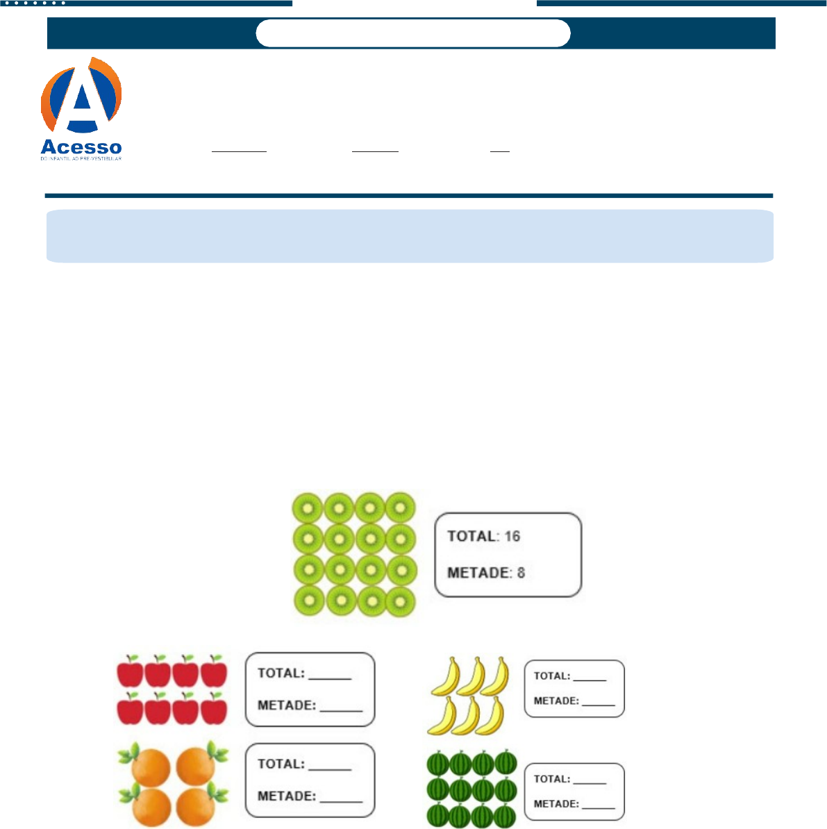 <p>ANOS INICIAIS</p><p>TARDE</p><p>P1 - MATEMÁTICA</p><p>4º BIMESTRE</p><p>P1</p><p>ALUNO:</p><p>________________________________________</p><p>DATA.:</p><p>_________________</p><p>ANO:</p><p>2º</p><p>TURMA:</p><p>_____</p><p>VALOR:</p><p>3,0</p><p>NOTA:</p><p>_________</p><p>DESCONTO ORTOGRÁFICO: __________</p><p>NOTA FINAL: __________________</p><p>CRITÉRIOS ABORDADOS NESTA PROVA:</p><p>· COMPREENDER DOBRO, TRÍPLO, METADE, DÚZIA E MEIA DÚZIA</p><p>1. (VALOR 0,4 – 0,1 CADA) Observe o exemplo do quadro a seguir e complete-o com a metade.</p><p>2. (VALOR 0,7 – 0,1 CADA) Complete a tabela com o dobro dos números.</p><p>3. (VALOR 0,4 – 0,2 CADA) Responda as situações problemas a seguir com base no que estudamos sobre o Tríplo dos números.</p><p>A)</p><p>__________ + ___________ + __________ = ____________</p><p>B)</p><p>__________ + ___________ + __________ = ____________</p><p>4. (VALOR 0,5) Pinte meia dúzia de corações:</p><p>5. (VALOR 0,5) Pinte uma dúzia de estrelas:</p><p>6. (VALOR 0,5) Desenhe no espaço abaixo uma dúzia e meia de flores.</p><p>BOA PROVA!</p><p>VOCÊ CONSEGUE</p><p>1</p><p>image4.png</p><p>image5.png</p><p>image6.png</p><p>image7.png</p><p>image8.png</p><p>image9.png</p><p>image10.png</p><p>image11.png</p><p>image12.jpeg</p><p>image13.png</p><p>image14.png</p><p>image1.png</p><p>image2.png</p><p>image3.png</p>