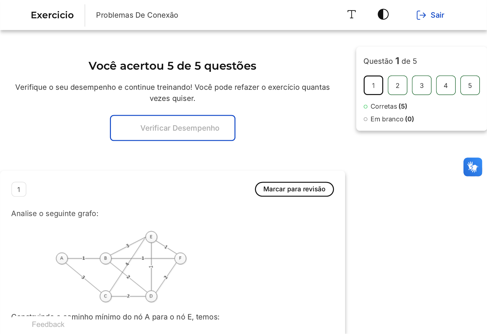 <p>Você acertou 5 de 5 questões</p><p>Verifique o seu desempenho e continue treinando! Você pode refazer o exercício quantas</p><p>vezes quiser.</p><p>Verificar Desempenho</p><p>1 Marcar para revisão</p><p>Analise o seguinte grafo:</p><p>Construindo o caminho mínimo do nó A para o nó E, temos:</p><p>Questão 1 de 5</p><p>Corretas �5�</p><p>Em branco �0�</p><p>1 2 3 4 5</p><p>Feedback</p><p>Exercicio Problemas De Conexão Sair</p><p>A</p><p>B</p><p>C</p><p>D</p><p>E</p><p>A�B�D�E</p><p>A�C�D�E</p><p>A�B�F�E</p><p>A�B�E</p><p>A�C�E</p><p>Resposta correta</p><p>Parabéns, você selecionou a alternativa correta. Confira o gabarito comentado!</p><p>Gabarito Comentado</p><p>A resposta correta é: A�B�F�E</p><p>2 Marcar para revisão</p><p>A</p><p>B</p><p>C</p><p>Uma transportadora localizada em Florianópolis precisa entregar uma carga para seu</p><p>cliente em Fortaleza. O grafo a seguir apresenta a distância entre as cidades em</p><p>quilômetros:</p><p>Fonte: Autor</p><p>Para que essa entrega seja a mais rápida possível, qual é a menor distância entre estes</p><p>pontos?</p><p>3.971</p><p>4.011</p><p>4.084</p><p>D</p><p>E</p><p>3.876</p><p>4.579</p><p>Resposta correta</p><p>Parabéns, você selecionou a alternativa correta. Confira o gabarito comentado!</p><p>Gabarito Comentado</p><p>Fonte: Autor</p><p>A</p><p>B</p><p>C</p><p>D</p><p>E</p><p>3 Marcar para revisão</p><p>Grafo é um objeto formado por:</p><p>Vértices, arestas e nós.</p><p>Vértices e arestas.</p><p>Vértices apenas.</p><p>Arestas apenas.</p><p>Nós apenas.</p><p>Resposta correta</p><p>Parabéns, você selecionou a alternativa correta. Confira o gabarito comentado!</p><p>Gabarito Comentado</p><p>Um grafo é uma estrutura matemática que modela relações entre objetos. Ele é</p><p>composto por vértices (ou nós) e arestas. As arestas são as conexões que ligam os</p><p>A</p><p>B</p><p>vértices. Portanto, a alternativa correta é a B, que afirma que um grafo é formado por</p><p>vértices e arestas.</p><p>4 Marcar para revisão</p><p>Um viajante deve visitar clientes instalados em 6 cidades da Península Ibérica. Procura-se</p><p>determinar qual o percurso mais econômico, tendo em atenção, exclusivamente, as</p><p>distâncias entre as cidades. A tabela a seguir apresenta essas distâncias em quilômetros:</p><p>O viajante, neste momento, está em Faro. A melhor rota que deve ser seguida pelo viajante</p><p>é:</p><p>1799</p><p>1798</p><p>C</p><p>D</p><p>E</p><p>1435</p><p>1586</p><p>1582</p><p>Resposta correta</p><p>Parabéns, você selecionou a alternativa correta. Confira o gabarito comentado!</p><p>Gabarito Comentado</p><p>5 Marcar para revisão</p><p>Considere a estrutura a seguir, que representa um problema de rotas em pequena escala:</p><p>A</p><p>B</p><p>C</p><p>D</p><p>E</p><p>Considere, por hipótese, que se solicitou a um agente de fiscalização à regulação de</p><p>transporte da Agência de Transporte do Estado de São Paulo �ARTESP) utilizar alguma</p><p>estratégia lógica para, partindo do ponto 1, chegar ao ponto 6 usando a menor rota. De um</p><p>mesmo ponto, pode haver mais de uma rota, com distâncias diferentes. A lógica correta</p><p>utilizada pelo Agente, em função dos pontos a serem percorridos, foi:</p><p>�1� �2,3� �2,4� �5,6��6�, caminho mais curto 1�2�5�6.</p><p>�1� �2� �4� �6�, caminho mais curto 1�2�4�6.</p><p>�1� �3,2� �4,5� �6�, caminho mais curto 1�3�4�6.</p><p>�6� �5,4� �3,1� �1�, caminho mais curto 6�4�3�1, que é igual a 1�3�4�6.</p><p>�4� �5,3� �2,1� �1�, caminho mais curto 6�4�3�5�2�1, que é igual a 1�2�5�3�4�6.</p><p>Resposta correta</p><p>Parabéns, você selecionou a alternativa correta. Confira o gabarito comentado!</p><p>Gabarito Comentado</p>