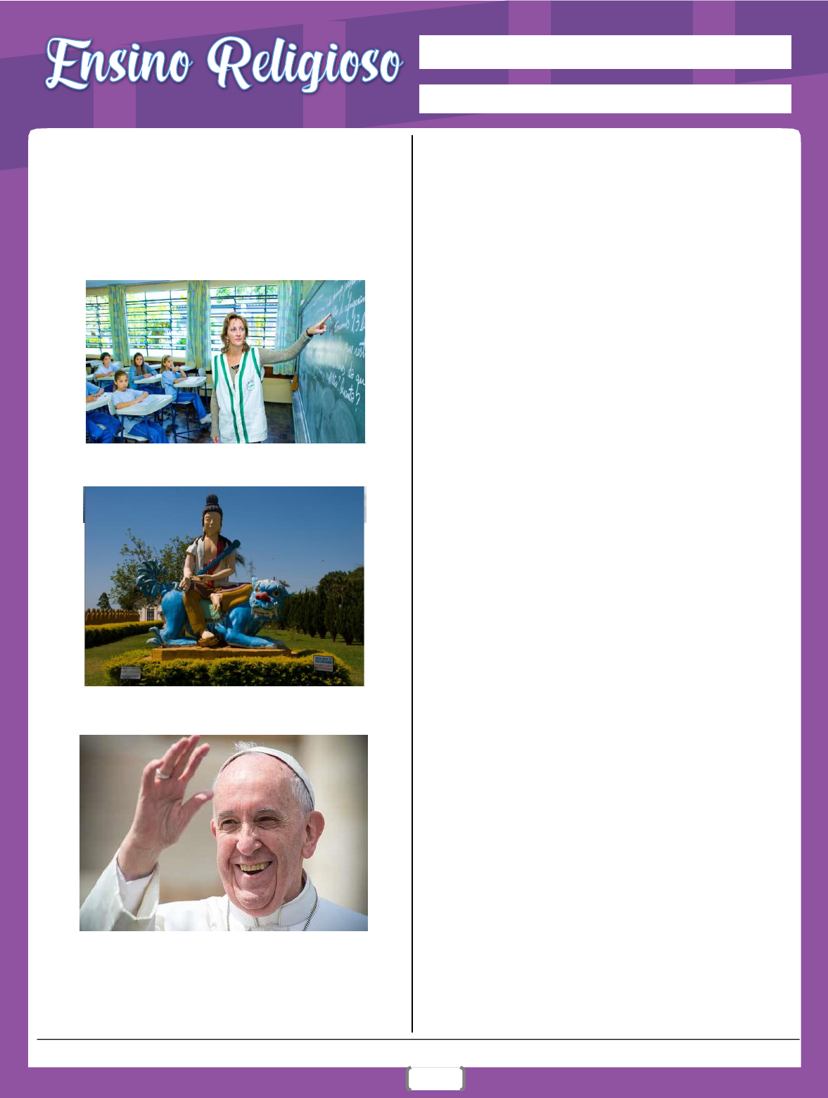 <p>a existência de um único Deus</p><p>(Alá). Inicia-se então a fase de pregação desta</p><p>doutrina que é monoteísta.</p><p>Inicialmente, em sua cidade natal,</p><p>Muhammad encontrou grande resistência e</p><p>oposição à sua pregação e acabou sendo</p><p>perseguido, tendo que migrar para a cidade</p><p>vizinha de Medina no ano de 622 d.C. Este</p><p>acontecimento é conhecido como Hégira,</p><p>marco inicial do calendário muçulmano.</p><p>Foi em Medina que Muhammad</p><p>(Maomé) foi reconhecido como líder religioso</p><p>capaz de unificar e estabelecer a paz entre as</p><p>tribos árabes e implantar a religião</p><p>monoteísta.</p><p>a) Escolha um líder religioso que</p><p>surgiu ao longo da história e pesquise a sua</p><p>biografia e sua prática religiosa.</p><p>Siddartha Gautama – Budismo</p><p>Kung-Fu-Tse - Confucionismo</p><p>Allan Kardec - Espiritismo</p><p>Mãe Menininha do Gantois - Candomblé</p><p>Agora é</p><p>nossa vez!</p><p>Questão 04</p><p>Aluno(a):</p><p>_______________________________________</p><p>1º PERÍODO – 7º ano – Turma: ___</p><p>SEMED | Regime Especial de Atividade Não Presenciais – Paulino Neves/MA</p><p>5</p><p>b) Escolha um líder e complete o</p><p>espaço abaixo com o nome dele. Depois,</p><p>escreva as atitudes que demonstram ser ele</p><p>um bom líder a serviço da humanidade.</p><p>_________________________________</p><p>________________________ é o meu</p><p>modelo de líder.</p><p>___________________________________</p><p>___________________________________</p><p>___________________________________</p><p>___________________________________</p><p>Cristianismo</p><p>De acordo com a tradição cristã, Deus</p><p>enviou ao mundo seu filho Jesus para salvar a</p><p>humanidade. Jesus Cristo pregava a paz, a</p><p>harmonia, o respeito a um só Deus e o amor</p><p>entre os homens, sendo considerado um líder</p><p>carismático.</p><p>Jesus nasceu em Belém, na região da</p><p>Judeia, em uma família simples e humilde.</p><p>Com 30 anos de idade inicia a pregação das</p><p>ideias do cristianismo na região onde vivia.</p><p>Segundo a fé cristã, Jesus Cristo em</p><p>suas peregrinações começa a realizar</p><p>milagres e reúne discípulos e apóstolos por</p><p>onde passa. Perseguido e preso foi</p><p>condenado à morte.</p><p>A religião cristã foi resultado de um</p><p>processo de institucionalização que começou</p><p>com os apóstolos, particularmente com Paulo,</p><p>o que contribui com a sua expansão.</p><p>Geralmente, a escolha do líder religioso</p><p>acontece pelo princípio do carisma. Por meio</p><p>de seu dom e sua capacidade de agregar,</p><p>liderar, conduzir e anunciar o evangelho à sua</p><p>comunidade.</p><p>O candidato a líder religioso segue a</p><p>estrutura organizacional de sua religião e são</p><p>chamados por diferentes nomes: o papa, o</p><p>sacerdote, o pastor, o xeique, o monge, que</p><p>partilham com os seus seguidores os</p><p>ensinamentos de sua religião.</p><p>No Cristianismo encontram-se diversas</p><p>divisões de “igrejas” ou “denominações</p><p>cristãs”. Entre elas estão o catolicismo</p><p>romano, o ortodoxo, o protestantismo, entre</p><p>outros.</p><p>Se você tivesse a chance de ser um líder</p><p>religioso, o que você faria? Utilize o seu</p><p>conhecimento para produzir um texto que</p><p>esboce suas atitudes.</p><p>_____________________________________</p><p>_____________________________________</p><p>Agora é</p><p>nossa vez!</p><p>Questão 05</p>a existência de um único Deus (Alá). Inicia-se então a fase de pregação desta doutrina que é monoteísta. Inicialmente, em sua cidade natal, Muhammad encontrou grande resistência e oposição à sua pregação e acabou sendo perseguido, tendo que migrar para a cidade vizinha de Medina no ano de 622 d.C. Este acontecimento é conhecido como Hégira, marco inicial do calendário muçulmano. Foi em Medina que Muhammad (Maomé) foi reconhecido como líder religioso capaz de unificar e estabelecer a paz entre as tribos árabes e implantar a religião monoteísta. a) Escolha um líder religioso que surgiu ao longo da história e pesquise a sua biografia e sua prática religiosa. Siddartha Gautama – Budismo Kung-Fu-Tse - Confucionismo Allan Kardec - Espiritismo Mãe Menininha do Gantois - Candomblé Agora é nossa vez! Questão 04 Aluno(a): _______________________________________ 1º PERÍODO – 7º ano – Turma: ___ SEMED | Regime Especial de Atividade Não Presenciais – Paulino Neves/MA 5 b) Escolha um líder e complete o espaço abaixo com o nome dele. Depois, escreva as atitudes que demonstram ser ele um bom líder a serviço da humanidade. _________________________________ ________________________ é o meu modelo de líder. ___________________________________ ___________________________________ ___________________________________ ___________________________________ Cristianismo De acordo com a tradição cristã, Deus enviou ao mundo seu filho Jesus para salvar a humanidade. Jesus Cristo pregava a paz, a harmonia, o respeito a um só Deus e o amor entre os homens, sendo considerado um líder carismático. Jesus nasceu em Belém, na região da Judeia, em uma família simples e humilde. Com 30 anos de idade inicia a pregação das ideias do cristianismo na região onde vivia. Segundo a fé cristã, Jesus Cristo em suas peregrinações começa a realizar milagres e reúne discípulos e apóstolos por onde passa. Perseguido e preso foi condenado à morte. A religião cristã foi resultado de um processo de institucionalização que começou com os apóstolos, particularmente com Paulo, o que contribui com a sua expansão. Geralmente, a escolha do líder religioso acontece pelo princípio do carisma. Por meio de seu dom e sua capacidade de agregar, liderar, conduzir e anunciar o evangelho à sua comunidade. O candidato a líder religioso segue a estrutura organizacional de sua religião e são cham