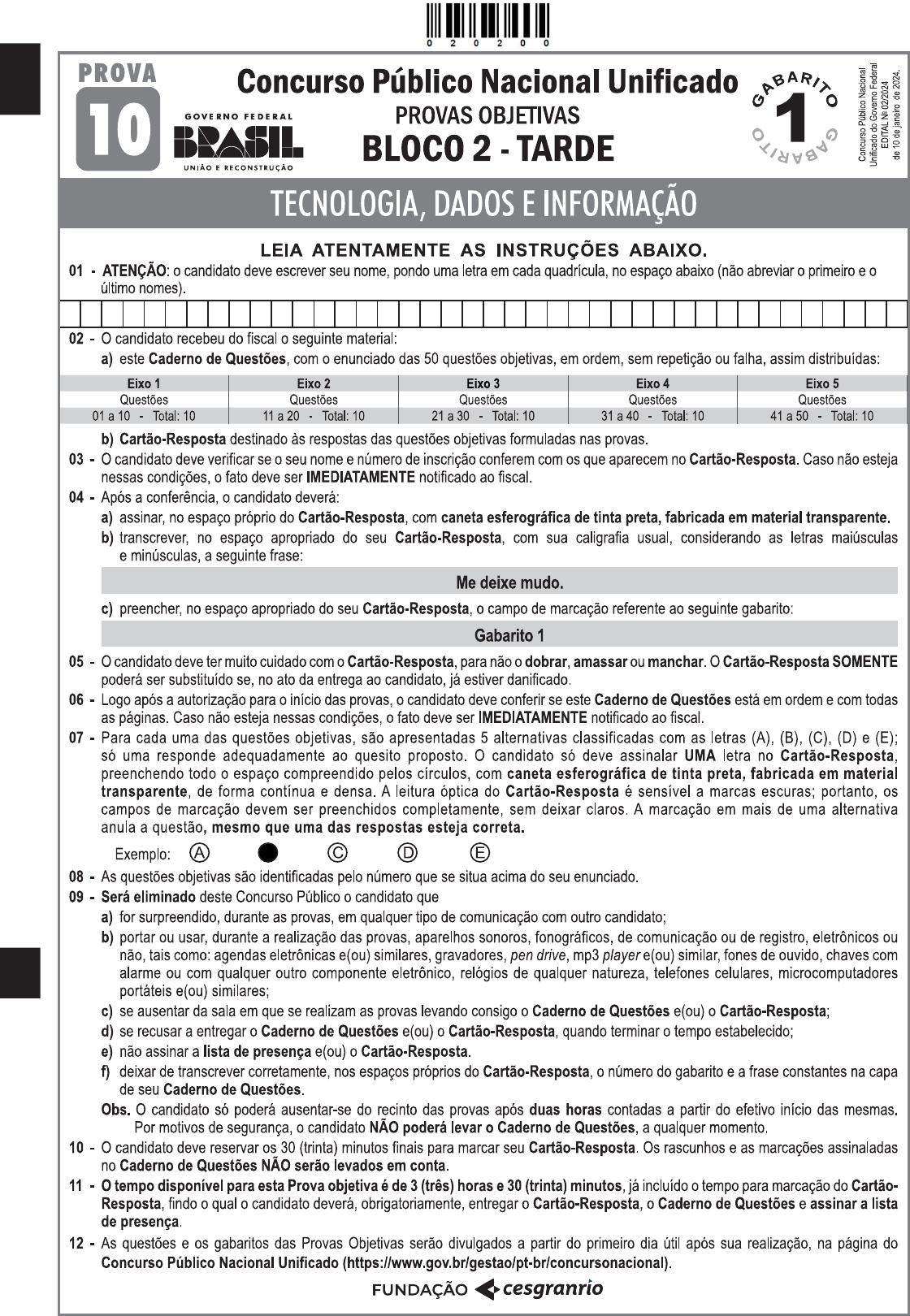 <p>0 2 0 2 PROVA Concurso Público Nacional Unificado 10 de GOVERNO FEDERAL PROVAS OBJETIVAS BRASIL BLOCO 2 TARDE de RECONSTRUCÃO TECNOLOGIA, DADOS E INFORMAÇÃO LEIA ATENTAMENTE AS INSTRUÇÕES ABAIXO. 01 ATENÇÃO o candidato deve escrever seu nome, pondo uma letra em cada quadrícula, no espaço abaixo (não abreviar o primeiro e o último nomes). 02 candidato recebeu do fiscal seguinte material: a) este Caderno de Questões, com o enunciado das 50 questões objetivas, em ordem, sem repetição ou falha, assim distribuídas: Eixo 1 Eixo 2 Eixo 3 Eixo 4 Eixo 5 Questões Questões Questões Questões Questões Total: 10 Total: 10 Total: 10 Total: 10 b) Cartão-Resposta destinado às respostas das questões objetivas formuladas nas provas. 03 candidato deve verificar se seu nome e número de inscrição conferem com os que aparecem no Cartão-Resposta. Caso não esteja nessas condições, o fato deve ser IMEDIATAMENTE notificado ao fiscal. 04 Após a conferência, o candidato deverá: a) assinar, no espaço próprio do Cartão-Resposta, com caneta esferográfica de tinta preta, fabricada em material transparente. b) transcrever, no espaço apropriado do seu Cartão-Resposta, com sua caligrafia usual considerando as letras maiúsculas e minúsculas, a seguinte frase: Me deixe mudo. c) preencher, no espaço apropriado do seu Cartão-Resposta, campo de marcação referente ao seguinte gabarito: Gabarito 1 05 candidato deve ter muito cuidado com Cartão-Resposta, para não dobrar, amassar ou manchar. Cartão-Resposta SOMENTE poderá ser substituído se. no ato da entrega ao candidato, já estiver danificado. 06 Logo após a autorização para o início das provas, o candidato deve conferir se este Caderno de Questões está em ordem e com todas as páginas. Caso não esteja nessas condições, o fato deve ser IMEDIATAMENTE notificado ao fiscal. 07 Para cada uma das questões objetivas, são apresentadas 5 alternativas classificadas com as letras (A), (B), (C), (D) e (E); só uma responde adequadamente ao quesito proposto. O candidato só deve assinalar UMA letra no Cartão-Resposta, preenchendo todo o espaço compreendido pelos círculos, com caneta esferográfica de tinta preta, fabricada em material transparente, de forma contínua e densa. A leitura óptica do Cartão-Resposta é sensível a marcas escuras; portanto, os campos de marcação devem ser preenchidos completamente, sem deixar claros. A marcação em mais de uma alternativa anula a questão, mesmo que uma das respostas esteja correta. Exemplo: D E 08 As questões objetivas são identificadas pelo número que se situa acima do seu enunciado. 09 Será eliminado deste Concurso Público o candidato que a) for surpreendido, durante as em qualquer tipo de comunicação com outro candidato; b) portar ou usar, durante a realização das provas, aparelhos sonoros, fonográficos, de comunicação ou de registro, eletrônicos ou não, tais como: agendas eletrônicas e(ou) similares, gravadores, pen drive, mp3 player e(ou) similar, fones de ouvido, chaves com alarme ou com qualquer outro componente eletrônico, relógios de qualquer natureza, telefones celulares, microcomputadores portáteis e(ou) similares; c) se ausentar da sala em que se realizam as provas levando consigo Caderno de Questões e(ou) o Cartão-Resposta; d) se recusar a entregar o Caderno de Questões e(ou) o Cartão-Resposta, quando terminar o tempo estabelecido; e) não assinar a lista de presença e(ou) Cartão-Resposta. f) deixar de transcrever corretamente, nos espaços próprios do Cartão-Resposta, o número do gabarito e a frase constantes na capa de seu Caderno de Obs. candidato só poderá ausentar-se do recinto das provas após duas horas contadas a partir do efetivo início das mesmas. Por motivos de segurança, candidato NÃO poderá levar o Caderno de Questões, a qualquer momento. 10 candidato deve reservar os 30 (trinta) minutos finais para marcar seu Cartão-Resposta. Os rascunhos e as marcações assinaladas no Caderno de Questões NÃO serão levados em conta. 11 o tempo disponível para esta Prova objetiva é de 3 (três) horas e 30 (trinta) minutos, já incluído o tempo para marcação do Cartão- Resposta, findo qual o candidato deverá, obrigatoriamente, entregar Cartão-Resposta, o Caderno de Questões e assinar a lista de presença. 12 As questões e os gabaritos das Provas Objetivas serão divulgados a partir do primeiro dia útil após sua realização, na página do Concurso Público Nacional Unificado FUNDAÇÃO cesgranrio</p><p>RASCUNHO</p><p>CONCURSO PÚBLICO NACIONAL UNIFICADO EIXO 3 Diferentes abordagens de planejamento estratégico 1 orientado ao setor público foram desenvolvidas nos úl- Em um esforço para implementar a sua política de gestão timos anos, tais como: planejamento normativo tradicio- de riscos, uma entidade pública optou por iniciar o pro- nal (PNT), planejamento estratégico situacional (PES), cesso de identificação e avaliação de riscos que estejam prospectiva estratégica foresight, metodologia da Global associados aos seus sete projetos estratégicos definidos Business Network e planejamento não euclidiano. para o quadriênio. Para os riscos identificados, foi gerado Diferentemente do PES, no PNT, segundo o(a) o mapa de calor apresentado no quadro a seguir (A) autor do planejamento, o sujeito é parte do objeto pla- nejado, pois ele se encontra no contexto do plano e Impacto Muito Baixo Baixo Médio Alto Muito Alto tem interesses e em vez de existir um su- [1] [2] [3] [4] [5] jeito que planeja um objeto, e uma separação entre quem planeja e quem faz. Probabilidade (B) perspectiva sobre o futuro, trabalha-se com um con- Muito Alta [5] R1 R7 junto de apostas, a partir da explicação situacional dos atores sociais, em vez de se projetar o futuro, a partir Alta [4] R6 R4 de um diagnóstico supostamente objetivo do passado. Média [3] (C) previsibilidade, assume-se a incerteza, em vez de se Baixa [2] R5 R3 ado