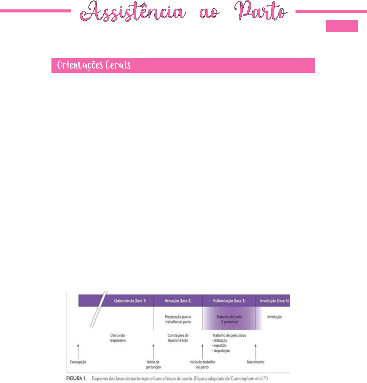 <p>- A parturição de um novo ser humano representa a essência da transmissão</p><p>e da continuidade da vida entre as gerações. Pode ser tanto um processo</p><p>naturalmente fisiológico como profundamente complexo e disfuncional. Por</p><p>isso, é essencial fornecer tudo o que for necessário para assegurar que a</p><p>mãe e o recém-nascido (RN) recebam os cuidados mais seguros e</p><p>humanizados possíveis.</p><p>- Portanto, o trabalho de parto (TP), o parto e o puerpério são períodos nos</p><p>quais a atenção médica e de enfermagem qualificada pode ser decisiva para</p><p>o bom desfecho da gestação. Neste contexto, os partos ocorridos dentro</p><p>dos hospitais, quando comparados com os partos ocorridos em outros locais</p><p>(domicílios, casas de parto e centros de partos normais) estão</p><p>acompanhados de mais intervenções e menos morbimortalidade perinatal.</p><p>- Muitas gestantes chegam na maternidade com medo e ansiedade, por isso</p><p>é de extrema importância orientá-las durante o pré-natal quanto ao</p><p>momento do trabalho de parto.</p><p>- O ideal é que a gestante tenha um local adequado e exclusivo, com todos</p><p>os aparatos necessários, para o momento do seu parto.</p><p>Da Concepção até o momento que os receptores reconhecem a ação da</p><p>ocitocina, iniciando o trabalho de parto (Assistência ao Parto), é o Plano de</p><p>Parto (Educação Antenatal).</p><p>A fase de Quiescência corresponde à fase que o útero não está contraindo,</p><p>não responde à ocitocina, e ocorre do 6º ao 7º mês até a parturição. Na fase</p><p>Giovanna Lopes</p><p>de Ativação, os receptores iram começar a responder à ocitocina</p><p>(contratilidade -> ação uterotônica); nesta fase, a hipófise faz a ocitocina, e</p><p>na lactação ela irá produzir a prolactina. As contrações leves, indolores,</p><p>espaçadas e de baixa intensidade são as de Braxton-Hicks. Já na fase ativa</p><p>do parto, o colo começa a se dilatar cerca de 1cm a cada hora, onde irá</p><p>ocorrer a expulsão e a dequitação. No puerpério, todas as modificações</p><p>fisiológicas involuem, voltam ao normal.</p><p>- O Trabalho de Parto é o período que vai desde o início das contrações</p><p>uterinas regulares associadas ao apagamento e à dilatação cervical até a</p><p>expulsão do concepto e da placenta. O reconhecimento do início do TP nem</p><p>sempre é simples, pois, muitas vezes, o seu diagnóstico só é confirmado</p><p>retrospectivamente.</p><p>- A admissão de uma parturiente para acompanhamento do TP deve ser feita</p><p>com base no grau de dilatação e na presença de contrações uterinas</p><p>regulares e frequentes. Quando a gestante chega ao centro obstétrico</p><p>(CO) com colo apagado, dilatação cervical de 4cm ou mais e contrações</p><p>uterinas com frequência de pelo menos 2 a cada 10 minutos, presume-</p><p>se que tenha alcançado a fase ativa do TP. Esse método presuntivo de</p><p>identificar o TP traz muitas incertezas durante os períodos iniciais.</p><p>- As pacientes com fatores de risco gestacionais (por exemplo, restrição de</p><p>crescimento fetal (RCF), pós-datismo, doença hipertensiva, diabetes melito</p><p>gestacional, etc.) devem ser admitidas mesmo na fase latente, devido ao</p><p>risco de insuficiência placentar e comprometimento fetal.</p><p>- Por outro lado, nas gestantes de risco habitual, a internação na fase ativa</p><p>do TP deve ser preferida.</p><p>- Uma admissão precoce para cuidado intra-hospitalar dessas pacientes está</p><p>associada com TP mais longo, maior uso de ocitocina, maior taxa de</p><p>cesariana e menores taxas de satisfação na assistência recebida.</p><p>- O Trabalho de Parto pode ser definido como uma sequência de contrações</p><p>uterinas involuntárias e coordenadas que resultam no apagamento e na</p><p>dilatação do colo ut erino. Tais contrações associadas ao esforço voluntário</p><p>da parede abdominal levam à expulsão do feto e das membranas ovulares.</p><p>- O TP depende da morfologia e configuração da pelve materna, da</p><p>apresentação e do tamanho fetal e da contratilidade uterina.</p><p>- O canal de parto é constituído pela pelve óssea (sacro, cóccix, ilíacos</p><p>esquerdo e direito) e pelos tecidos moles (cérvice e musculatura do assoalho</p><p>pélvico), que oferecem graus variados de resistência à expulsão fetal.</p><p>- A pequena pelve é a que tem expressão obstétrica, pois forma o trajeto</p><p>duro do parto; é limitada, acima, pelo estreito superior (do promontório à</p><p>borda da sínfise púbica) e, abaixo, pelo estreito inferior (da borda =</p><p>inferior da sínfise à ponta do cóccix). O estreito médio é a área de</p><p>menores diâmetros da pequena pelve e passa no nível das espinhas</p><p>isquiáticas.</p><p>- Durante o trabalho de parto, a apresentação fetal – por meio de forças</p><p>ativas e passivas - procura acomodar-se com suas menores dimensões, a fim</p><p>de transpor todos esses diâmetros ao longo do canal de parto.</p><p>- A pelvimetria clínica pode ser útil para qualitativamente identificar pelves</p><p>com maior risco de distocia.</p><p>- Para avaliar a contratilidade uterina, o método mais utilizado é a</p><p>tocografia, que é a interpretação gráfica das contrações uterinas durante o</p><p>trabalho de parto. Pode ser realizada de maneira externa (não invasiva) ou</p><p>interna (invasiva).</p><p>- A contração uterina pode ser avaliada em relação a: pressão ou tônus,</p><p>intensidade, frequência, duração e forma de onda contrátil. As contrações</p><p>ocorrem durante toda a gestação. No início da gestação, ocorrem pequenas</p><p>contrações com intensidade de 2 a 4mmHg e com frequência de 1 a 3</p><p>minutos (ondas de Alvarez) que podem ser registradas a partir de 9</p><p>semanas. Essas contrações não são sentidas pela paciente nem pela palpação</p><p>abdominal