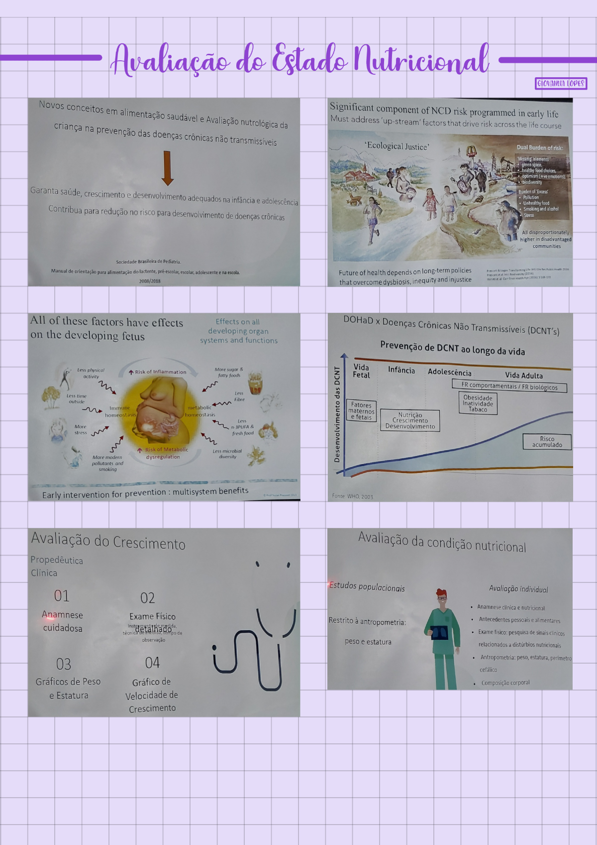 <p>Avaliação do Estado Nutricional GIOVANNA LOPES Novos conceitos em alimentação saudável e Avaliação nutrológica da Significant component of NCD risk programmed in early life Must address factors that drive risk across the life course criança na prevenção das doenças crônicas não transmissíveis Ecological Justice' Dual Burden of risk: elements green space healthy food choices optimism biodiversity Burden Garanta saúde, crescimento e desenvolvimento adequados na infância e adolescência Pollution Unhealthy food Smoking and alcohol Contribua para redução no risco para desenvolvimento de doenças crônicas Stress All disproportionately higher in disadvantaged communities Sociedade Brasileira de Future of health depends on long-term policies Prescott Logan Transforming Env Health 2016 Manual de orientação para alimentação do lactente, adolescente na escola. (2016) that overcome dysbiosis, inequity and injustice Envir Health (2016) 177 2008/2018 All of these factors have effects Effects on all on the developing fetus developing organ DOHaD Doenças Crônicas Não Transmissíveis (DCNT's) systems and functions Prevenção de DCNT ao longo da vida Vida Less More sugar & activity fatty foods Infância Risk of Inflammation Fetal Adolescência Vida Adulta FR comportamentais / FR biológicos Less Less time Obesidade Fibre outside Fatores Inatividade Immune metabolic maternos Tabaco homeostasis homeostasis e fetais Crescimento More n & Desenvolvimento stress fresh food Risco acumulado Risk of Metabolic Less microbial More modern dysregulation diversity pollutants and smoking Early intervention for prevention : multisystem benefits WHO 2003 Avaliação do Crescimento Avaliação da condição nutricional Propedêutica Clínica Estudos populacionais Avaliação individual 01 02 Anamnese clínica e nutricional Anamnese Exame Físico Restrito à antropometria: Antecedentes pessoais e alimentares cuidadosa técnica de observação 03 Exame pesquisa de sinais clínicos peso e estatura relacionados a distúrbios nutricionais Antropometria: peso, estatura, perímetro 04 cefálico Gráficos de Peso Gráfico de Composição corporal e Estatura Velocidade de Crescimento</p><p>Importância da vigilância do crescimento pôndero-estatural Prevalência: Chamada Nutricional - Região Norte 2007 Distribuição do déficit de altura-para-idade Evolução do IMC do nascimento até a fase adulta Prevalência: chamada nutricional Região Norte 2007 18.5 16-17 Distribuição do déficit de altura-para-idade: BMI childhood 31,0% 1 1 1 1 with young 25,1% 29,5% PARA Ganho ponderal precoce Ganho de + 1 Z escore no peso (< anos) (entre 0 e 6 meses) 30,3% 12,2% vezes 1,7% gordura corporal aos 17 6,3% risco de obesidade anos PNDS (2006) < -2 DP (idade escolar e vida adulta) Risco para Síndrome Metabólica Brasil Norte MARASMO KWASHIORKOR DESNUTRIÇÃO KWASHIORKOR Com infecção Foto:Benzecry Altamiro Vilhena Desnutrição : Formas clínicas e fisiopatologia Kwashiorkor Marasmus Protuberant belly Prominent bones Stunting Wasting people are too Obesity people are too thin short for their age for their height people are overweight Decrease in sub cutaneous fat rash Xerosis Fotos do arquivo pessoal Loose skin Poor wound healing Desnutrição: Marasmo James Netter's Gastroenterology 190 534-635 2020 Copyright 2020 by Desnutrição: kwashiorkor</p><p>Crescimento Crescimento Sistema Dieta Endócrino Energia Ambiente hereditária Calorias, Proteínas, Lipideos, Condições Condições Vitaminas, Sais, Água Urbanização Fatores Sexo Interação mãe-filho; Fatores Etnia Extrínsicos Atividade Tipos de Crescimento Endógenos Geral Neural Linfóide Genital Sistema Energia Imunidade (timo, gg Sexo Etnia Altura peso SNC sua mielinização linfáticos, adenóides intestinais) Crescime Endógen into Doença os Crescimento 0-2 anos Repleção: 6 a 12 meses antes da puberdade Dieta Ambiente Estirão variável, duração média de 24 Calorias, Proteínas, Condições Lipideos, Condições sócio- Vitaminas, Sais, Água. econômicas Urbanização Interação mãe-filho Atividade física fetal Tipos de Crescimento 200% Monitorização do Crescimento 160 Esquema mínimo de Curvas de consultas Desvio-padrão 140 crescimento (escore z) 120 100% % Cabeça no primeiro ano de vida: en 80 e cérebro 12 Número de desvios padrão abaixo ou no segundo de vida: 18 e acima da mediana da população de 24 meses; referência em que se encontra 60 no terceiro, quarto quinto da Geral anos: pelo menos uma vez por NORMAL entre -2 e +2 DP ano. 40 20 Reprodutivo 6 8 10 12 14 16 18 20 Idade em anos</p><p>Crescimento OMS - Referencial oficialmente adotado pelo Antropometria MS http://nutricao.saude.gov.br Peso: menor quantidade de Tabela Brasileira roupas possível Altura: forma cuidadosa Comprimento (deitado < 2 anos) Estatura (em pé > 2 anos) WHO 2007 Circunferência craniana: <3 anos Circunferência braquial Circunferência abdominal Pregas cutâneas WHO Multicentre Growth Reference Study (MGRS) Oslo Norway vis SA Muscat Oman New Delhi Accra India Ghana AFERIÇÃO DO COMPRIMENTO DE CRIANÇAS MENORES DE 2 ANOS Pelotas Brazil Técnica de do comprimento segundo Plano de Tecnica de aferição da altura segundo Plano de Frankfurt AFERIÇÃO DO PESO DE CRIANÇAS MENORES DE 2 ANOS Se for utilizar balanca pediatrica ou Se for balança Nascimento Circunferência a 5 anos craniana por idade - meninos (escore World Health acima do esperado para idade 3 adequado para idade CC abaixo do esperado -3 para idade</p><p>Peso por Idade MENINOS Comprimento/estatura por idade MENINOS Do nascimento aos 5 anos (escores-z) Do nascimento aos 5 anos (escores-z) 3 Peso elevado para idade Estatura adequada para idade 22 Baixa 20 Peso adequado para Idade Muito baixa para idade para 3 Multo peso para idade Idade (meses completos anos) 2 anos 3 anos (meses completos e anos) IMC por idade MENINOS Dos 5 aos 19 anos (escores-z) 1 IMC por Idade MENINOS grave Do nasciment