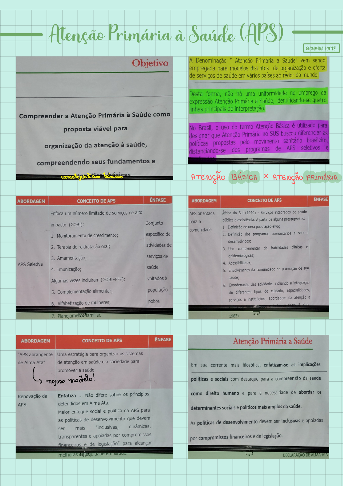 <p>Atenção à Saúde (APS) GIOVANNA LOPES Objetivo A Denominação Atenção Primária a Saúde" vem sendo empregada para modelos distintos de organização e oferta de serviços de saúde em vários países ao redor do mundo. Desta forma, não há uma uniformidade no emprego da expressão Atenção Primária a Saúde, identificando-se quatro linhas principais de interpretação. Compreender a Atenção Primária à Saúde como proposta viável para No Brasil, 0 uso do termo Atenção Básica é utilizado para designar que Atenção Primária no SUS buscou diferenciar as organização da atenção à saúde, políticas propostas pelo movimento sanitário brasileiro, distanciando-se dos programas de APS seletivos e compreendendo seus fundamentos e BASICA ABORDAGEM CONCEITO DE APS ABORDAGEM CONCEITO DE APS Enfoca um número limitado de serviços de alto APS orientada do Sul (1940) Serviços integrados de saúde impacto (GOBI): Conjunto para a pública e assistência. A partir de alguns pressupostos: 1. Definição de uma população-alvo; comunidade 1. Monitoramento de crescimento; específico de 2. Definição dos programas comunitários a serem desenvolvidos; 2. Terapia de reidratação oral; atividades de 3. Uso complementar de habilidades clinicas e 3. Amamentação; serviços de epidemiológicas; APS Seletiva 4. Acessibilidade; 4. Imunização; saúde 5. Envolvimento da comunidade na promoção de sua Algumas vezes incluíram (GOBI-FFF): voltados à saúde; 6. Coordenação das atividades incluindo a integração 5. Complementação alimentar; população de diferentes tipos de cuidado, especialidades, pobre serviços e instituições; abordagem da atenção a 6. Alfabetização de mulheres; Kark 7. Planejamento 1983) ABORDAGEM CONCEITO DE APS Atenção Primária a Saúde "APS abrangente Uma estratégia para organizar os sistemas de Alma Ata" de atenção em saúde e a sociedade para Em sua corrente mais filosófica, enfatizam-se as implicações promover a nopro políticas e sociais com destaque para a compreensão da saúde Renovação da Enfatiza Não difere sobre os princípios como direito humano e para a necessidade de abordar os APS defendidos em Alma Ata. determinantes sociais e políticos mais amplos da saúde. enfoque social e político da APS para as políticas de desenvolvimento que devem As políticas de desenvolvimento devem ser inclusivas e apoiadas ser mais "inclusivas, dinâmicas, transparentes e apoiadas por compromissos por compromissos financeiros e de legislação. financeiros e de legislação" para melhoras em DECLARAÇÃO DE ALMA-ATA</p><p>Atenção Primária a Saúde Atenção Básica à Saúde Atenção à saúde essencial, fundada em tecnologias apropriadas e "A Atenção Básica é conjunto de ações de saúde individuais, custo-efetivas, primeiro componente de um processo permanente familiares e coletivas que envolvem promoção, prevenção, proteção, de assistência sanitária orientado por princípios de solidariedade e diagnóstico, tratamento, reabilitação, redução de danos, cuidados paliativos e vigilância em saúde, desenvolvida por meio de práticas de equidade, cujo acesso deve ser garantido a todas as pessoas e cuidado integrado e gestão qualificada, realizada com equipe famílias e a comunidade mediante sua plena participação e com multiprofissional e dirigida à população em território definido, sobre foco na proteção e promoção da saúde. as quais as equipes assumem responsabilidade sanitária..." DECLARAÇÃO DE PNAB 2017 Características da Atenção Primária a Saúde Atributos da Atenção Primária à Saúde Acesso - contato Atributos Essenciais Longitudinalidade Atributos Acesso de primeiro Essenciais Integralidade principal contato perita The Atenção Primária a Coordenação do cuidado Perguntas norteadoras Saúde Orientação comunitária 1) A equipe de APS é acessível aos usuários na maior parte do tempo? Atributos Centralidade na família 2) As famílias percebem que tem acesso à Atenção Primária adequada? Derivados 3) Há encaminhamento dos profissionais da APS para acesso à atenção Competencia especializada? Atributos da Atenção Primária à Saúde Perguntas norteadoras Atributos 1) Há 0 cadastramento/registro de pacientes a um Essenciais Longitudinalidade 2) As famílias são atendidas pela mesma equipe ao longo Assunção de responsabilidade longitudinal pelo paciente com do tempo? continuidade da relação profissional/equipe/unidade de saúde- paciente, ao longo da vida, independentemente da ausência ou da 3) Há relação mútua de confiança e conhecimento entre presença da doença. famílias e profissionais das equipes APS? Estabelecimento de vínculo, para isso a clientela deve ser adscrita territorialmente. joob</p><p>Atributos da Atenção Primária à Saúde Perguntas norteadoras Atributos Essenciais 1) A equipe é capaz de reconhecer os problemas de saúde Integralidade dos indivíduos da comunidade? (abrangência) 2) Qual abrangência do pacote de serviços oferecidos? Reconhecimento de amplo espectro de necessidades, considerando- 3) Os pacientes são referidos para 0 especialista quando se os âmbitos orgânicos, psíquicos e sociais da saúde; apropriado? Implica oferecer serviços preventivos e curativos e garantir acesso a todos os tipos de serviços, quando necessário. Atributos da Atenção Primária à Saúde Atributos Essenciais Coordenação do cuidado Cirurgias Consultas Urgências Coordenação das diversas ações e serviços essenciais para resolver Cuidados de Saúde Aconselhamento Hospitalares necessidades menos frequentes e mais complexas; MCDT Receitas Pressupõe a organização do cuidado e da transferência de Cuidados Cuidados de Saúde Continuados Primários Integrados informações entre profissionais da atenção primária e especialistas. Atributos da Atenção Primária à Saúde Atributos Derivados Perguntas norteadoras: Orientação comunitária 1) Há 