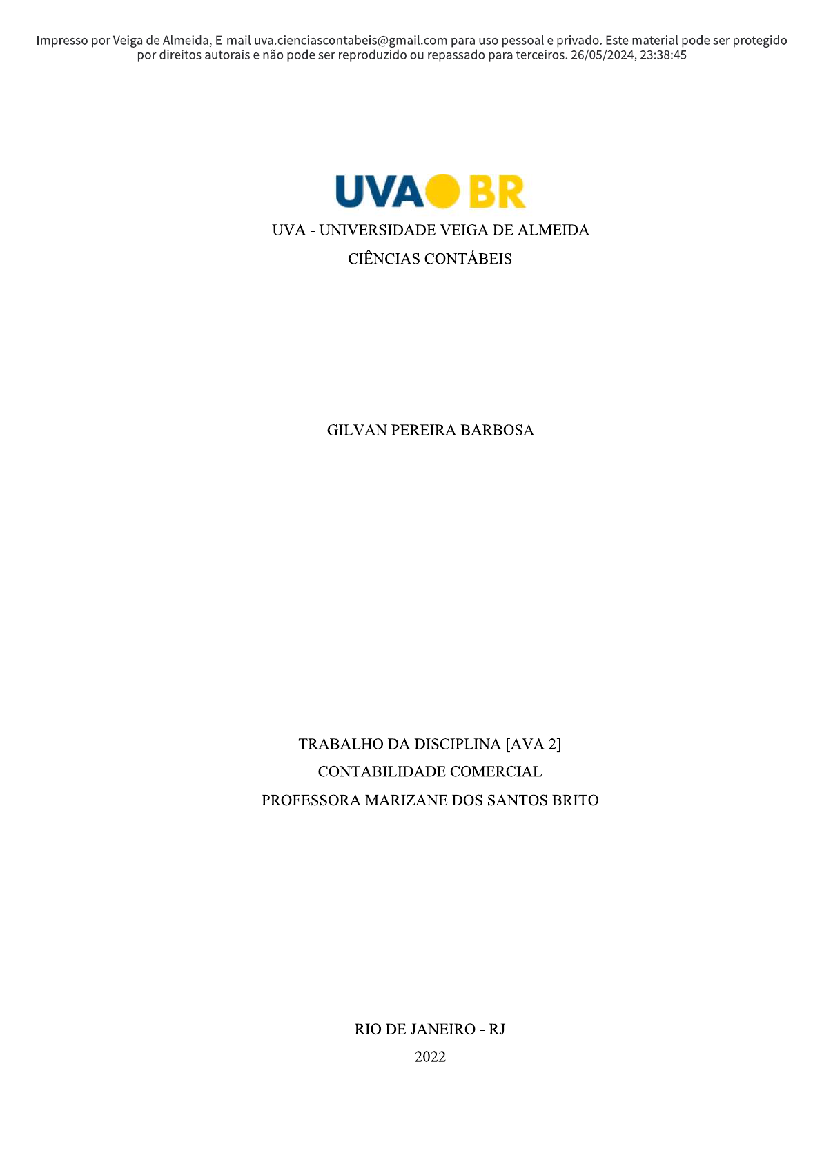 <p>Impresso por Veiga de Almeida, E-mail para uso pessoal e privado. Este material pode ser protegido por direitos autorais e não pode ser reproduzido ou repassado para terceiros. 26/05/2024, 23:38:45 UVA - UNIVERSIDADE VEIGA DE ALMEIDA CIÊNCIAS CONTÁBEIS GILVAN PEREIRA BARBOSA TRABALHO DA DISCIPLINA 2] CONTABILIDADE COMERCIAL PROFESSORA MARIZANE DOS SANTOS BRITO RIO DE JANEIRO - RJ 2022</p><p>Impresso por Veiga de Almeida, E-mail uva.cienciascontabeis@gmail.com para uso pessoal e privado. Este material pode ser protegido por direitos autorais e não pode ser reproduzido ou repassado para terceiros. 26/05/2024, 23:38:45 Situação Problema: José e Vladimir resolvem ser sócios de uma loja comercial no Centro da Cidade do Rio de Janeiro através de uma sociedade limitada. Para o funcionamento desta loja foram contratados quatro empregados com salários de R$ 1.200,00 cada e um supervisor com salário de R$ 3.000,00. Os estoques adquiridos inicialmente foram no valor de R$ 600.000,00, com estimativas de compras ao longo do ano de R$ Além disto, a empresa ainda paga 4.000,00 de aluguel por mês. Para o faturamento foram traçados 3 cenários: Cenário 1 A loja espera faturar R$ durante o ano, sem expectativa de sobras de estoques, ou seja, tudo que foi comprado e estava no estoque inicial foi vendido. Cenário 2 previsão mais cautelosa indica que a empresa venderá apenas 80% dos estoques e compras realizados neste ano. Neste caso o faturamento seria de R$ Cenário 3 previsão mais pessimista onde 50% dos estoques e compras seriam vendidas. faturamento seria de R$ 1.600.000,00 Diante dos três cenários, apresente um relatório indicando os gastos a serem realizados no ano e o lucro antes dos impostos e contribuições projetados para cada um dos cenários projetados. Resolução: INSS 2022 Até 1.212,00 (salário-mínimo) - 7,5% Entre R$ 1. 212,00 e 9% Entre R$ 2.427,36 e R$ 3.641,03 - 12% Entre R$ 3.641,03 e R$ 7.087,22- 14% Desconto IRPF Faixa Salarial (em R$) Alíquota Parcela a Deduzir do IRPF Até 1.903,98 0% De 1.903,99 a 2.826,65 7,5% R$ 142,80 De 2.826,66 a 3.751,05 15,0% R$ 354,80 De 3.751,06 a 4.664,68 22,5% R$ 636,13 Acima de 4.664,68 27,5% R$</p><p>Impresso por Veiga de Almeida, E-mail uva.cienciascontabeis@gmail.com para uso pessoal e privado. Este material pode ser protegido por direitos autorais e não pode ser reproduzido ou repassado para terceiros. 26/05/2024, 23:38:45 FGTS: 8% sobre o salário bruto 1- Elaborar o planejamento de gastos com funcionários com provisão de férias, 13°, FGTS, recolhimento de imposto de renda (IRPF) e contribuições sociais: Salários: D Despesa com salários (Resultado) R$ 84.827,70 C - Pagamentos de funcionário (Salário PC) R$ 84.827,70 Provisão de férias: D - Despesa c/ férias (Resultado) R$ 9.314,78 C - Benefícios a serem pagas a empregados R$ 9.314,78 Provisão 13° salário: D - Despesa c/ 13° salário (Resultado) R$ 7.068,98 C - Benefícios a serem pagos (13° - PC) R$ FGTS: D Despesa c/ FGTS (Resultado) R$ 7.488,00 C - Benefícios a serem pagos (FGTS - PC) R$ 7.488,00 INSS: Despesa c/ INSS (Resultado) R$ 9.076,45 Benefícios recolhidos (INSS PC) R$ 9.076,45 IRPF: Despesa c/ IRPF (Resultado) R$ 992,03 Benefícios recolhidos (IRPF PC) R$ 992,03 2- Considerar nas compras realizadas o valor de 18% do ICMS tanto para compra como para venda de mercadorias. Cenário 1 A loja espera faturar R$ 3.200.000,00 durante o ano, sem expectativa de sobras de estoques, ou seja, tudo que foi comprado e estava no estoque inicial foi vendido. Contabilização de compra: D - Estoque de mercadorias (AC) R$ 1.312.000,00 D ICMS a recuperar (AC) R$ 288.000,00 C Caixa (AC) R$ 1.600.000,00 Contabilização de venda: D - Caixa (Ativo Circulante): C - Receita de venda de mercadoria (Rec. Operacional): D - CMV (Resultado): R$ 1.312.000,00 C - Estoques (Ativo Circulante): D - Despesas com ICMS (Resultado): R$ 576.000,00 C ICMS a recolher (Passivo): R$ 576.000,00</p><p>Impresso por Veiga de Almeida, E-mail uva.cienciascontabeis@gmail.com para uso pessoal e privado. Este material pode ser protegido por direitos autorais e não pode ser reproduzido ou repassado para terceiros. 26/05/2024, 23:38:45 Cenário 2 - previsão mais cautelosa indica que a empresa venderá apenas 80% dos estoques e compras realizados neste ano. Neste caso o faturamento seria de R$ 2.560.000,00 Contabilização de compra: D - Estoque de mercadorias (AC) D - ICMS a recuperar (AC) R$ 288.000,00 C Caixa (AC) R$ 1.600.000,00 Contabilização de venda: D - Caixa (Ativo Circulante): R$ 2.560.000,00 C - Receita de venda de mercadoria (Rec. Operacional): R$ 2.560.000,00 D - CMV (Resultado): C - Estoques (Ativo Circulante): R$ 1.049.600,00 D - Despesas com ICMS (Resultado): R$ 460.000,00 C - ICMS a recolher (Passivo): R$ 460.000,00 Cenário 3 - previsão mais pessimista onde 50% dos estoques e compras seriam vendidas. faturamento seria de R$ 1.600.000,00 Contabilização de compra: D - Estoque de mercadorias (AC) 1.312.000,00 D - ICMS a recuperar (AC) R$ 288.000,00 C - Caixa (AC) R$ 1.600.000,00 Contabilização de venda: D - Caixa (Ativo Circulante): R$ 1.600.000,00 C - Receita de venda de mercadoria (Rec. Operacional): R$ 1.600.000,00 D - CMV (Resultado): R$ 656.000,00 C - Estoques (Ativo Circulante): R$ 656.000,00 D - Despesas com ICMS (Resultado): R$ 288.000,00 C ICMS a recolher (Passivo): R$ 288.000,00 Diante dos três cenários, apresente um relatório indicando os gastos a serem realizados no ano e o lucro antes dos impostos e contribuições projetados para cada um dos cenários projetados. Cenário 1 (+) Receita de Operações R$ 3.200.000,00 (-) Deduções sobre a Receita ICMS R$ 576.000,00 (=) Receita Líquida R$ 2.624.000,00 (-) Custo de mercadorias vendidas R$ 1.312.000,00</p><p>Impresso por Veiga de Almeida, E-mail uva.cienciascontabeis@gmail.com para uso pessoal e privado. Este material pode ser protegido por direitos autorais e não pode ser reproduzido ou repassado para t
