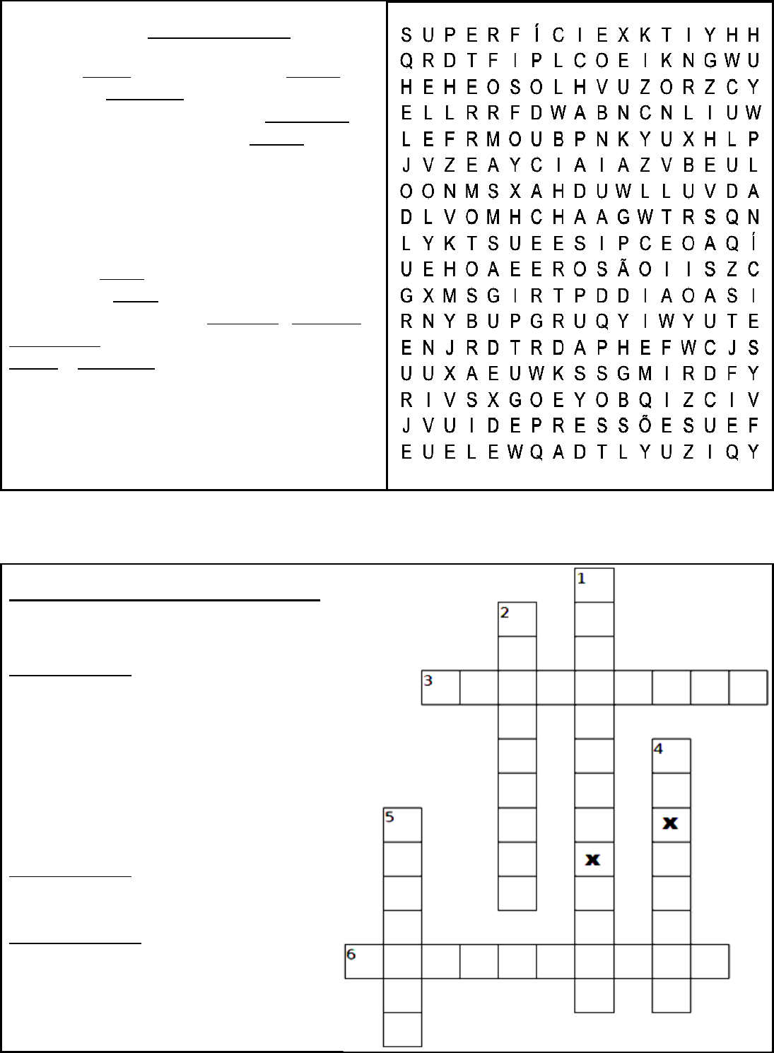 <p>Relevo brasileiro</p><p>O relevo é o conjunto de formas que</p><p>modelam a superfície da crosta terrestre. Ele</p><p>pode ser modificado por terremotos e</p><p>movimentos tectônicos, pela erosão causada</p><p>por processos naturais (água da chuva e</p><p>ventos, entre outros fatores) e ainda pela</p><p>interferência humana.</p><p>O relevo também é diretamente afetado</p><p>por outros aspectos ambientais, como o clima,</p><p>os tipos de rocha e solo e a cobertura vegetal.</p><p>No Brasil, ele é constituído</p><p>predominantemente por planaltos, planícies e</p><p>depressões, embora outros conjuntos, como</p><p>serras, chapadas, tabuleiros e patamares,</p><p>também possam ser observados.</p><p>Suporte Geográfico</p><p>CRUZADINHA – RELEVO BRASILEIRO</p><p>1 - Essa classificação apresentou 28</p><p>unidades de relevo: Classificação de</p><p>_____________</p><p>2 - São as áreas mais baixas e planas do</p><p>relevo onde predominam os processos de</p><p>sedimentação.</p><p>3 - São áreas relativamente elevadas</p><p>onde os processos erosivos predominam</p><p>e as superfícies são irregulares.</p><p>4 - Essa classificação apresentou 10</p><p>unidades de relevo: Classificação de</p><p>_____________</p><p>5 - Essa classificação apresentou 8</p><p>unidades de relevo: Classificação de</p><p>______________</p><p>6 - São áreas de relevo levemente</p><p>aplainado e rebaixado em relação às</p><p>áreas do entorno.</p><p>Suporte Geográfico</p>