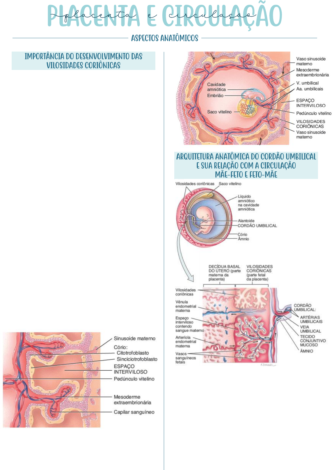 <p>Até o final da segunda semana de</p><p>desenvolvimento, as vilosidades coriônicas</p><p>começam a se desenvolver. Estas projeções</p><p>semelhantes a dedos consistem em cório</p><p>(trofoblasto circundado por citotrofoblasto)</p><p>que se projeta para dentro da parede do</p><p>endométrio do útero. No final da terceira se-</p><p>mana, os capilares sanguíneos se desenvol-</p><p>vem em vilosidades coriônicas (Tortora, 2016).</p><p>Os vasos sanguíneos das vilosidades</p><p>coriônicas se conectam ao coração embri-</p><p>onário por meio das artérias umbilicais e</p><p>veia umbilical ao longo do pedúnculo vite-</p><p>lino, que por fim acabará se tornando o cor-</p><p>dão umbilical. Os capilares sanguíneos fe-</p><p>tais nas vilosidades coriônicas se projetam</p><p>às lacunas, que se unem para formar os es-</p><p>paços intervilosos que banham as vilosida-</p><p>des coriônicas com sangue materno. Como</p><p>resultado, o sangue materno banha os vasos</p><p>sanguíneos fetais recobertos por cório.</p><p>Os vasos sanguíneos maternos e fetais</p><p>não se unem, e que o sangue que eles trans-</p><p>portam normalmente não se mistura. Em vez</p><p>disso, o oxigênio e os nutrientes do sangue</p><p>dos espaços intervilosos da gestante, os es-</p><p>paços entre as vilosidades coriônicas, se di-</p><p>fundem através das membranas celulares</p><p>para os capilares das vilosidades. Produtos</p><p>residuais, como o dióxido de carbono, se di-</p><p>fundem no sentido oposto (Tortora, 2016).</p><p>A real ligação entre a placenta e o</p><p>embrião, e mais tarde o feto, se dá por meio</p><p>do cordão umbilical, que se desenvolve a</p><p>partir do pedúnculo vitelino e geralmente</p><p>mede aproximadamente 2 cm de largura e</p><p>cerca de 50 a 60 cm de comprimento.</p><p>É constituído por duas artérias umbili-</p><p>cais que transportam o sangue fetal desoxi-</p><p>genado para a placenta, uma veia umbilical</p><p>que transporta oxigênio e nutrientes adqui-</p><p>ridos dos espaços intervilosos da mãe para</p><p>o feto, e apoiam o tecido conjuntivo mucoso</p><p>chamado geleia de Wharton, derivado do</p><p>alantoide. Uma camada de âmnio circunda</p><p>todo o cordão umbilical e lhe confere uma</p><p>aparência brilhante (Tortora, 2016).</p><p>Depois do parto, a placenta se se-</p><p>para do útero e o cordão umbilical é clam-</p><p>peado e, em seguida, seccionado. A pe-</p><p>quena porção (aproximadamente 2,5 cm)</p><p>do cordão que permanece ligado ao re-</p><p>cém-nascido começa a murchar e, em geral,</p><p>cai dentro de 12 a 15 dias após o nasci-</p><p>mento. A área na qual o cordão estava li-</p><p>gado se torna coberta por uma fina ca-</p><p>mada de pele, e forma-se tecido cicatricial.</p><p>A cicatriz é o umbigo (Tortora, 2016).</p><p>A Restrição de Crescimento Fetal</p><p>(RCF) é definida como uma incapacidade</p><p>do feto em alcançar seu potencial de cres-</p><p>cimento. Uma série de condições como ano-</p><p>malias congênitas, infecções ou uso inde-</p><p>vido de drogas e substâncias podem cau-</p><p>sar RCF, mas a principal causa se deve à</p><p>insuficiência placentária (Antonelli, 2018).</p><p>A RCF pode resultar de anormalida-</p><p>des fetais, maternas ou placentárias, em-</p><p>bora, em muitos casos, a causa específica</p><p>seja desconhecida (Robbins, 2013).</p><p>É uma importante causa de morbili-</p><p>dade e mortalidade perinatal, de sequelas</p><p>a longo-prazo (alterações cognitivas e neu-</p><p>rológicas) e ainda doenças crónicas do</p><p>adulto (diabetes mellitus tipo 2 e doenças</p><p>cardiovasculares) (Ornelas, 2018).</p><p>As causas placentárias incluem qual-</p><p>quer fator que comprometa a linha de supri-</p><p>mento uteroplacentária, podendo resultar</p><p>de placenta prévia (implantação baixa da</p><p>placenta), descolamento da placenta (se-</p><p>paração da placenta da decídua por co-</p><p>águlo retro placentário) ou infarto da pla-</p><p>centa. Com as causas placentárias (e ma-</p><p>ternas) de restrição do crescimento, o atraso</p><p>do crescimento é assimétrico (isto é, o cére-</p><p>bro é poupado em relação aos órgãos vis-</p><p>cerais como o fígado) (Robbins, 2013).</p><p>Uma proporção importante dos casos</p><p>é causada pela insuficiência placentária,</p><p>caracterizada por incompatibilidade entre</p><p>o suprimento placentário e as exigências nu-</p><p>tritivas e/ou metabólicas fetais; esta desar-</p><p>monia resulta no crescimento fetal compro-</p><p>metido e no risco aumentado de morbi-mor-</p><p>talidade fetal (hipóxia e acidose fetal). Por</p><p>convenção, os fetos com disfunção placen-</p><p>tária documentada são definidos como os</p><p>«verdadeiros» fetos com RCF, sendo os res-</p><p>tantes definidos como leves para a idade</p><p>gestacional (LIG), sem evidência de atingi-</p><p>mento placentário (Ornelas, 2018).</p><p>Como a placenta não é uma barreira</p><p>absoluta entre as circulações materna e fe-</p><p>tal, qualquer droga ou substância química</p><p>que seja perigosa para uma criança deve</p><p>ser considerada potencialmente perigosa</p><p>para o feto quando administrada à mãe.</p><p>O álcool etílico é, sem dúvida, o prin-</p><p>cipal teratógeno fetal. A exposição intrau-</p><p>terina a até mesmo uma pequena quanti-</p><p>dade de álcool etílico pode resultar na sín-</p><p>drome alcoólica fetal (SAF), uma das causas</p><p>mais comuns de atraso intelectual e a causa</p><p>evitável mais comum de defeitos congênitos.</p><p>Os sinais/sintomas da SAF podem in-</p><p>cluir crescimento lento antes e após o nasci-</p><p>mento, traços faciais característicos (fissuras</p><p>palpebrais curtas, lábio superior fino e ponte</p><p>nasal afundada), coração e outros órgãos</p><p>defeituosos, membros malformados, anormali-</p><p>dades genitais e danos à parte central do</p><p>sistema nervoso. Problemas comportamentais,</p><p>com