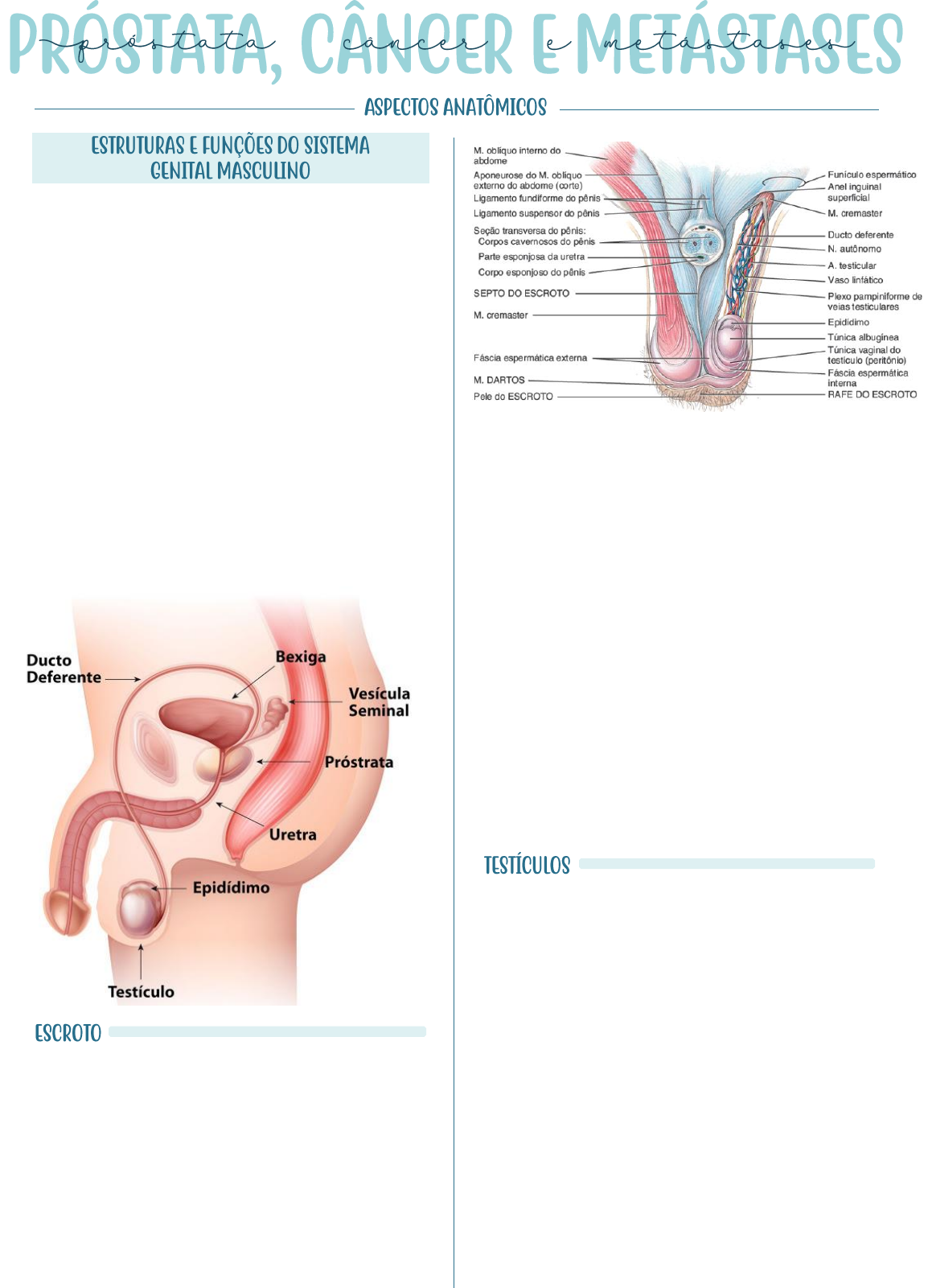 <p>Os órgãos do sistema genital mascu-</p><p>lino incluem os testículos, um sistema de duc-</p><p>tos (epidídimo, ducto deferente, ductos eja-</p><p>culatórios e uretra), glândulas sexuais aces-</p><p>sórias (glândulas seminais, próstata e glân-</p><p>dulas bulbouretrais) e várias estruturas de</p><p>apoio, incluindo o escroto e o pênis.</p><p>Os testículos (gônadas masculinas)</p><p>produzem espermatozoides e secretam hor-</p><p>mônios. O sistema de ductos transporta e ar-</p><p>mazena os espermatozoides, auxilia em sua</p><p>maturação, e liberaos para o meio externo.</p><p>O sêmen contém espermatozoides mais as se-</p><p>creções produzidas pelas glândulas sexuais</p><p>acessórias. As estruturas de apoio têm várias</p><p>funções. O pênis entrega os espermatozoides</p><p>no aparelho reprodutivo feminino e o escroto</p><p>contém os testículos.</p><p>É a estrutura que contém os testículos,</p><p>consiste em pele solta e tela subcutânea sub-</p><p>jacente. Está pendurado na raiz (parte</p><p>anexa) do pênis. Externamente, parece uma</p><p>bolsa de pele ímpar separada em porções</p><p>laterais por uma crista mediana chamada de</p><p>rafe do escroto. Internamente, o septo do es-</p><p>croto divide o escroto em dois sacos, cada</p><p>um contendo um testículo.</p><p>O septo do escroto é constituído por</p><p>uma tela subcutânea e tecido muscular cha-</p><p>mado músculo dartos, que é composto de fei-</p><p>xes de fibras de músculo liso. O músculo dar-</p><p>tos também é encontrado na tela subcutâ-</p><p>nea do escroto.</p><p>Associado a cada testículo no escroto</p><p>está o músculo cremaster, várias pequenas</p><p>bandas de músculo esquelético que descem</p><p>como uma extensão do músculo oblíquo in-</p><p>terno do abdome por meio do funículo es-</p><p>permático para circundar os testículos. A lo-</p><p>calização do escroto e a contração de suas</p><p>fibras musculares regulam a temperatura dos</p><p>testículos. A contração dos músculos cremas-</p><p>ter move os testículos para mais perto do</p><p>corpo, podendo absorver o calor do corpo.</p><p>A contração do músculo dartos reduz o vo-</p><p>lume do escroto (de aspecto enrugado.</p><p>São um par de glândulas ovais no es-</p><p>croto com aproximadamente 5 cm de com-</p><p>primento e 2,5 cm de diâmetro. Cada testí-</p><p>culo tem massa de 10 a 15 g. Se desenvol-</p><p>vem perto dos rins, na parte posterior do ab-</p><p>dome, e geralmente começam sua descida</p><p>para o escroto por meio dos canais inguinais</p><p>(passagem na parede anteroinferior do ab-</p><p>dome) durante a segunda metade do sétimo</p><p>mês do desenvolvimento fetal.</p><p>Uma túnica serosa recobre parcial-</p><p>mente os testículos. Líquido seroso na túnica</p><p>vaginal do testículo - hidrocele. Internamente</p><p>à túnica vaginal do testículo, o testículo é</p><p>pela túnica albugínea que se estende inter-</p><p>namente formando septos que dividem o tes-</p><p>tículo em uma série de compartimentos inter-</p><p>nos chamados lóbulos dos testículos.</p><p>Cada um dos 200 a 300 lóbulos dos</p><p>testículos contêm os túbulos seminíferos con-</p><p>torcidos, onde os espermatozoides são pro-</p><p>duzidos. Os túbulos seminíferos contêm as cé-</p><p>lulas espermatogênicas, as células formado-</p><p>ras de esperma, e as células sustentaculares</p><p>ou células de Sertoli, que têm várias funções</p><p>no apoio à espermatogênese. Depois que um</p><p>espermatozoide é formado, ele é liberado</p><p>para o lúmen do túbulo seminífero.</p><p>Internamente a membrana basal e es-</p><p>permatogônias, junções oclusivas unem célu-</p><p>las sustentaculares vizinhas. Estas junções for-</p><p>mam uma barreira hematotesticular, porque</p><p>as substâncias devem passar primeiro pelas</p><p>células sustentaculares antes de poderem al-</p><p>cançar o espermatozoide em desenvolvi-</p><p>mento. As células de Sertoli apoiam e prote-</p><p>gem as células espermatogênicas, elas nu-</p><p>trem os espermatócitos, espermátides e es-</p><p>permatozoides, fagocitam o excesso de cito-</p><p>plasma das espermátides e controlam os mo-</p><p>vimentos das células espermatogênicas e a</p><p>liberação do espermatozoide no lúmen dos</p><p>túbulos seminíferos.</p><p>Também produzem líquido para o</p><p>transporte do espermatozoide, secretam o</p><p>hormônio inibina e regulam os efeitos da tes-</p><p>tosterona e do FSH. Nos espaços entre túbu-</p><p>los seminíferos adjacentes existem aglomera-</p><p>dos de células chamadas células de Leydig</p><p>que secretam testosterona.</p><p>O epidídimo é um órgão em forma de</p><p>vírgula de aproximadamente 4 cm de com-</p><p>primento que fica ao longo da margem pos-</p><p>terior de cada testículo.</p><p>Cada epidídimo consiste principal-</p><p>mente em ductos do epidídimo bem enrola-</p><p>dos. Os ductos eferentes do testículo se unem</p><p>aos ductos do epidídimo na parte maior e</p><p>superior do epidídimo, chamada de cabeça</p><p>do epidídimo. O corpo do epidídimo é a</p><p>parte média estreita, e a cauda do epidí-</p><p>dimo é a parte inferior menor. Na sua extremi-</p><p>dade distal, a cauda do epidídimo continua</p><p>como o ducto deferente.</p><p>Funcionalmente, o epidídimo é o local</p><p>de maturação dos espermatozoides, (esper-</p><p>matozoide adquire motilidade e a capaci-</p><p>dade de fertilizar um óvulo).</p><p>O epidídimo também ajuda a impulsi-</p><p>onar os espermatozoides pelos ductos defe-</p><p>rentes durante a excitação sexual, pela con-</p><p>tração peristáltica do seu músculo liso. Arma-</p><p>zena espermatozoides, que ficam viáveis por</p><p>vários meses.</p><p>Qualquer espermatozoide armaze-</p><p>nado que não seja ejaculado durante esse</p><p>período de tempo é, reabsorvido.</p><p>A pressão produzida pelo líquido que</p><p>é secretado pelas células sustentaculares</p>