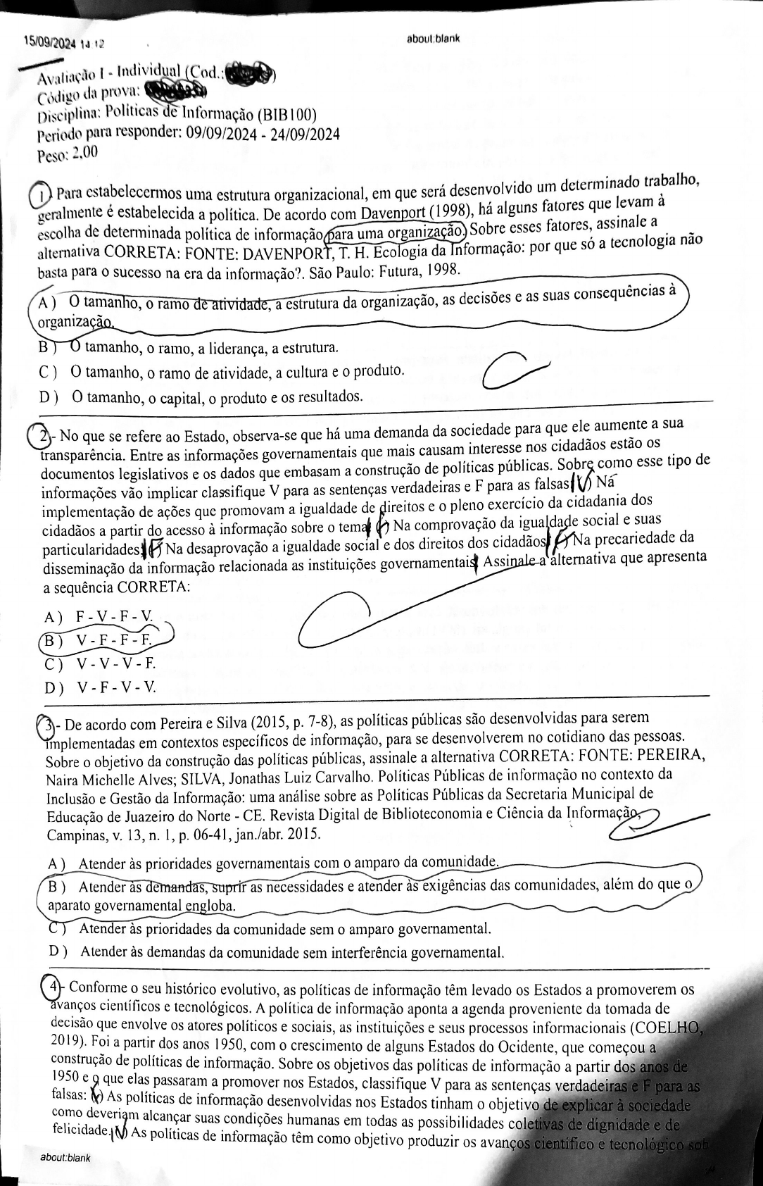<p>15/09/2024 about:blank Avaliação Individual (Cod.: Código da prova: Disciplina: Politicas de Informação Periodo para responder: 09/09/2024 24/09/2024 Peso: 2,00 Para estabelecermos uma estrutura organizacional, em que será desenvolvido um determinado trabalho, geralmente é estabelecida a política. De acordo com Davenport (1998), há alguns fatores que levam à escolha de determinada política de informação para uma organização. Sobre esses fatores, assinale a alternativa CORRETA: FONTE: DAVENPORT, T. H. Ecologia da Informação: por que só a tecnologia não basta para o sucesso na era da São Paulo: Futura, 1998. A) tamanho, o ramo de atividade, a estrutura da organização, as decisões e as suas consequências à organização 0 tamanho, o ramo, a liderança, a estrutura. C) tamanho, o ramo de atividade, a cultura e produto. D) tamanho, o capital, o produto e os resultados. 2 No que se refere ao Estado, observa-se que há uma demanda da sociedade para que ele aumente a sua Entre as informações governamentais que mais causam interesse nos cidadãos estão os documentos legislativos e os dados que embasam a construção de políticas públicas. Sobre como esse tipo de informações vão implicar classifique V para as sentenças verdadeiras e F para as Na implementação de ações que promovam a igualdade de direitos e o pleno exercício da cidadania dos cidadãos a partir do acesso à informação sobre o tema Na comprovação da igualdade social e suas particularidades Na desaprovação a igualdade social e dos direitos dos cidadãos Na precariedade da disseminação da informação relacionada as instituições governamentais Assinale a alternativa que apresenta a sequência CORRETA: A) D) V-F-V-V 3 De acordo com Pereira e Silva (2015, p. 7-8), as políticas públicas são desenvolvidas para serem implementadas em contextos específicos de informação, para se desenvolverem no cotidiano das pessoas. Sobre o objetivo da construção das políticas públicas, assinale a alternativa CORRETA: FONTE: PEREIRA, Naira Michelle Alves; SILVA, Jonathas Luiz Carvalho. Políticas Públicas de informação no contexto da Inclusão e Gestão da Informação: uma análise sobre as Políticas Públicas da Secretaria Municipal de Educação de Juazeiro do Norte CE. Revista Digital de Biblioteconomia e Ciência da Informação Campinas, V. 13, n. 1, p. 06-41, jan./abr. 2015. A) Atender às prioridades governamentais com o amparo da comunidade B) Atender às demandas, suprir as necessidades e atender exigências das comunidades, além do que o aparato governamental C) Atender às prioridades da comunidade sem amparo governamental. D) Atender às demandas da comunidade sem interferência governamental. 4 Conforme o seu histórico evolutivo, as políticas de informação têm levado os Estados a promoverem os avanços científicos e tecnológicos. A política de informação aponta a agenda proveniente da tomada de decisão que envolve os atores políticos e sociais, as instituições e seus processos informacionais Foi a partir dos anos 1950, com o crescimento de alguns Estados do Ocidente, que começou a construção de políticas de informação. Sobre os objetivos das políticas de informação a partir dos anos de 1950 e 9 que elas passaram a promover nos Estados, classifique V para as sentenças verdadeiras e F para as falsas: As políticas de informação desenvolvidas nos Estados tinham o objetivo de explicar à sociedade como felicidade deveriam alcançar suas condições humanas em todas as possibilidades coletivas de dignidade e de IV As políticas de informação têm como objetivo produzir os avanços cientifico e tecnológico sob about:blank</p><p>about:blank dos Estados. Estes passaram a promover a importância da ciência e da tecnologia (C & T) como ementos de modernização da estrutura produtiva. início do uso do conceito de políticas de informação começou na área governamental como uma política de Estado e o termo foi criado no pós II Guerra Mundial implemento para as áreas de ciência e tecnologia militar. As políticas de informação são um fenômeno humano resultante das interações sociais, com objetivo de fomentar os processos organizacionais, direcionando essas informações à sociedade, com o interesse que 'tudo' circule nos diferentes setores. Assinale a alternativa que apresenta a sequência CORRETA: FONTE: COELHO, T. R. Making sense to decreasing citizene participation through a social representation lens. 2016. Disponível em: em: 3 abr. 2019. A) 5 As organizações (bibliotecas, unidades de informação, empresas, instituições, universidades etc.) diariamente são influenciadas pela informação e a cada momento a informação está sob ação do poder, da política e da economia. Observando os tipos de políticas de informação, acerca dos critérios estabelecidos pelas organizações para a escolha de determinada política em sua instituição, analise as sentenças a seguir: I- tamanho, ramo de atividade, a estrutura da organização. II- Quem faz as escolhas da organização e suas consequências. III- O tamanho, o ramo, a filosofia e a missão da empresa. IV- Quem faz as escolhas da organização e quem realiza a admissão e demissão de funcionários. Assinale a alternativa CORRETA: A) Somente a sentença I está correta. Somente a sentença IV está correta. C Somente a sentença II está correta. D) As sentenças I e II estão corretas. 6 Para estabelecermos uma estrutura organizacional, em que será desenvolvido um determinado trabalho, geralmente é estabelecida a política. De acordo com Davenport (1998), há alguns fatores que levam à escolha de determinada política de informação para uma organização. Sobre esses fatores, classifique V para as sentenças verdadeiras e F para as falsas: tamanho, o ramo de atividade e a estrutura da organização. ( tamanho, o ramo, a liderança, a estrutura. tamanho, o ramo de atividade, a 