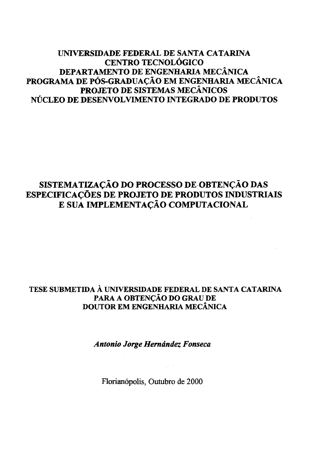 <p>UNIVERSIDADE FEDERAL DE SANTA CATARINA</p><p>CENTRO TECNOLÓGICO</p><p>DEPARTAMENTO DE ENGENHARIA MECÂNICA</p><p>PROGRAMA DE PÓS-GRADUAÇÃO EM ENGENHARIA MECÂNICA</p><p>PROJETO DE SISTEMAS MECÂNICOS</p><p>NÚCLEO DE DESENVOLVIMENTO INTEGRADO DE PRODUTOS</p><p>SISTEMATIZAÇÃO DO PROCESSO DE OBTENÇÃO DAS</p><p>ESPECIFICAÇÕES DE PROJETO DE PRODUTOS INDUSTRIAIS</p><p>E SUA IMPLEMENTAÇÃO COMPUTACIONAL</p><p>TESE SUBMETIDA À UNIVERSIDADE FEDERAL DE SANTA CATARINA</p><p>PARA A OBTENÇÃO DO GRAU DE</p><p>DOUTOR EM ENGENHARIA MECÂNICA</p><p>Antonio Jorge Hernândez Fonseca</p><p>Florianópolis, Outubro de 2000</p><p>BIOGRAFIA DO AUTOR</p><p>ANTONIO JORGE HERNÁNDEZ FONSECA. MANZANILLO. CUBA. 1943.</p><p>É Engenheiro Mecânico formado em 1970 pela “Universidad de la Haband\ Cuba, onde foi</p><p>professor e vice-diretor docente da “Escuela de Ingenieria Mecânica” no período 1971 à 1975.</p><p>Entre 1976 e 1980 foi vice-diretor técnico da “Empresa de Diseho Mecânico ”, EDIMEC da</p><p>Havana, que projeta máquinas e equipamentos para a indústria e a agricultura açucareira, sendo de</p><p>1980 à 1986, Diretor Geral da mesma. No período de 1976 à 1986 trabalhou na Suécia, França,</p><p>Alemanha, Nicarágua e Rússia, em vários desenvolvimentos de máquinas de interesse, para a</p><p>indústria açucareira de Cuba. No período 1988 á 1992 foi chefe do Departamento de</p><p>Desenvolvimento de Máquinas da “Oficina Nacional de Diseho Industrial”, ONDI, e professor do</p><p>“Instituto Superior de Diseno Industrial", ISDI, de Havana, Cuba. Em 1992 foi convidado para</p><p>trabalhar no Brasil como chefe da Célula de Engenharia do Laboratório Brasileiro de Desenho</p><p>Industrial, LBDI em Florianópolis. Em 1996 defendeu sua Dissertação de Mestrado em Engenharia</p><p>Mecânica, na Universidade Federal de Santa Catarina, UFSC e em Novembro de 1997 realizou o</p><p>exame de qualificação para o doutorado, na própria UFSC. Desde 1999 é professor do Centro de</p><p>Ciências Naturais e Tecnologia, CCNT, da Universidade do Estado do Pará, UEPA, e do</p><p>Departamento de Engenharia Mecânica da Universidade Federal do Pará, UFPa. É Coordenador</p><p>Executivo do Programa Paraense de Design, PPD e consultor da Federação das lndústrias do Estado</p><p>do Pará, FIEPA. Tem sido professor visitante em Universidades de Méxicò; Argentina, Uruguai,</p><p>Cuba e Brasil. Tem um livro publicado sobre Engenharia para Desenhistas Industriais, outro sobre a</p><p>indústria cerâmica vermelha e outros dois sobre a problemática política cubana'</p><p>SISTEMATIZAÇÃO DO PROCESSO DE OBTENÇÃO DAS</p><p>ESPECIFICAÇÕES DE PROJETO DE PRODUTOS INDUSTRIAIS E SUA</p><p>IMPLEMENTAÇÃO COMPUTACIONAL</p><p>Antonio Jorge Hernández Fonseca</p><p>ESTA TESE FOI JULGADA PARA A OBTENÇÃO DO TÍTULO DE</p><p>DOUTOR EM ENGENHARIA</p><p>ESPECIALIDADE ENGENHARIA MECÂNICA E APROVADA EM SUA</p><p>FORMA FINAL PELO PROGRAMA DE PÓS-GRADUAÇÃO EM</p><p>ENGENHARIA MECi</p><p>Prof. NI SACK, Ph. D.</p><p>ORIENTADOR</p><p>SACK, Ph.</p><p>m</p><p>Prof. FERN D FORCELLINI, Dr. Eng.</p><p>wivllÍNT ADOR</p><p>Prof.</p><p>COORDENADOR DO CURSO DE PÓS-GRADUAÇÃO</p><p>Prof. FERNANI ;. PRESIDENTE</p><p>Prof. GELBER^Õ DIAS da CUNHA, Dr. Eng.</p><p>A mi padre y herxnano...en tierra Cubana.</p><p>Temos um certo direito de pensar conceitos que</p><p>matéria experimental sensível n6o pode nos dar...</p><p>Albert Einstein</p><p>vi</p><p>Agradecimentos</p><p>Ao Prof. Nelson Back pelo apoio de todo tipo; pelo tempo dedicado, pela orientação,</p><p>conhecimentos,... paciência,...compreensão e amizade.</p><p>Aos Professores Fernando Antonio Forcellini e André Ogliari, pelas críticas diretas,</p><p>detalhadas e profiindas durante o trabalho e pelo tempo dedicado.</p><p>À minha família: Alina, Cláudia, Dayu, Laura, Tesy, Pedro, Jorge e Stefany, no</p><p>Brasil; à Elvira, Josefina, Chino, Carlos, Judith, em Cuba; Antonio e Santiago, no</p><p>meu coração.</p><p>Ao Prof. Juscelino Farias Marimbondo, pelas horas de discussão, pela força,</p><p>companheirismo, confiança e amizade.</p><p>Ao Prof. Antônio Erlindo Braga Jr., pelas ricas discussões sobre o tema, o apoio</p><p>pessoal direto, a confiança e a revisão detalhada do material.</p><p>Ao engenheiro e amigo Leonardo M. B. Lima e ao bolsista Leonardo Paulino, sem</p><p>cujos apoios o sistema computacional não teria saído do papel.</p><p>> *</p><p>A sociedade brasileira pelo apoio técnico e moral; ao CNPq pelo apoio financeiro.</p><p>À UEPA, à UFPA, ao Programa Paraense de Design e aos companheiros e amigos</p><p>de Belém e do Estado do Pará, pelo apoio e tolerância.</p><p>ÍNDICE</p><p>ÍNDICE DE FIGURAS................................................. .......................................................xiii</p><p>ÍNDICE DE QUADROS........ ............................................................................................. xvi</p><p>RESUMO.......... ........................................................................................................... ...... xvii</p><p>ABSTRACT................................................... .................................................................... xviii</p><p>CAPÍTULO I ................. ..................... ................................. .......................... ................01</p><p>INTRODUÇÃO.</p><p>1.1- Generalidades sobre o projeto de produtos industriais. 01</p><p>1.2.- Breve resumo histórico sobre o processo de projeto de produtos industriais. 03</p><p>1.3. - Temática específica a ser abordada nesta pesquisa. 05</p><p>1.4.- Análise da problemática do tema proposto. 05</p><p>1.5.-Objetivos do trabalho. 07</p><p>1.6.- Justificativas da proposta. 08</p><p>1.7.- Estrutura do presente documento. 09</p><p>CAPÍTULOn........................................................................................................... -11</p><p>ESTADO 