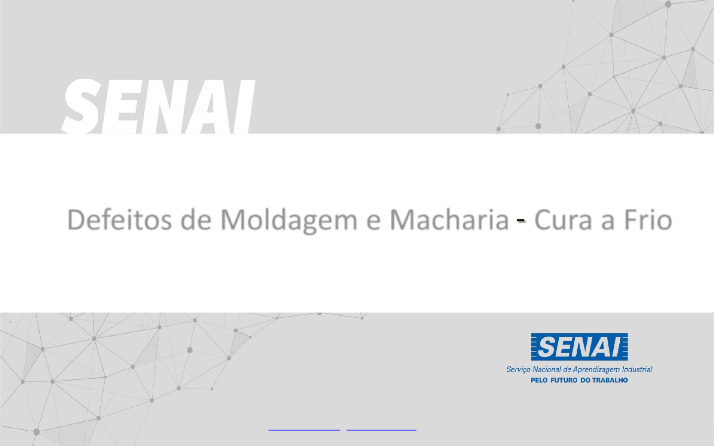 <p>Defeitos de Moldagem e Macharia - Cura a Frio</p><p>Jove Silvério Alves Pinto | Analista de Tecnologia</p><p>SENAI Itaúna CETEF Marcelino Corradi</p><p>SENAI - Serviço Nacional de Aprendizagem Industrial</p><p>Sistema FIEMG</p><p>Tel.: (37) 3249-2448</p><p>jove@fiemg.com.br l www.fiemg.com.br</p><p>mailto:jove@fiemg.com.br</p><p>https://outlook.office365.com/owa/fiemg.com.br/redir.aspx?C=GocNZZAn_0GiCvd19qfB-lFsGfPHa9AIe2IN6QVKWe_M2eAxVdAcCF7rS7HLZrGlE_s7M2tDkOk.&URL=https%3a%2f%2fmailserver.fiemg.com.br%2fexchweb%2fbin%2fredir.asp%3fURL%3dhttp%3a%2f%2fwww.fiemg.com.br%2f</p><p>Introdução</p><p>Síntese das capacidades desenvolvidas:</p><p>• Entender o processo de moldagem em areia aglomerada com</p><p>argila para produção de fundidos.</p><p>• Conhecer os controles e ensaios em aplicáveis a processo de</p><p>moldação com areias aglomeradas com argila.</p><p>Objetivos:</p><p>Aprimorar as capacidades técnicas dos participantes no processo</p><p>de fundição relacionado às técnicas e tecnologia de defeitos em</p><p>moldagem e macharia pelo processo cura frio.</p><p>Introdução</p><p>Apresentação:</p><p>• Nome;</p><p>• Cidade atual;</p><p>• Empresa, tipo de produto, processo de fabricação;</p><p>• Função atual na empresa;</p><p>• Experiência profissional em fundição, tempo;</p><p>• Formação Acadêmica;</p><p>Processos e Produtos</p><p>• Existe um grande número de processos e de produtos disponíveis no</p><p>mercado.</p><p>• Dispensam aquecimento (cura a frio) e tempos variados de cura.</p><p>• As resinas polimerizam a temperatura ambiente, ou em presença de um</p><p>catalisador.</p><p>• Moldes de elevada resistência e de alta colapsibilidade, sem a</p><p>necessidade de alto grau de compactação.</p><p>• Apesar da evolução são produtos poluentes e muitas vezes tóxicos.</p><p>Características Gerais do Processo</p><p>Fonte: IMF</p><p>Características Gerais do Processo</p><p>Cura a Frio / No Bake</p><p>Tipos de Cura</p><p>Caixa Fria / Cold Box</p><p>Caixa Quente / Hot Box</p><p>Resina líquida e catalisador líquido</p><p>com a cura à temperatura ambiente</p><p>Resina líquida e catalisador em gás ou</p><p>aerossol com a cura à temperatura ambiente</p><p>Resina líquida e catalisador com a cura</p><p>por aquecimento</p><p>Características Gerais do Processo</p><p>Desempenho</p><p>(Ensaios e Análises, Defeitos)</p><p>Composição Química</p><p>(Constituintes da Areia Resina)</p><p>Estrutura da Areia</p><p>(Propriedades de Utilização)</p><p>Processamento</p><p>(Preparação, Recuperação e Regeneração)</p><p>Tetraedro de Engenharia dos Materiais:</p><p>Constituintes da Areia</p><p>Areia</p><p>base</p><p>•</p><p>•</p><p>•</p><p>•</p><p>•</p><p>argila</p><p>resina</p><p>cimento</p><p>silicato de sódio</p><p>óleo</p><p>aglomerante</p><p>Agente de cura</p><p>•</p><p>•</p><p>•</p><p>•</p><p>•</p><p>sílica</p><p>cromita</p><p>zirconita</p><p>olivina</p><p>chamote</p><p>• água</p><p>• ácidos/bases</p><p>• C0 2</p><p>• amina</p><p>Areia Resina</p><p>Cura a Frio</p><p>Constituintes da Areia</p><p>• cerabeas</p><p>• castball</p><p>• Material: granular</p><p>• Forma: arredondada</p><p>angular</p><p>subangular</p><p>• Estrutura: compacta</p><p>fissurada</p><p>aglomerada</p><p>• Refratariedade</p><p>• Módulo AFS</p><p>• Distribuição granulométrica</p><p>Constituintes da Areia</p><p>Areia Sílica Base (Si O2)</p><p>Estrutura dos Grãos</p><p>Constituintes da Areia</p><p>Cavidades</p><p>Trincas</p><p>fissuras</p><p>Forma dos Grãos</p><p>Constituintes da Areia</p><p>Angulares Arredondados Subangular</p><p>Composições químicas</p><p>Constituintes da Areia</p><p>As características físicas e químicas:</p><p>Constituintes da Areia</p><p>Areia Cromita</p><p>Constituintes da Areia</p><p>Menor dilatação, maior condução térmica</p><p>(material resfriador), menor reação</p><p>com metal líquido (básico em altas temperaturas),</p><p>boa refratariedade, mais</p><p>pesada, custo elevado.</p><p>Recomendada para aços não ligados, peças em</p><p>aço ao Cr, NiCr e austeníticos com 12-16% Mn</p><p>Areia Base Cromita</p><p>(FeOCr2O3)</p><p>Britagem minério</p><p>de cromo - África</p><p>Cura a Frio / No Bake</p><p>Tipos de Cura</p><p>Caixa Fria / Cold Box</p><p>Fenólico alcalino, Fenólico ácido, Furânico</p><p>Furânico fenólico, Fenólico uretânico.,</p><p>Fenólico uretânico/amina (TEA), Silicato de</p><p>sódio/CO2, Fenólico alcalino/éster</p><p>Caixa Quente / Hot Box Fenólico – furânico e Shell molding</p><p>Constituintes do Aglomerante e Catalisador</p><p>Índice de Regeneração</p><p>Resina Índice Aplicação</p><p>Fenólica Uretânica</p><p>– (Cold Box) 95% Peças Seriadas</p><p>– (Catalizador) 90% Peças não seriadas</p><p>Pequenas series</p><p>Fenólica Cura éster 70% Peças não seriadas</p><p>Fenólica Alcalina 60% Baixo custo</p><p>Ligas: Fe,Aço,Cu,Al</p><p>Furânica 85% - 90% Peças maior porte</p><p>Características Gerais do Processo</p><p>Fonte: MSP</p><p>Resinas e Aglomerantes</p><p>A areia é aglomerada com ligantes</p><p>químicos resina.</p><p>A reação química entre as partes I</p><p>e II, forma a ligação uretânica.</p><p>Compatível com a resina fenólica</p><p>uretânica, curada com catalisador.</p><p>Fonte: SENAI CETEF</p><p>Princípios e Mecanismos de Cura</p><p>Cura da Areia</p><p>• Endurecimento da resina ocorre</p><p>por meio da polimerização,</p><p>• É a combinação de várias</p><p>moléculas formando longas</p><p>cadeias moleculares (polímeros).</p><p>• A cura é acelerada por reação</p><p>química mediante a presença de</p><p>um catalisador.</p><p>• Exemplo: resina fenólica uretânica</p><p>Fonte: SENAI Itaúna CETEF</p><p>Princípios e Mecanismos de Cura</p><p>Propriedades da areia:</p><p>• Aptidão a moldagem (compactabilidade fluidez e plasticidade);</p><p>• Resistência mecânica:</p><p>• Permeabili