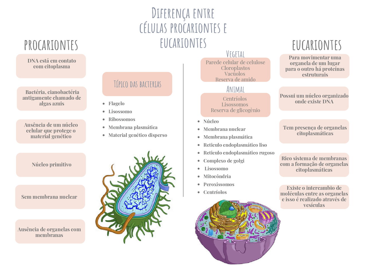 <p>DIFERENCA ENTRE CÉLULAS PROCARIONTES E PROCARIONTES EUCARIONTES EUCARIONTES VEGETAL Para movimentar uma DNA está em contato Parede celular de celulose com citoplasma organela de um lugar Cloroplastos para outro há proteínas Vacúolos estruturais Reserva de amido TÍPICO DAS BACTERIAS cianobactéria ANIMAL antigamente chamado de Centríolos Possui um núcleo organizado algas azuis Flagelo onde existe DNA Lisossomos Lisossomo Reserva de glicogènio Ribossomos Núcleo Ausência de um núcleo Membrana plasmática celular que protege Membrana nuclear Tem presença de organelas material genético Material genético disperso citoplasmáticas Membrana plasmática Reticulo endoplasmático liso Reticulo endoplasmático rugoso Rico sistema de membranas Complexo de golgi Núcleo primitivo com a formação de organelas Lisossomo citoplasmáticas Mitocôndria Peroxissomos Existe intercambio de Centríolos Sem membrana nuclear moléculas entre as organelas e isso é realizado através de vesículas Ausência de organelas com membranas</p>