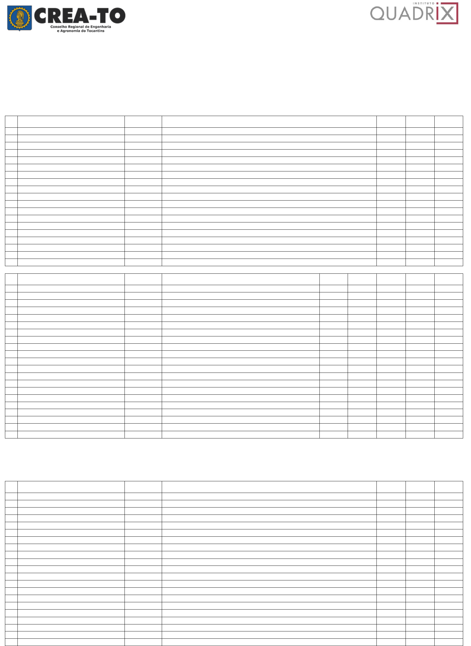 <p>1</p><p>CONSELHO REGIONAL DE ENGENHARIA E AGRONOMIA DO TOCANTINS - CREA-TO</p><p>CONCURSO PÚBLICO PARA PROVIMENTO DE VAGAS E FORMAÇÃO DE CADASTRO RESERVA</p><p>PARA CARGOS DE NÍVEL FUNDAMENTAL, NÍVEL MÉDIO, NÍVEL MÉDIO/TÉCNICO E NÍVEL SUPERIOR</p><p>RESULTADO DEFINITIVO DA PROVA OBJETIVA</p><p>1 DOS CANDIDATOS HABILITADOS NA PROVA OBJETIVA</p><p>1.1 Relação dos candidatos, que se declararam com deficiência (COTA PCD), habilitados na prova objetiva, na seguinte ordem: código/cargo, número de inscrição, nome do candidato, pontos</p><p>em cada área de conhecimento, nota da prova objetiva e ordem de classificação preliminar.</p><p>Cód. Cargo Inscrição Nome</p><p>Conhec.</p><p>Gerais</p><p>Nota Prova</p><p>Objetiva</p><p>Classificação</p><p>Preliminar</p><p>100 Auxiliar Administrativo-Palmas/TO 481.01760725/5 POLIANNE ARAUJOLIMA BARROS 59,50 59,50 1</p><p>100 Auxiliar Administrativo-Palmas/TO 481.01785018/0 ISABELLA JUWER NASCIMENTO 58,50 58,50 2</p><p>100 Auxiliar Administrativo-Palmas/TO 481.01767980/0 LUCIANO PEREIRA DA SILVA 55,00 55,00 3</p><p>100 Auxiliar Administrativo-Palmas/TO 481.01768717/1 ISABELE CRISTINA ALVES CALDAS 55,00 55,00 4</p><p>100 Auxiliar Administrativo-Palmas/TO 481.01775841/6 LACORDAY AIRES FELICIANO 53,50 53,50 5</p><p>100 Auxiliar Administrativo-Palmas/TO 481.01784765/7 EMERSON BARBOSA SILVA 52,00 52,00 6</p><p>100 Auxiliar Administrativo-Palmas/TO 481.01779625/6 VITORIA FERREIRA NUNES 51,00 51,00 7</p><p>100 Auxiliar Administrativo-Palmas/TO 481.01784660/0 VANDERLEI LIMA DA SILVA 46,00 46,00 8</p><p>100 Auxiliar Administrativo-Palmas/TO 481.01762312/0 YANN GUILHERME PEREIRA 46,00 46,00 9</p><p>100 Auxiliar Administrativo-Palmas/TO 481.01785061/3 HIGOR DANIEL PIRES DOS REIS 46,00 46,00 10</p><p>100 Auxiliar Administrativo-Palmas/TO 481.01784898/7 MARCUS AURELIO VELOSO MORENO 43,00 43,00 11</p><p>100 Auxiliar Administrativo-Palmas/TO 481.01754846/9 TULIO DE CASTRO RIBEIRO 43,00 43,00 12</p><p>100 Auxiliar Administrativo-Palmas/TO 481.01763053/8 MARIA DE LURDES PEREIRA LUZ CRUZ 40,50 40,50 13</p><p>100 Auxiliar Administrativo-Palmas/TO 481.01777246/8 CHARLEANE ALVES COSTA 40,00 40,00 14</p><p>100 Auxiliar Administrativo-Palmas/TO 481.01766724/0 JAILSON GOMES SANTANA DA SILVA 40,00 40,00 15</p><p>100 Auxiliar Administrativo-Palmas/TO 481.01775815/5 FERNANDO MONTEIRO RIBEIRO 40,00 40,00 16</p><p>100 Auxiliar Administrativo-Palmas/TO 481.01782675/0 JOAO VICTOR CARDOSO COSTA 40,00 40,00 17</p><p>100 Auxiliar Administrativo-Palmas/TO 481.01777752/0 ADEYANNE PIRES EVANGELISTA 39,00 39,00 18</p><p>100 Auxiliar Administrativo-Palmas/TO 481.01726866/9 NAYANE CAMELO ANDRADE 38,50 38,50 19</p><p>Cód. Cargo Inscrição Nome</p><p>Conhec.</p><p>Básicos</p><p>Conhec.</p><p>Complem.</p><p>Conhec.</p><p>Específicos</p><p>Nota Prova</p><p>Objetiva</p><p>Classificação</p><p>Preliminar</p><p>201 Agente Administrativo-Augustinópolis/TO 481.01754840/0 HUGO DE SA SANTANA 12,00 26,50 23,50 62,00 1</p><p>201 Agente Administrativo-Augustinópolis/TO 481.01762795/0 EVANICE GOMES PEREIRA 15,00 22,00 18,50 55,50 2</p><p>202 Agente Administrativo-Guaraí/TO 481.01778392/8 GERSON DANILLO SOUSA ARANHA 10,50 20,50 24,00 55,00 1</p><p>203 Agente Administrativo-Gurupi/TO 481.01762209/4 DAVID ALEXANDRINO DE QUEIROZ SILVA 13,50 19,00 24,50 57,00 1</p><p>204 Agente Administrativo-Palmas/TO 481.01779632/2 VITORIA FERREIRA NUNES 26,00 26,50 22,00 74,50 1</p><p>204 Agente Administrativo-Palmas/TO 481.01784309/1 LUCIELMA DE MARCEDO NASCIMENTO 20,00 23,50 30,00 73,50 2</p><p>204 Agente Administrativo-Palmas/TO 481.01784279/5 ISABELLA JUWER NASCIMENTO 15,00 28,50 29,50 73,00 3</p><p>204 Agente Administrativo-Palmas/TO 481.01766603/9 MARCIO MAIA DE CARVALHO SILVA 22,50 17,50 32,00 72,00 4</p><p>204 Agente Administrativo-Palmas/TO 481.01783858/1 THIAGO MOREIRA DA COSTA SANTOS 19,50 28,00 23,00 70,50 5</p><p>204 Agente Administrativo-Palmas/TO 481.01754847/5 TULIO DE CASTRO RIBEIRO 16,50 20,50 30,50 67,50 6</p><p>204 Agente Administrativo-Palmas/TO 481.01775797/7 DIANA COELHO DA SILVA 16,50 26,50 24,50 67,50 7</p><p>205 Agente Administrativo-Paraíso do Tocant./TO 481.01768769/1 MARCELO VICTOR RODRIGUES MONICI 16,50 20,50 18,50 55,50 1</p><p>210 Motorista-Palmas/TO 481.01756132/3 AGNALDO PEREIRA NASCIMENTO 15,00 29,50 30,50 75,00 1</p><p>210 Motorista-Palmas/TO 481.01768623/7 DANILO URCINO DE CERQUEIRA 16,00 16,00 29,00 61,00 2</p><p>301 Agente de Fiscalização-Gurupi/TO 481.01759941/0 CLIFFYTON DOUGLAS DA SILVA ROCHA 18,00 22,00 26,00 66,00 1</p><p>301 Agente de Fiscalização-Gurupi/TO 481.01760048/3 DAYLTON BEZERRA BENEVIDES 10,50 16,00 21,50 48,00 2</p><p>303 Agente de Fiscalização-Paraíso do Tocant./TO 481.01768160/7 MARCOS PIOVEZAN 21,00 23,50 23,00 67,50 1</p><p>400 Advogado-Palmas/TO 481.01760386/6 BRUNA SANCHES MARQUES 19,50 26,50 24,50 70,50 1</p><p>400 Advogado-Palmas/TO 481.01781960/3 LAYS NOLETO SILVA 21,00 28,00 17,00 66,00 2</p><p>401 Analista Administrativo-Palmas/TO 481.01775123/6 VANÚBIA LIMA DE PAULO E SILVA 19,50 25,00 23,50 68,00 1</p><p>401 Analista Administrativo-Palmas/TO 481.01778728/6 MARIVALDA DA PAZ OLIVEIRA AQUINO 16,00 16,00 29,00 61,00 2</p><p>1.2 Relação dos candidatos, que se autodeclararam negros (COTA PPP), habilitados na prova objetiva, na seguinte ordem: código/cargo, número de inscrição, nome do candidato, pontos em</p><p>cada área de conhecimento, nota da prova objetiva e ordem de classificação preliminar.</p><p>Serão convocados para a realização do Procedimento de heteroidentificação apenas os candidatos habilitados de acordo com o quantitativo definido Portaria Normativa nº 4/2018. Os candidatos</p><p>não convocados serão remanejados para a lista de ampla concorrência, se obtiverem nota suficiente.</p><p>Cód. Cargo Inscrição Nome</p><p>Conhec.</p><p>Gerais</p><p>Nota Prova</p><p>Objetiva</p><p>Classificação</p><p>Preliminar</p><p>100 Auxiliar Administrativo-Palmas/TO 481.01742207/6 RAIMUNDO RODRIGUES DA SILVA N