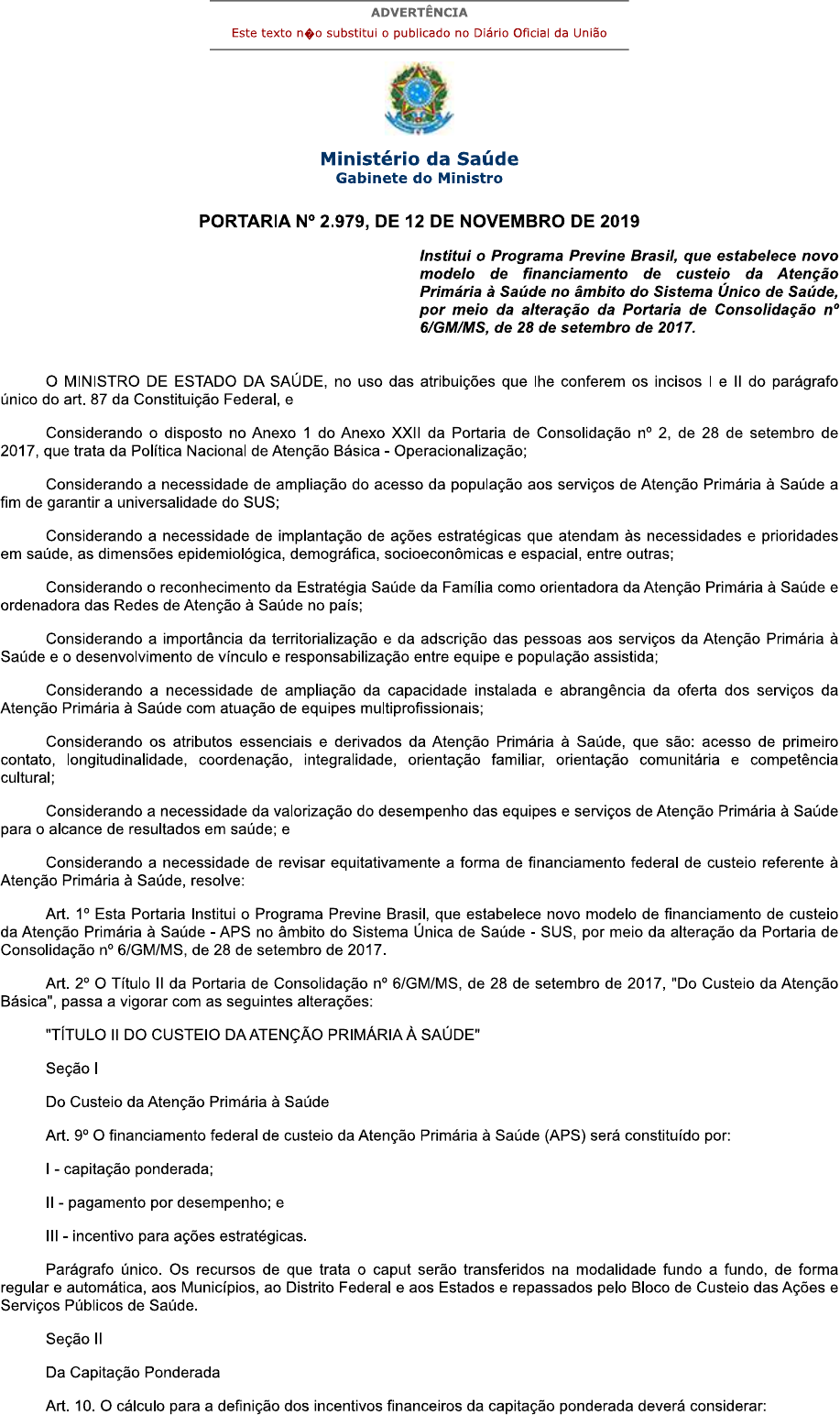 <p>ADVERTÊNCIA Este texto substitui o publicado no Diário Oficial da União Ministério da Saúde Gabinete do Ministro PORTARIA N° 2.979, DE 12 DE NOVEMBRO DE 2019 Institui o Programa Previne Brasil, que estabelece novo modelo de financiamento de custeio da Atenção Primária à Saúde no âmbito do Sistema Único de Saúde, por meio da alteração da Portaria de Consolidação 6/GM/MS, de 28 de setembro de 2017. MINISTRO DE ESTADO DA SAÚDE, no uso das atribuições que lhe conferem os incisos e do parágrafo único do art. 87 da Constituição Federal, e Considerando o disposto no Anexo 1 do Anexo XXII da Portaria de Consolidação n° 2, de 28 de setembro de 2017, que trata da Política Nacional de Atenção Básica - Operacionalização; Considerando a necessidade de ampliação do acesso da população aos serviços de Atenção Primária à Saúde a fim de garantir a universalidade do SUS; Considerando a necessidade de implantação de ações estratégicas que atendam às necessidades e prioridades em saúde, as dimensões epidemiológica, demográfica, socioeconômicas e espacial, entre outras; Considerando o reconhecimento da Estratégia Saúde da Família como orientadora da Atenção Primária à Saúde e ordenadora das Redes de Atenção à Saúde no país; Considerando a importância da territorialização e da adscrição das pessoas aos serviços da Atenção Primária à Saúde e o desenvolvimento de vínculo e responsabilização entre equipe e população assistida; Considerando a necessidade de ampliação da capacidade instalada e abrangência da oferta dos serviços da Atenção Primária à Saúde com atuação de equipes multiprofissionais; Considerando os atributos essenciais e derivados da Atenção Primária à Saúde, que são: acesso de primeiro contato, longitudinalidade, coordenação, integralidade, orientação familiar, orientação comunitária e competência cultural; Considerando a necessidade da valorização do desempenho das equipes e serviços de Atenção Primária à Saúde para o alcance de resultados em saúde; e Considerando a necessidade de revisar equitativamente a forma de financiamento federal de custeio referente à Atenção Primária à Saúde, resolve: Art. 1° Esta Portaria Institui o Programa Previne Brasil, que estabelece novo modelo de financiamento de custeio da Atenção Primária à Saúde APS no âmbito do Sistema Única de Saúde SUS, por meio da alteração da Portaria de Consolidação n° 6/GM/MS, de 28 de setembro de 2017. Art. 2° Título II da Portaria de Consolidação n° 6/GM/MS, de 28 de setembro de 2017, "Do Custeio da Atenção Básica", passa a vigorar com as seguintes alterações: "TÍTULO DO CUSTEIO DA ATENÇÃO PRIMÁRIA À SAÚDE" Seção Do Custeio da Atenção Primária à Saúde Art. 9° financiamento federal de custeio da Atenção Primária à Saúde (APS) será constituído por: - capitação ponderada; pagamento por desempenho; e III incentivo para ações estratégicas. Parágrafo único. Os recursos de que trata o caput serão transferidos na modalidade fundo a fundo, de forma regular e automática, aos Municípios, ao Distrito Federal e aos Estados e repassados pelo Bloco de Custeio das Ações e Serviços Públicos de Saúde. Seção Da Capitação Ponderada Art. 10. cálculo para a definição dos incentivos financeiros da capitação ponderada deverá considerar:</p><p>a população cadastrada na equipe de Saúde da Família (eSF) e equipe de Atenção Primária (eAP) no Sistema de Informação em Saúde para a Atenção Básica (SISAB); a vulnerabilidade socioeconômica da população cadastrada na eSF e na eAP; III o perfil demográfico por faixa etária da população cadastrada na eSF e na eAP; e IV classificação geográfica definida pelo Instituto Brasileiro de Geografia e Estatística (IBGE). Parágrafo único. cálculo que trata o caput será baseado no quantitativo da população cadastrada por eSF e eAP, com atribuição de peso por pessoa, considerando os critérios de vulnerabilidade socioeconômica, perfil demográfico e classificação geográfica. Art. 11. Para fins de repasse do incentivo financeiro será considerada a população cadastrada na eSF e na eAP até o limite de cadastro por município ou Distrito limite de cadastro por município ou Distrito Federal corresponde ao resultado da multiplicação do número de suas eSF e eAP, credenciadas e cadastradas no Sistema de Cadastro Nacional de Estabelecimentos de Saúde (SCNES), pelo quantitativo potencial de pessoas cadastradas por equipe estabelecido no Anexo XCIX, não podendo ultrapassar a população total definida pelo IBGE. § 2° No caso em que o limite de cadastro por município ou Distrito Federal seja ultrapassado, serão priorizadas no cálculo para definição do incentivo financeiro, as pessoas cadastradas que atendem aos critérios de vulnerabilidade socioeconômica e perfil demográfico. § 3° No caso de municípios ou Distrito Federal com população total definida pelo IBGE inferior a quantidade potencial de pessoas cadastradas por equipe conforme definido no Anexo XCIX, e que possua 1 (uma) eSF credenciada e cadastrada no SCNES, o município ou Distrito Federal fará jus: ao recebimento do valor correspondente ao quantitativo de pessoas cadastradas, aplicado os critérios previstos nesta Seção; e ao recebimento do valor relativo à diferença entre o quantitativo potencial de pessoas cadastradas estabelecido no Anexo XCIX e o quantitativo de pessoas cadastradas de que trata o inciso I, atribuído à diferença somente o peso do critério classificação geográfica. § incentivo financeiro de que trata o inciso do § 3° será transferido apenas ao município ou Distrito Federal que cadastrar a totalidade da população definida pelo IBGE. Art. 12. valor do incentivo financeiro da capitação ponderada será transferido mensalmente e recalculado simultaneamente para todos os municípios ou Distrito Fed